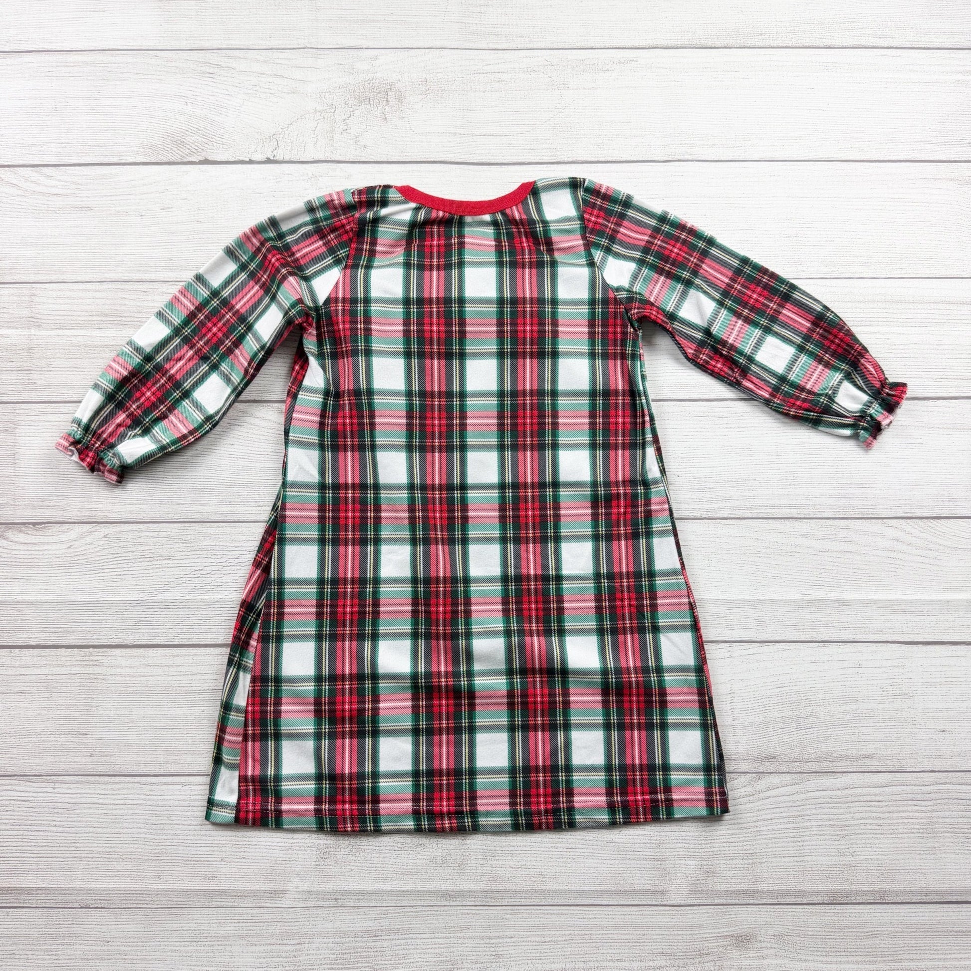 Red white green plaid long sleeve cozy holiday nightgown. Ruffle chest and button accents. Polyester
