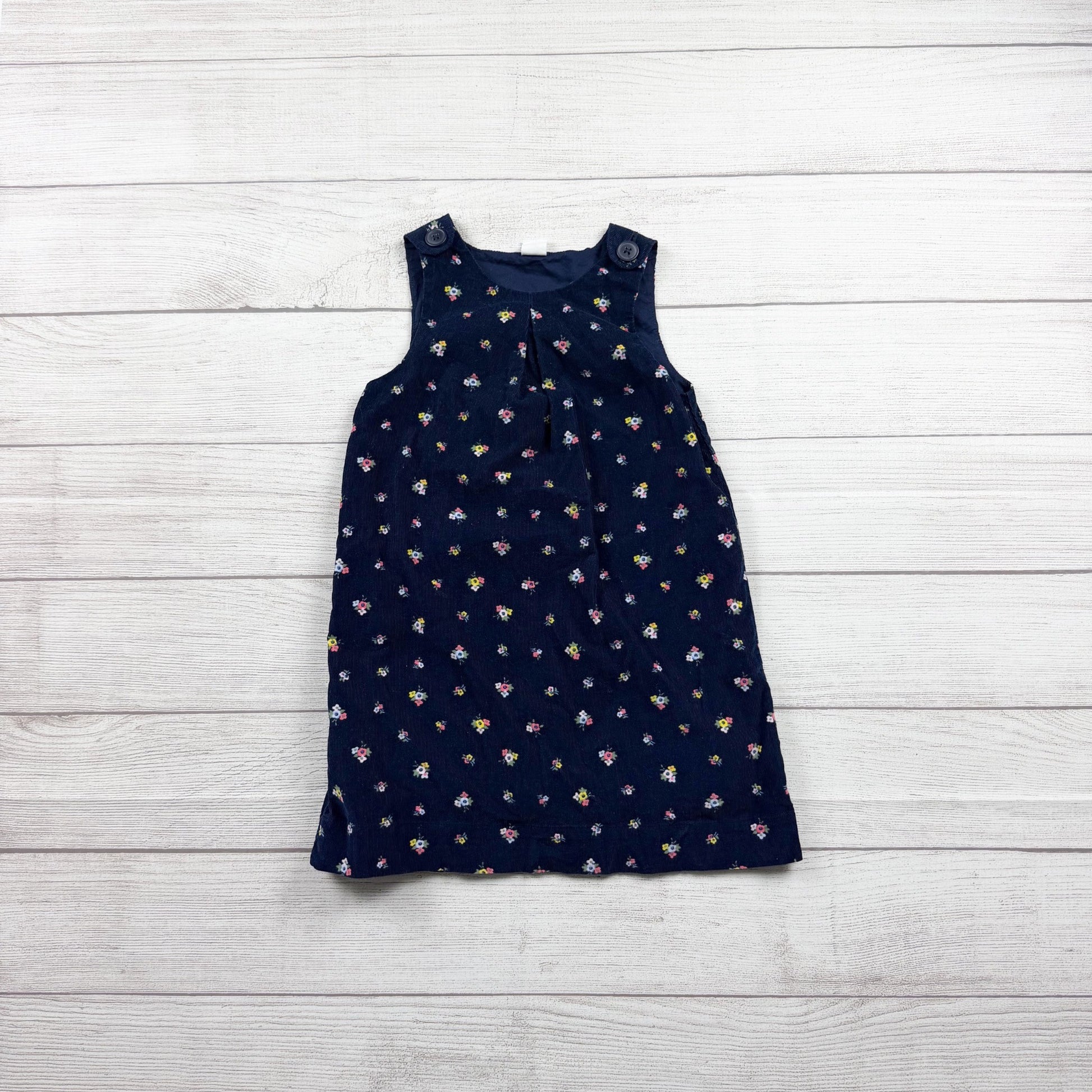 Blue sleeveless one piece corduroy floral flower print dress buttons at straps. Cotton
