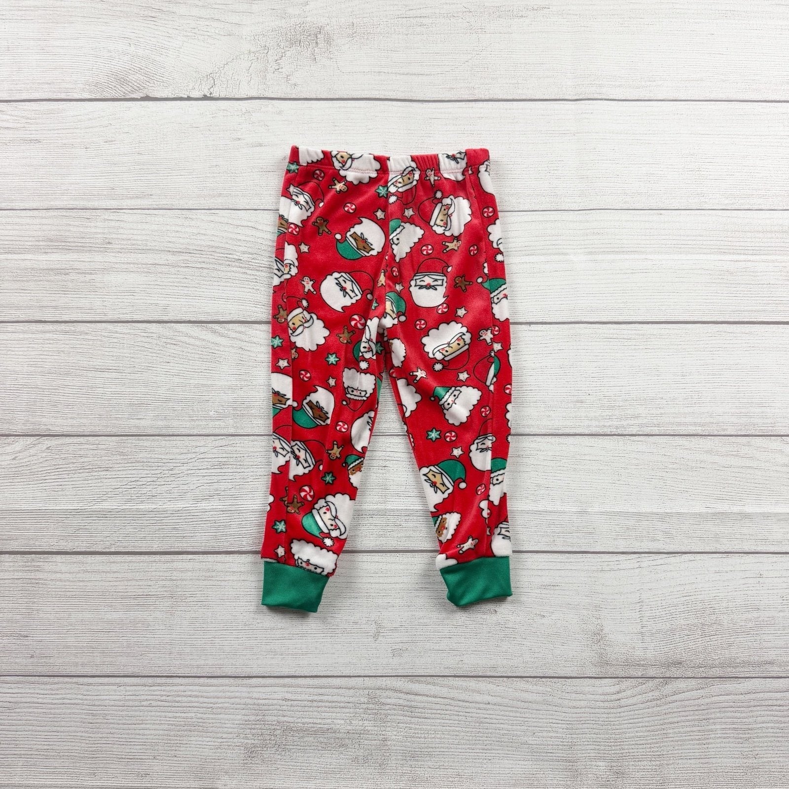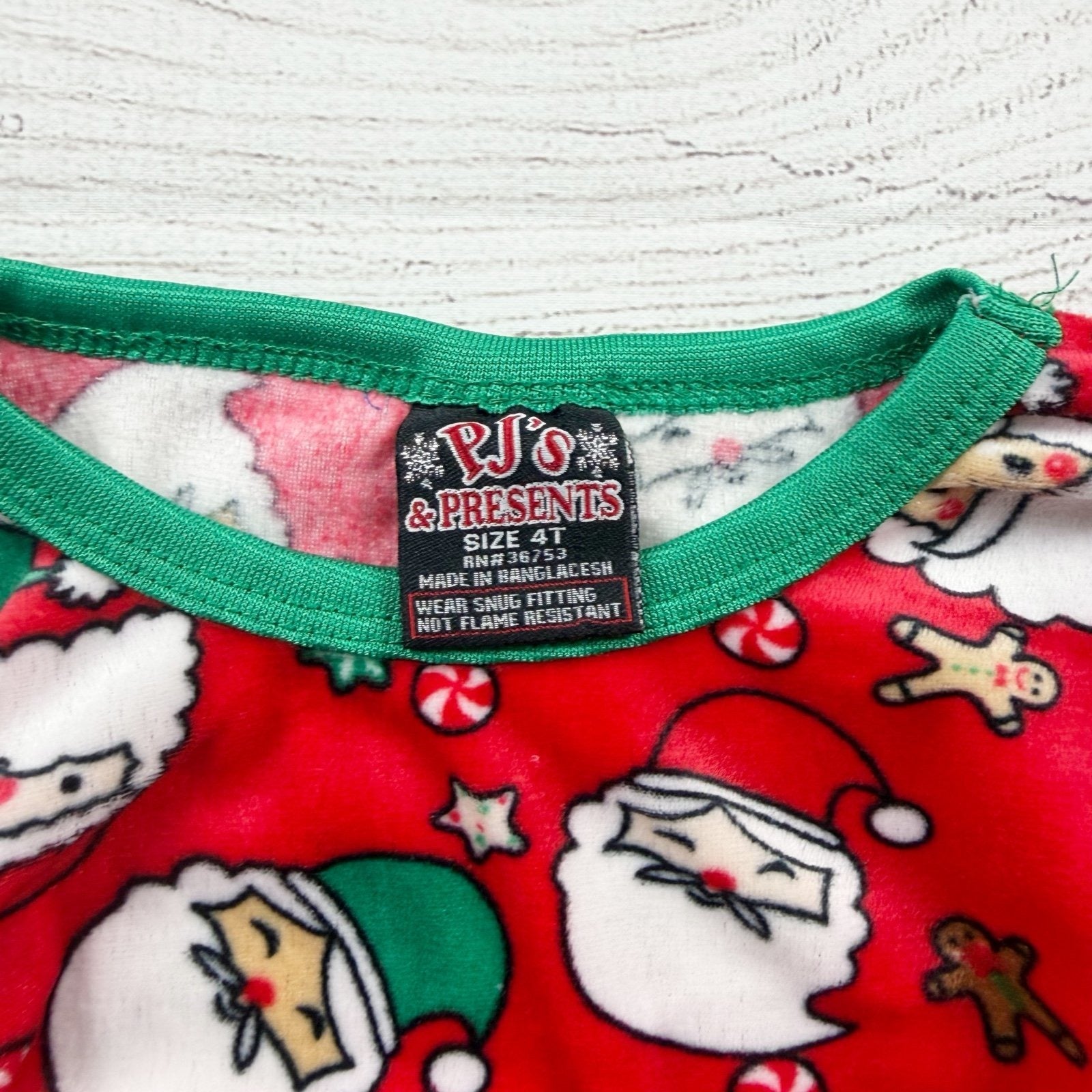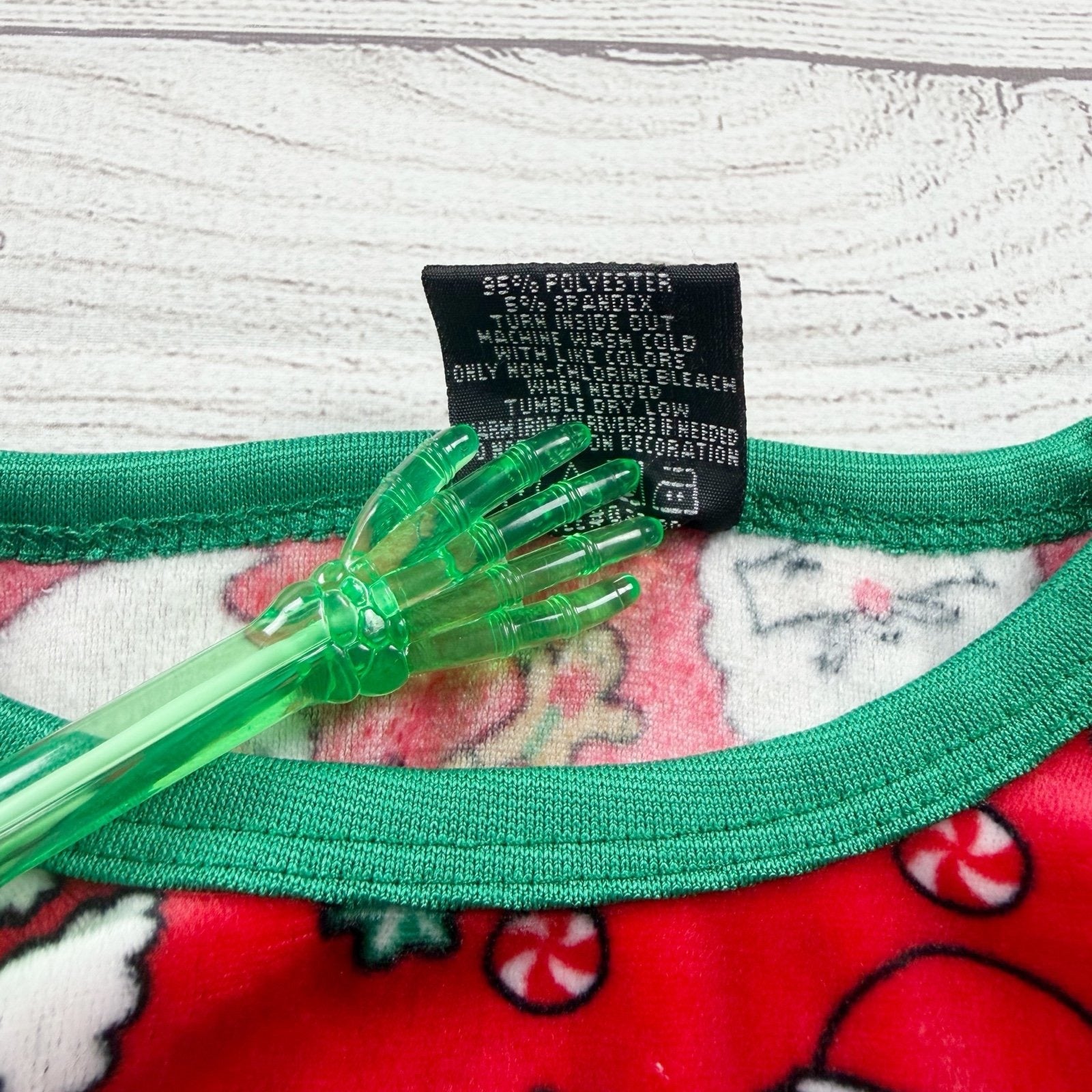 Red two piece long sleeve shirt and pants pajamas set with holiday print including Santa faces and candy. Polyester spandex blend