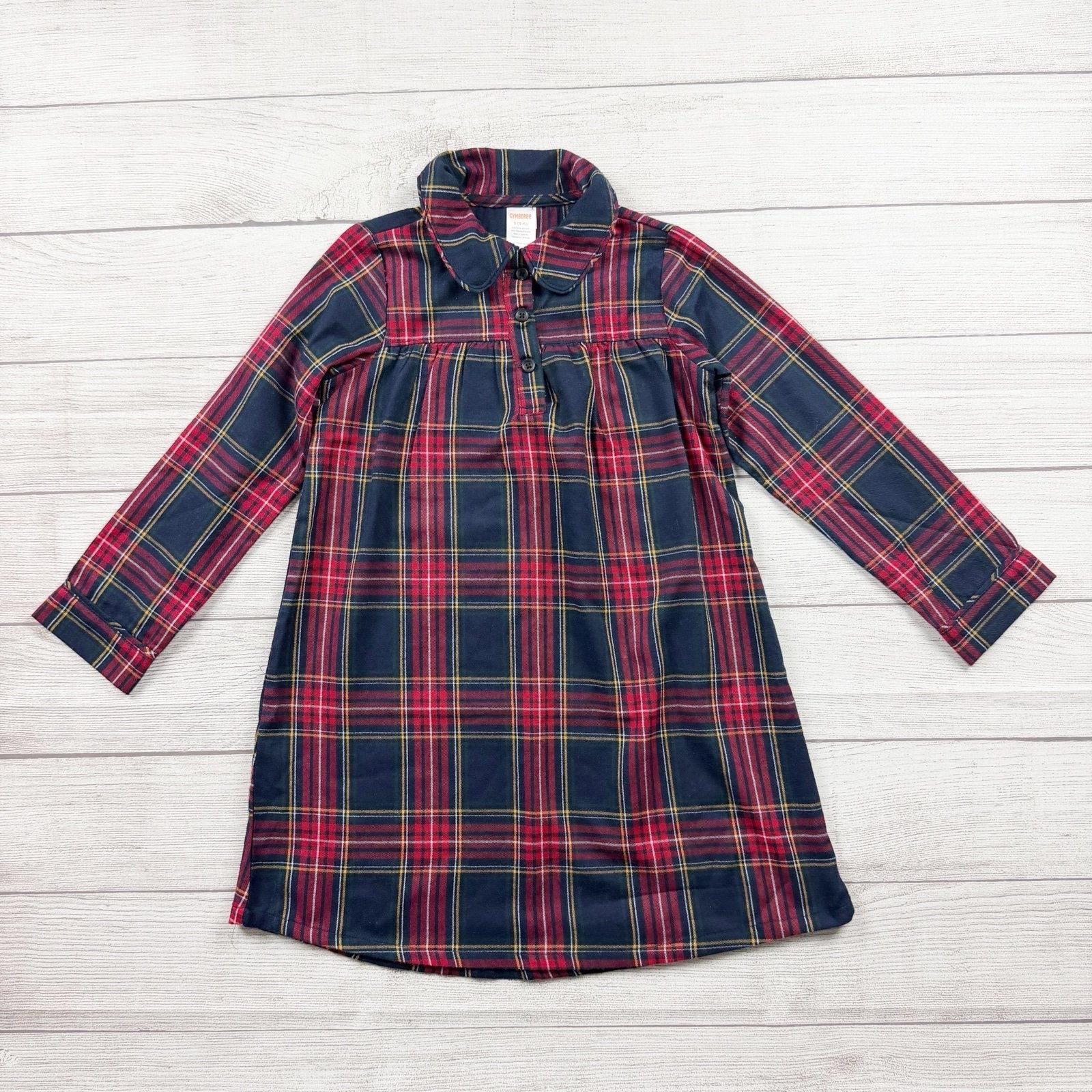 Colorful tartan plaid long sleeve nightgown with collar and buttons at chest. Polyester.