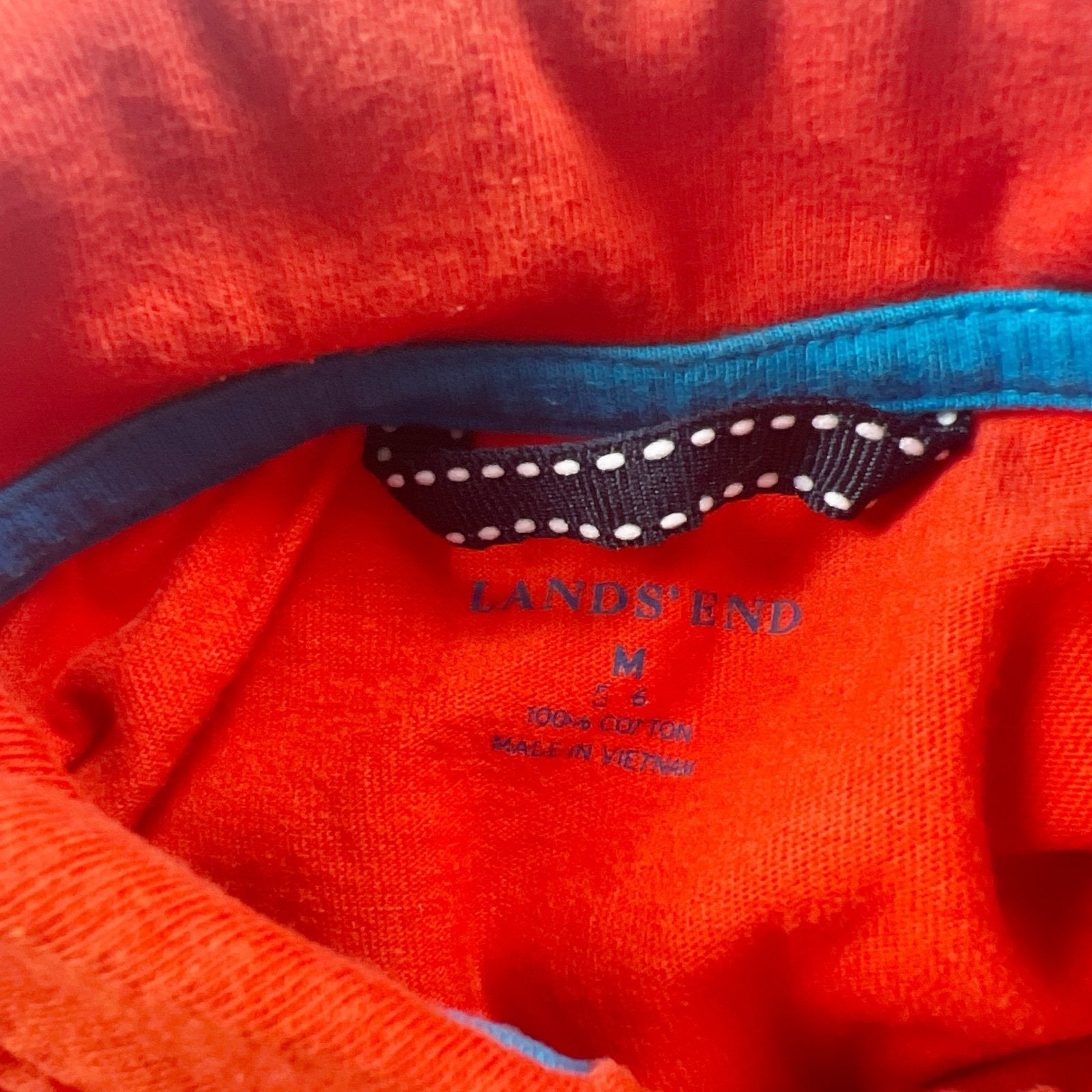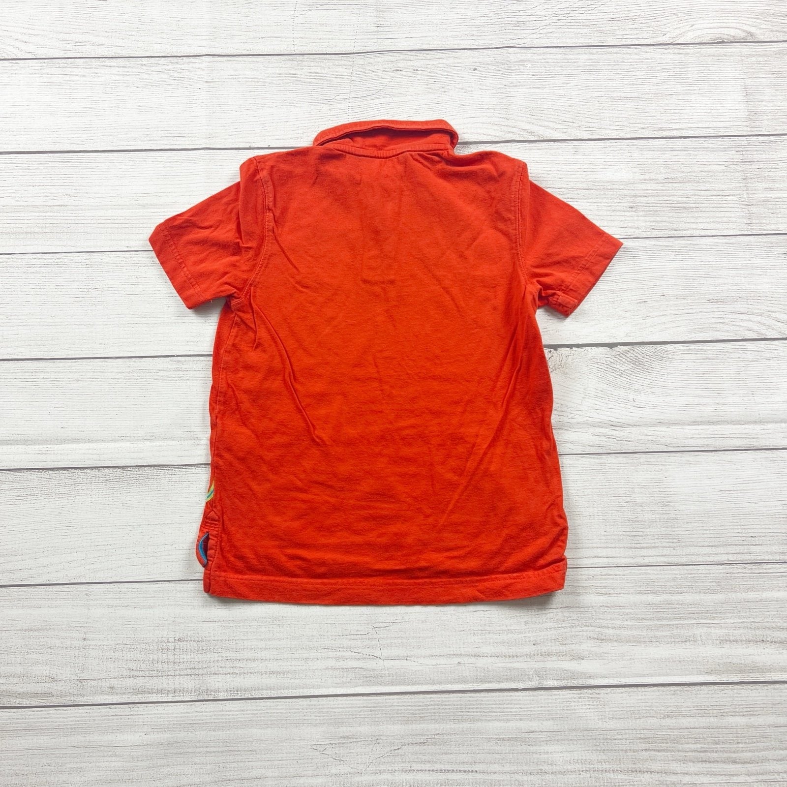 Orange short sleeve collared polo shirt with blue ray graphic. Cotton