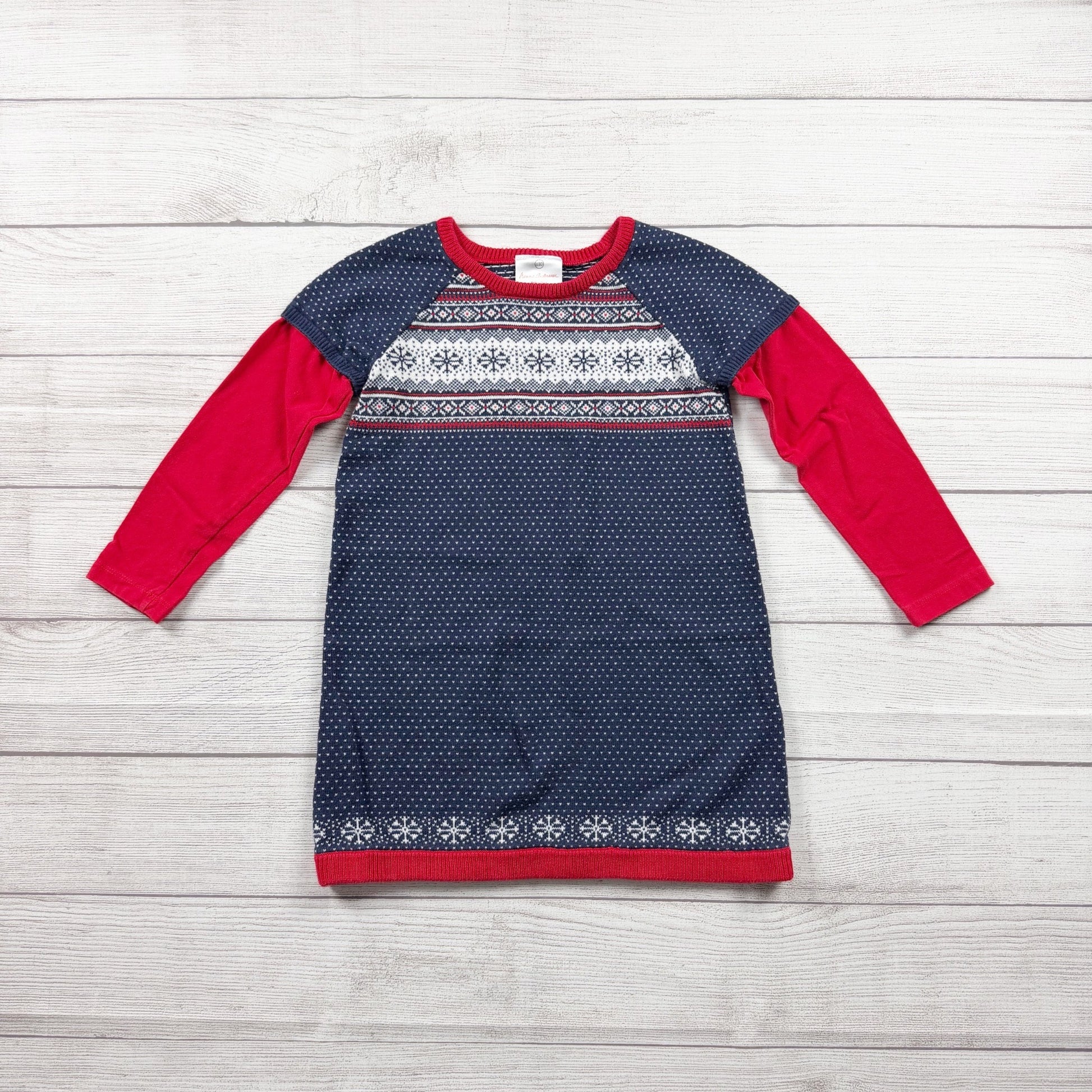 Blue short sleeve sweater dress with red long sleeve layer. Fairisle. Cotton