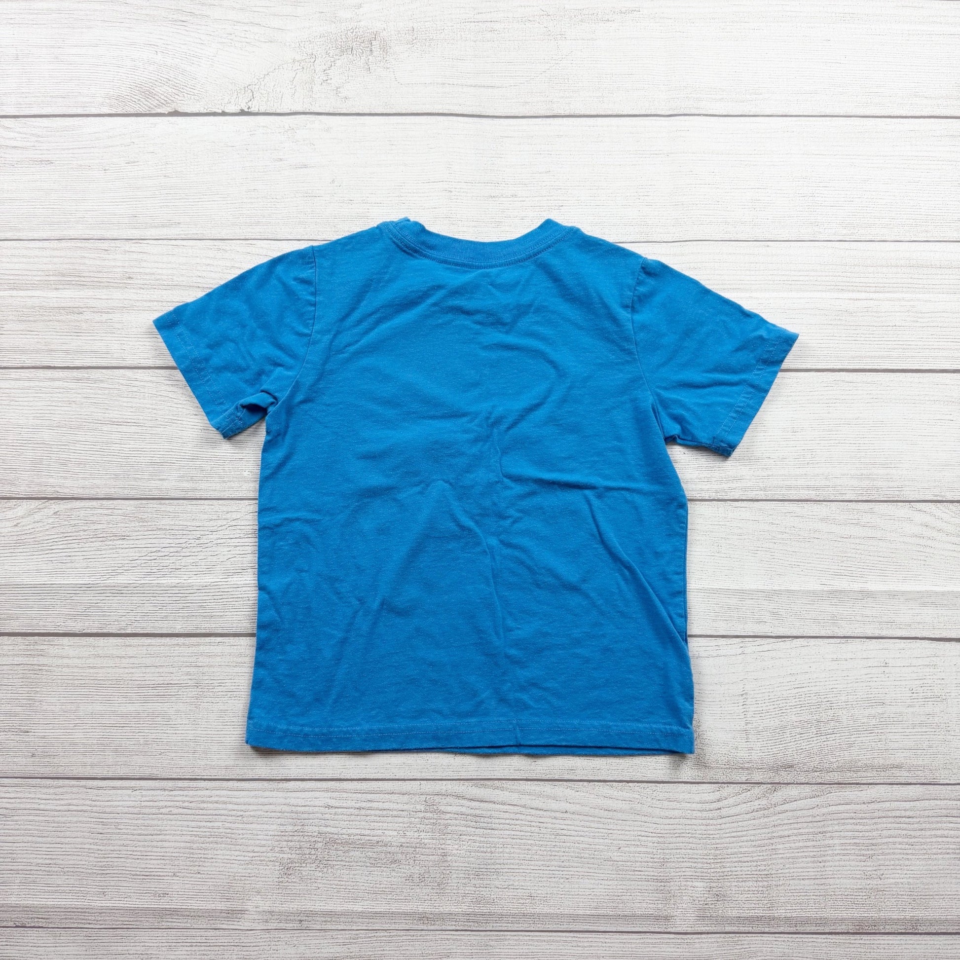 Blue short sleeve shirt with superhero graphic. Cotton polyester blend