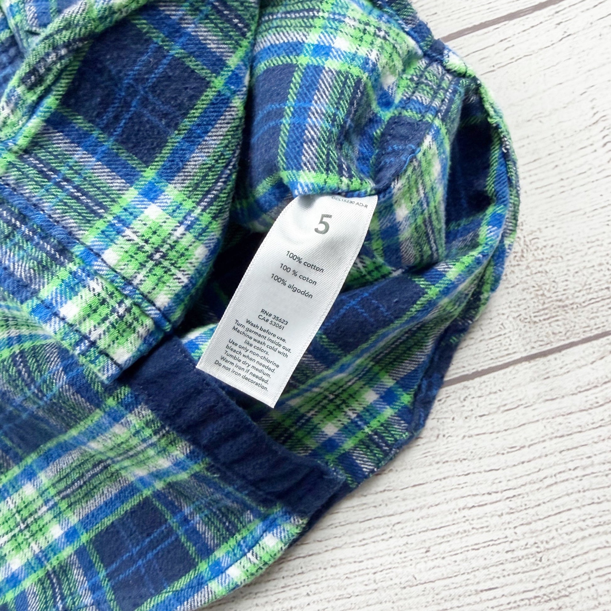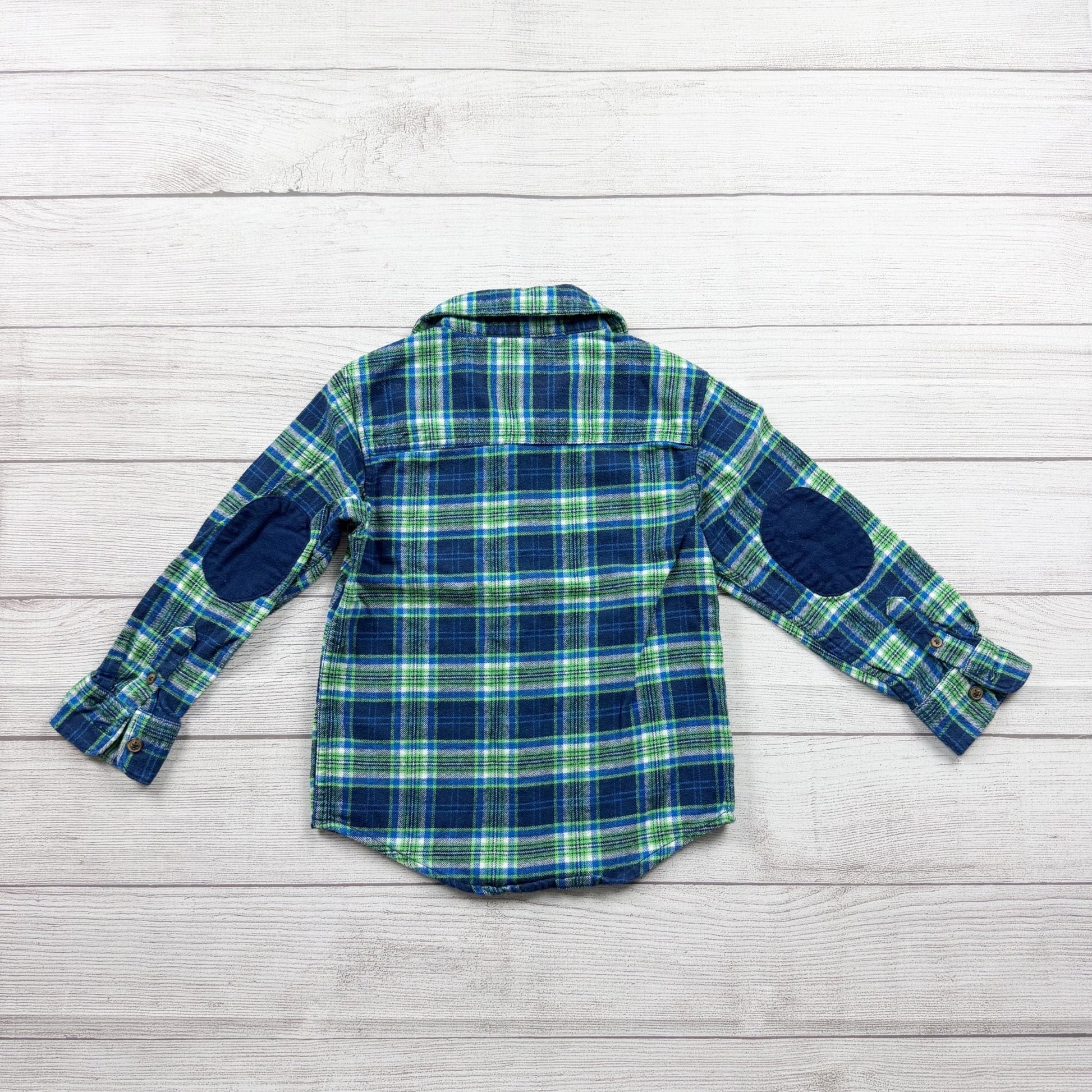 Blue and green plaid flannel long sleeve collared buttoned shirt. Blue elbow patches. Cotton
