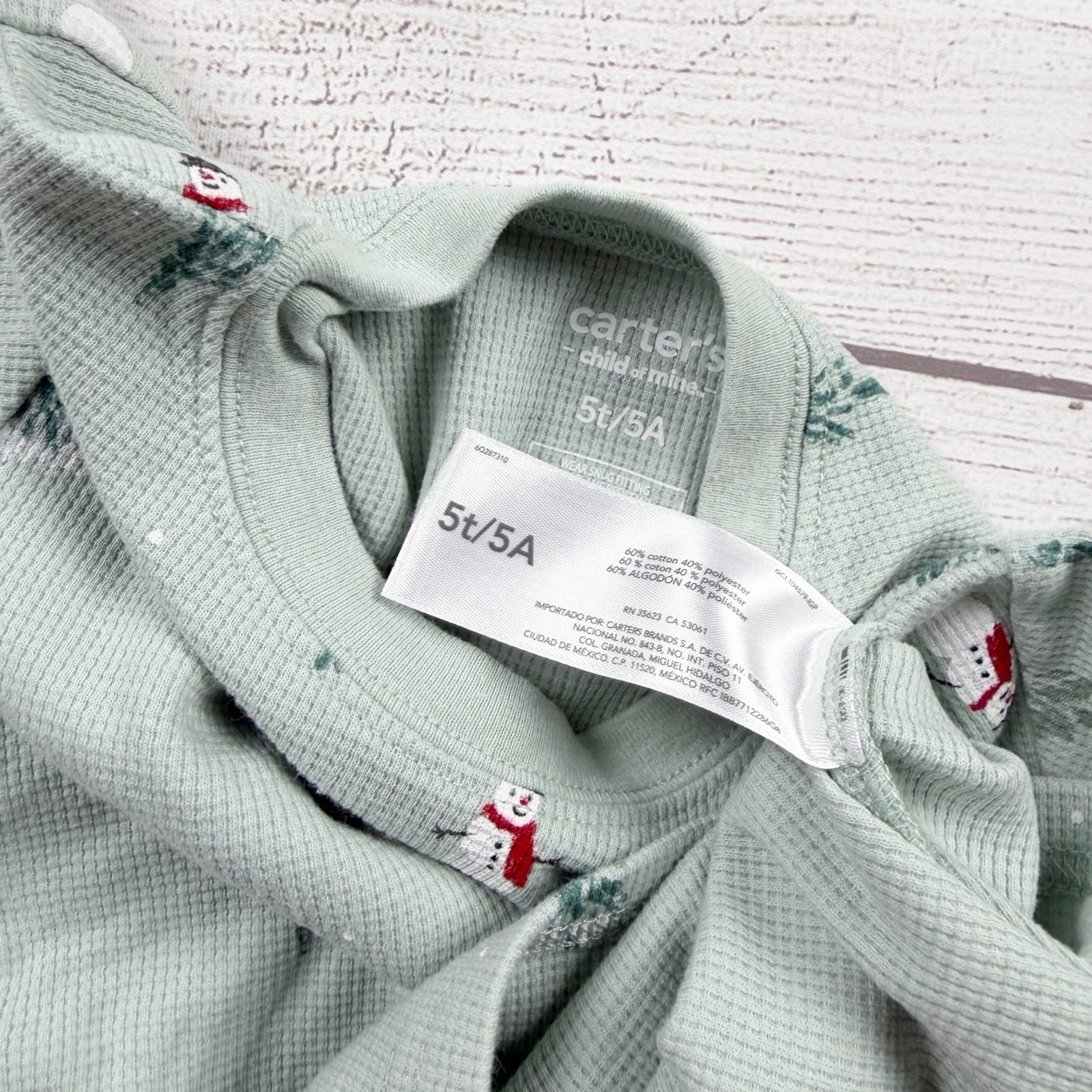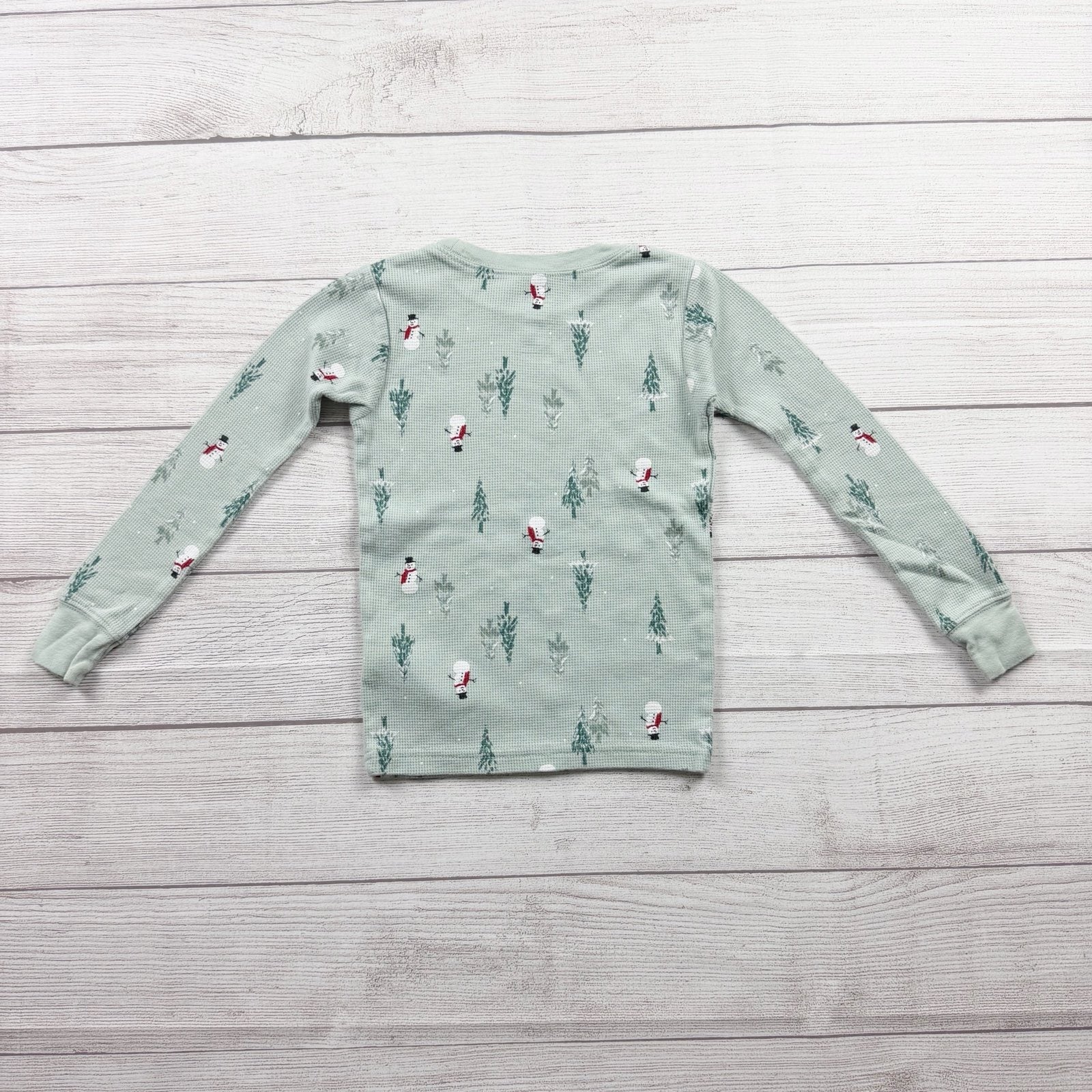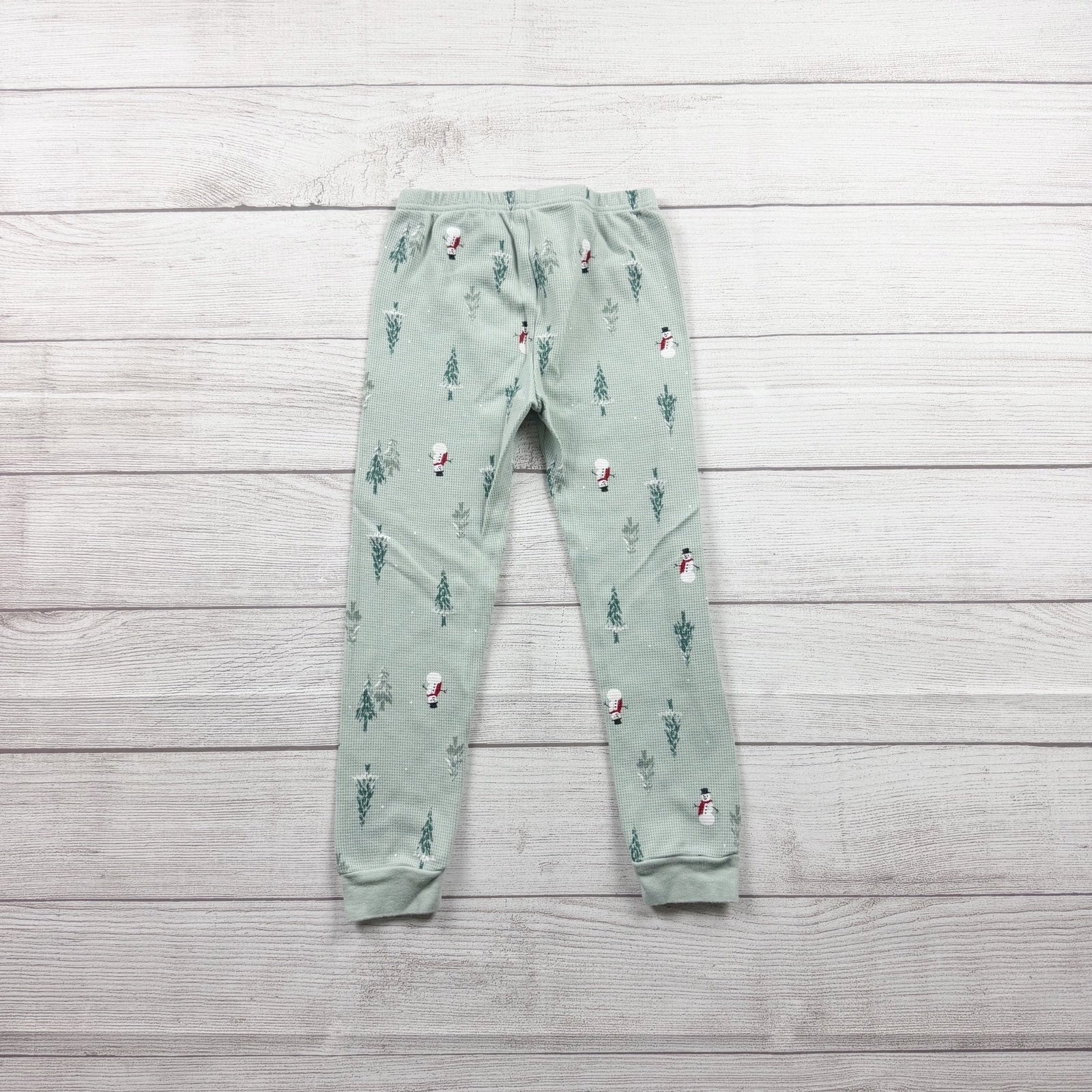 Two piece pajamas set. Mint waffle long sleeve shirt and long pants with snowman and trees print. Cotton polyester blend