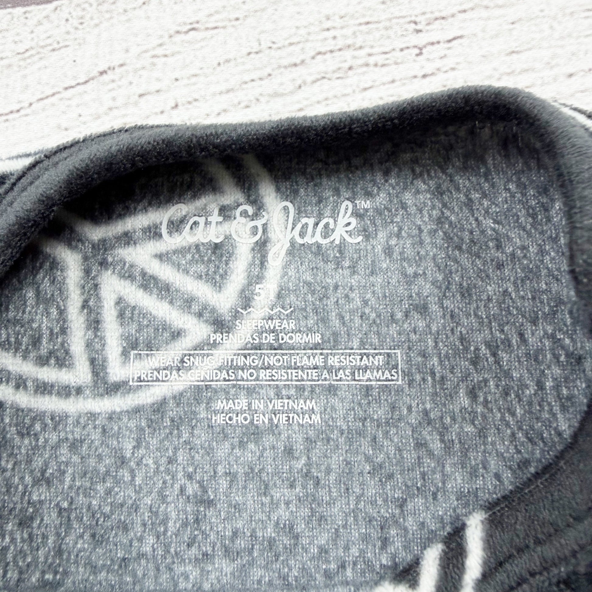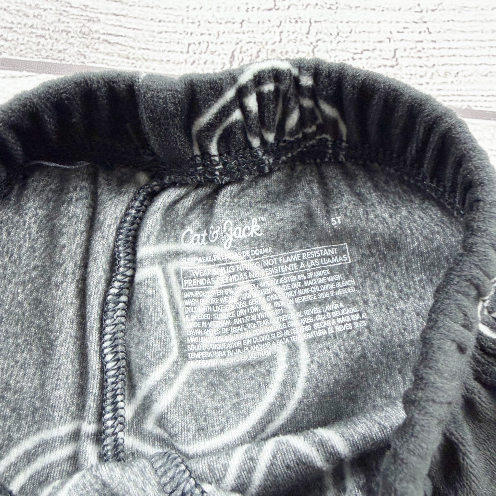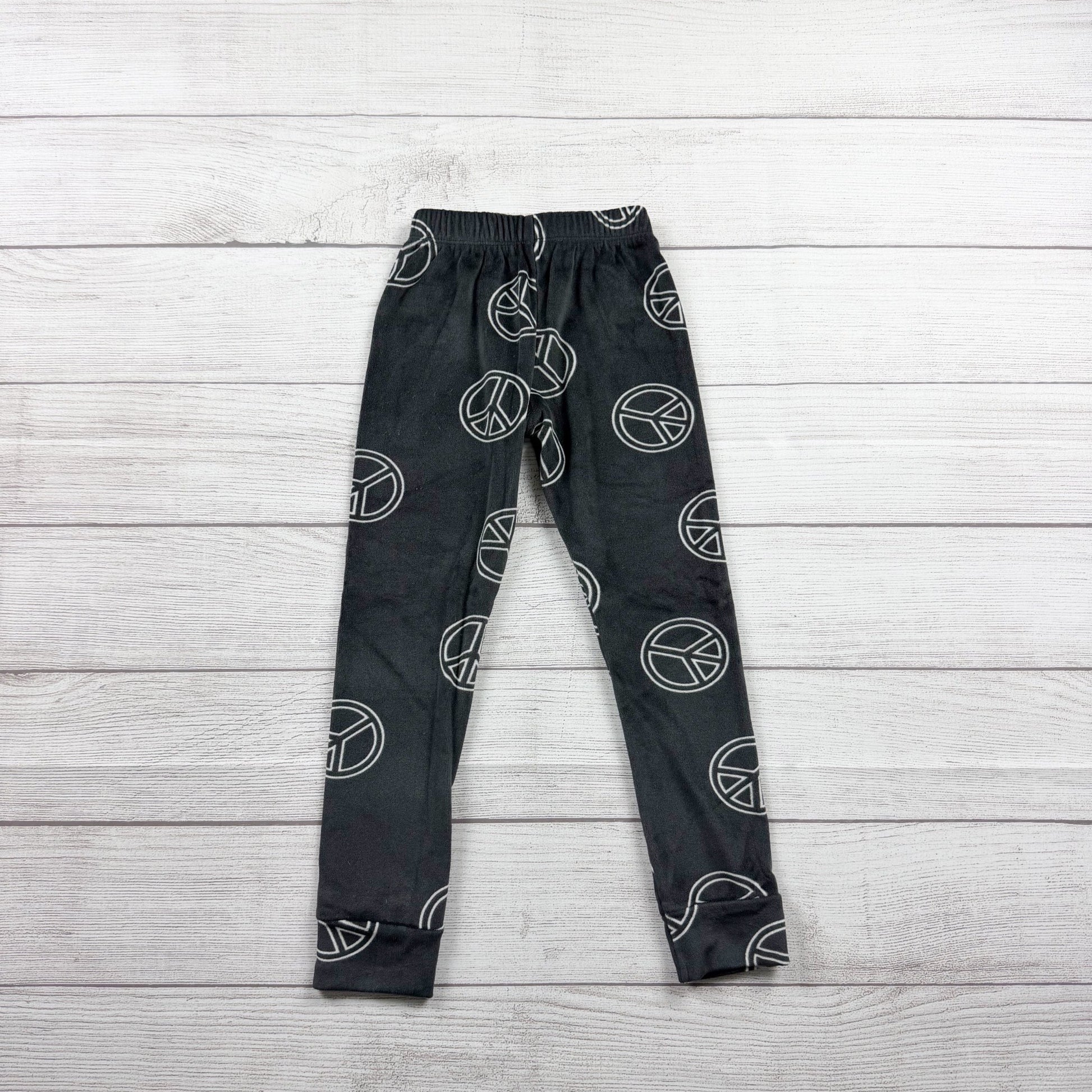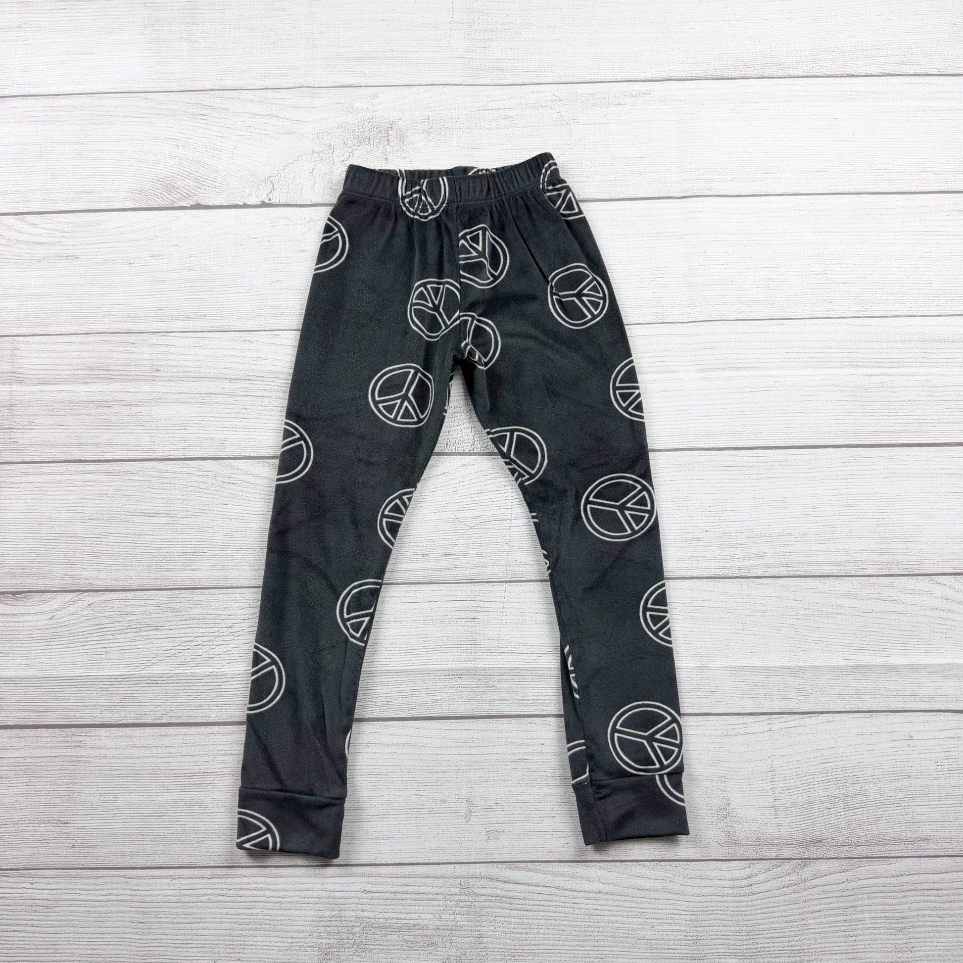 Black long sleeve shirt and long pants snuggly soft fleece pajamas with peace sign print. Polyester