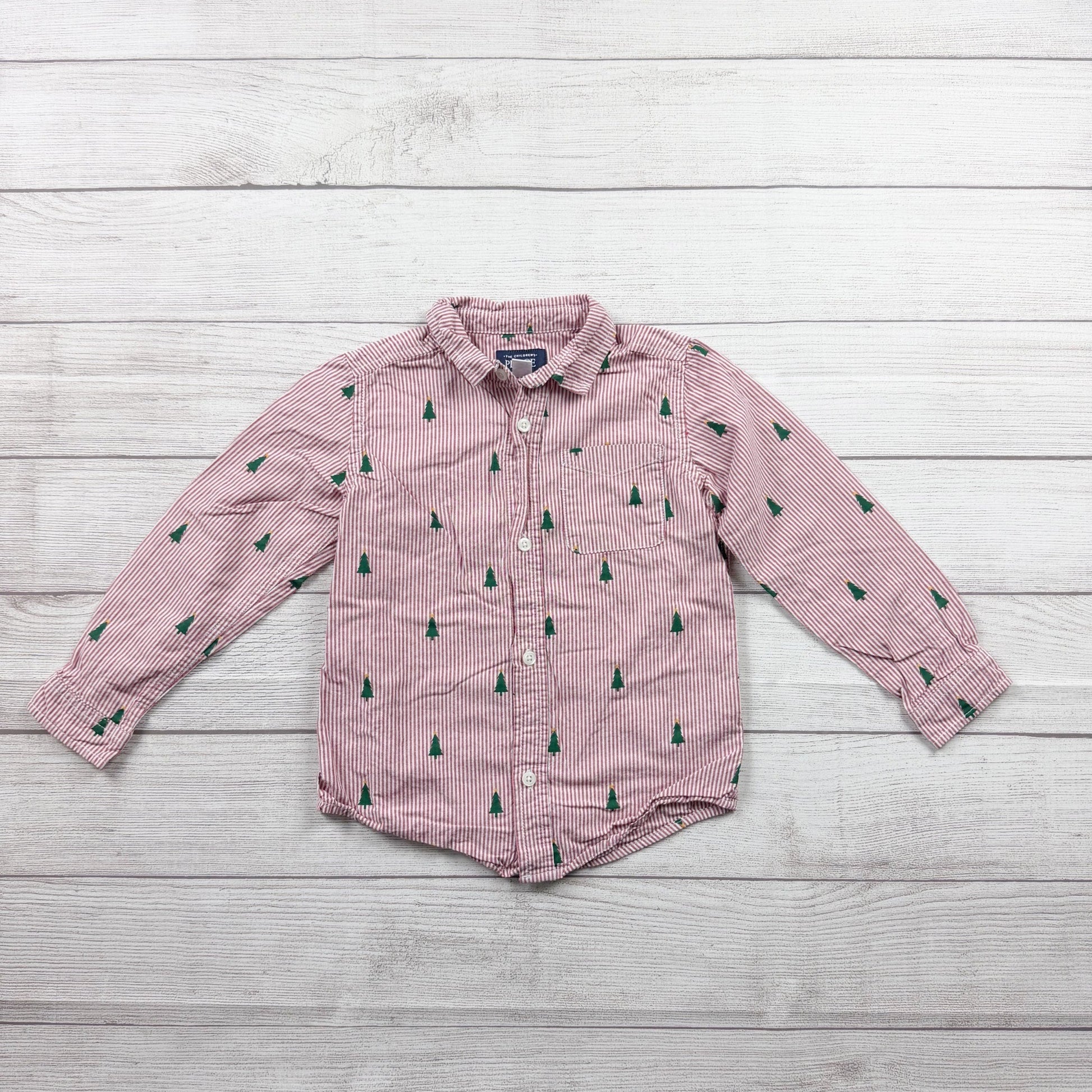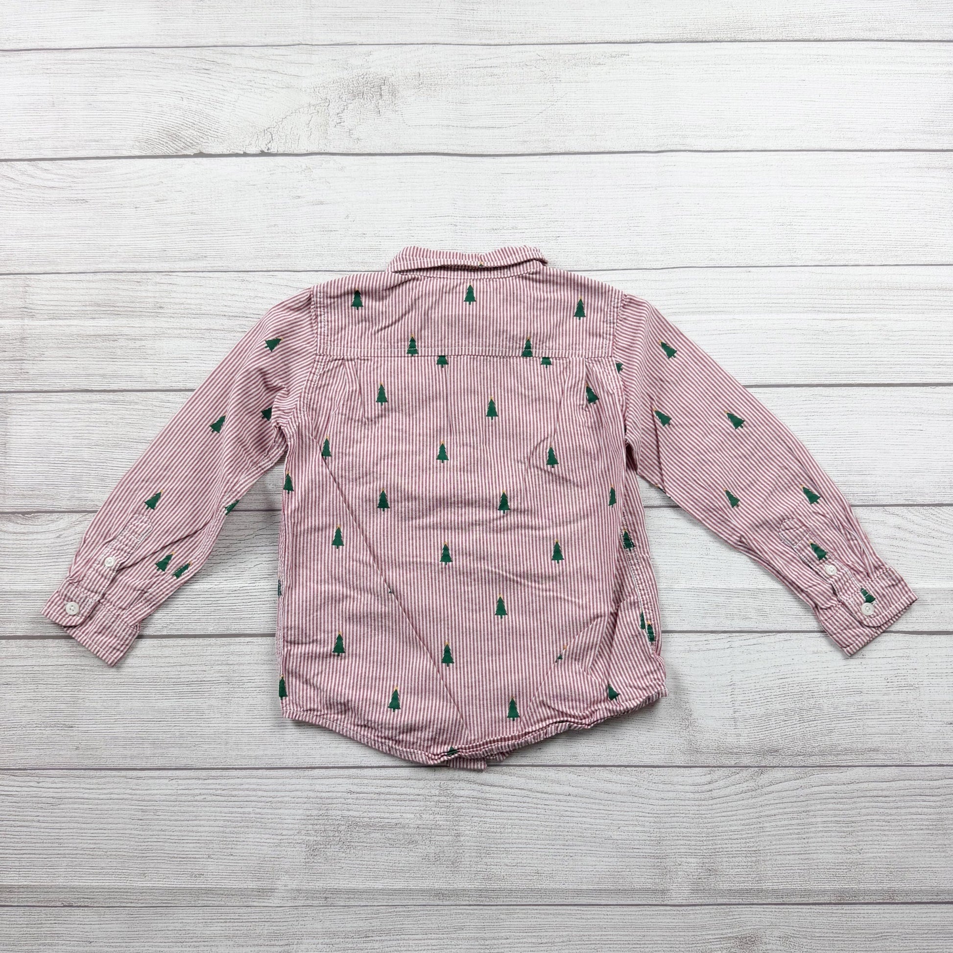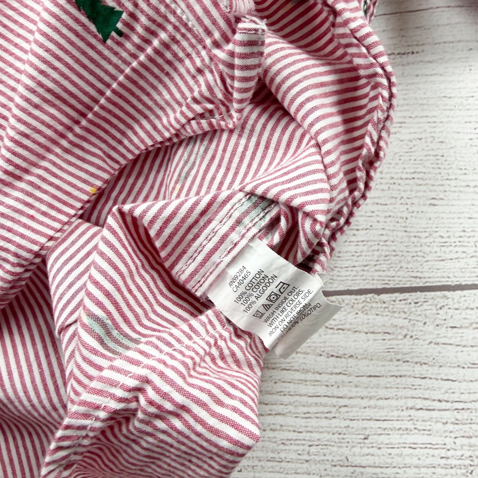 Red and white stripe long sleeve buttoned collared shirt. Christmas holiday tree print. Cotton.