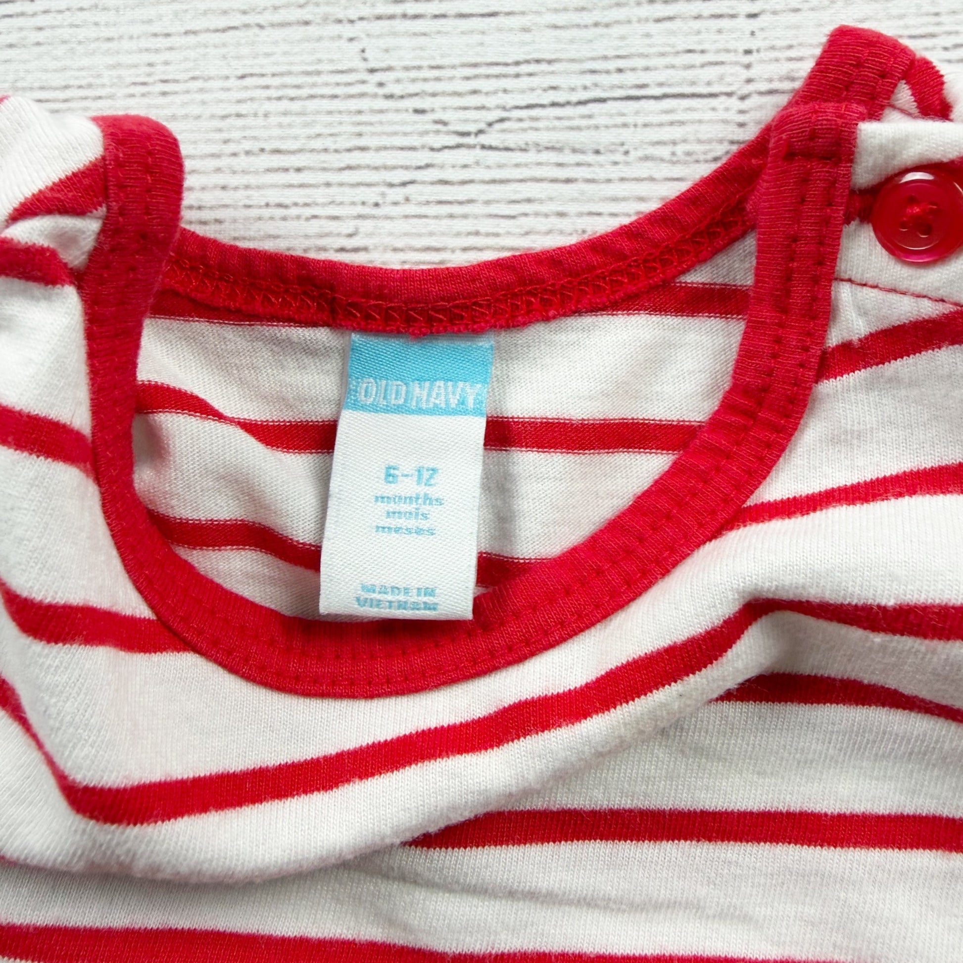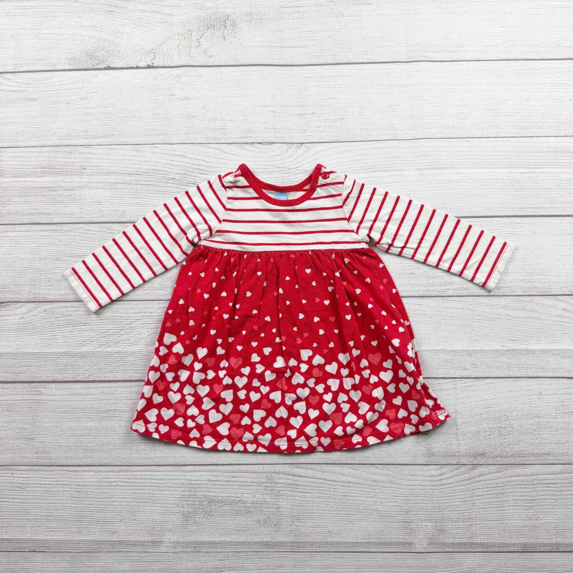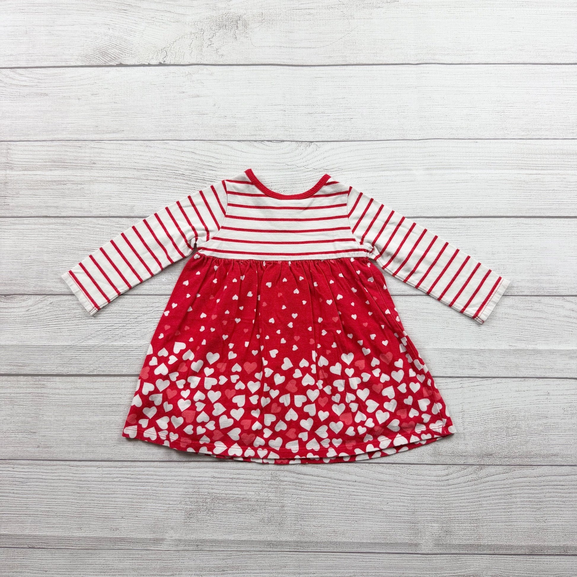 Red and white stripe long sleeve dress with hearts at bottom. Buttons at shoulder. Cotton modal blend