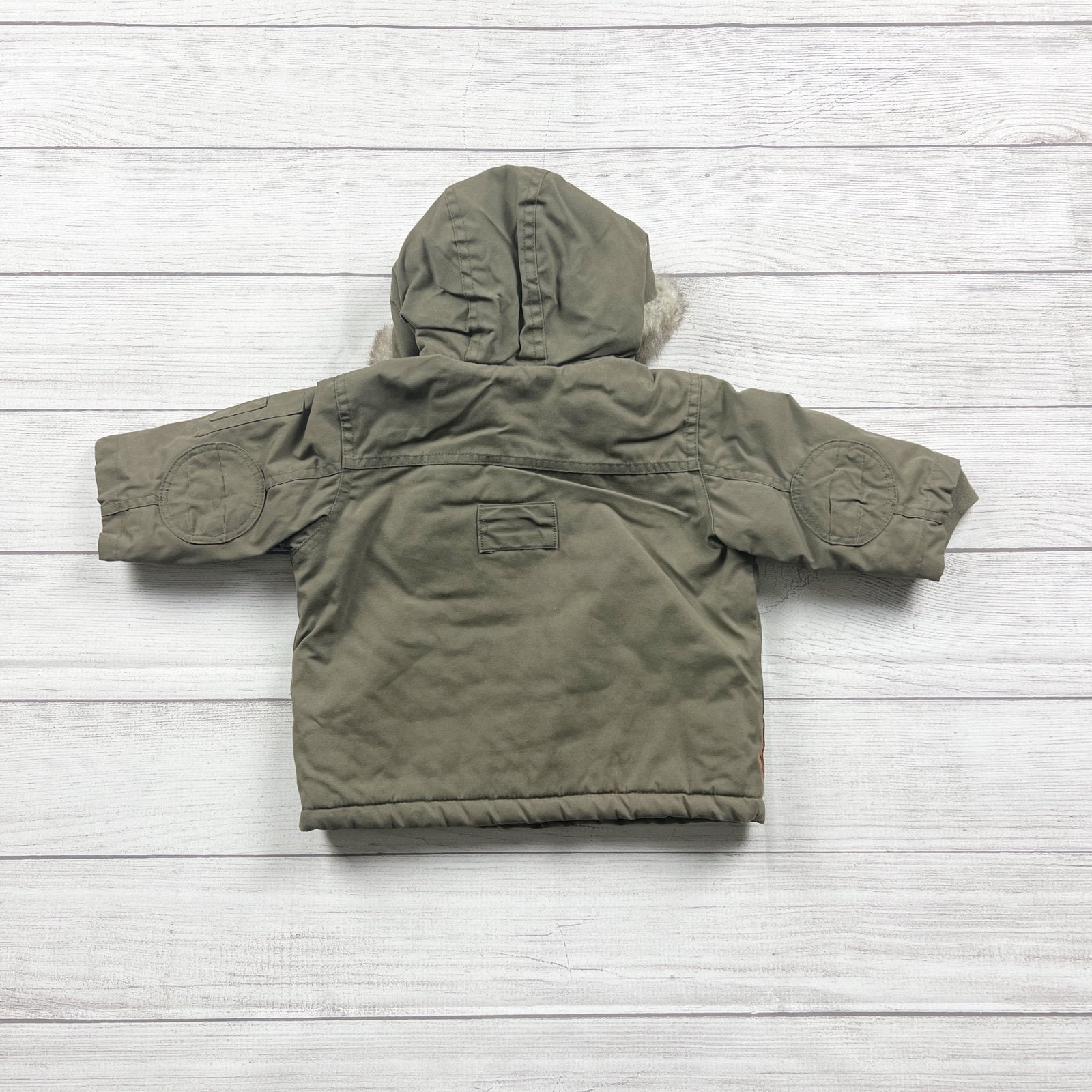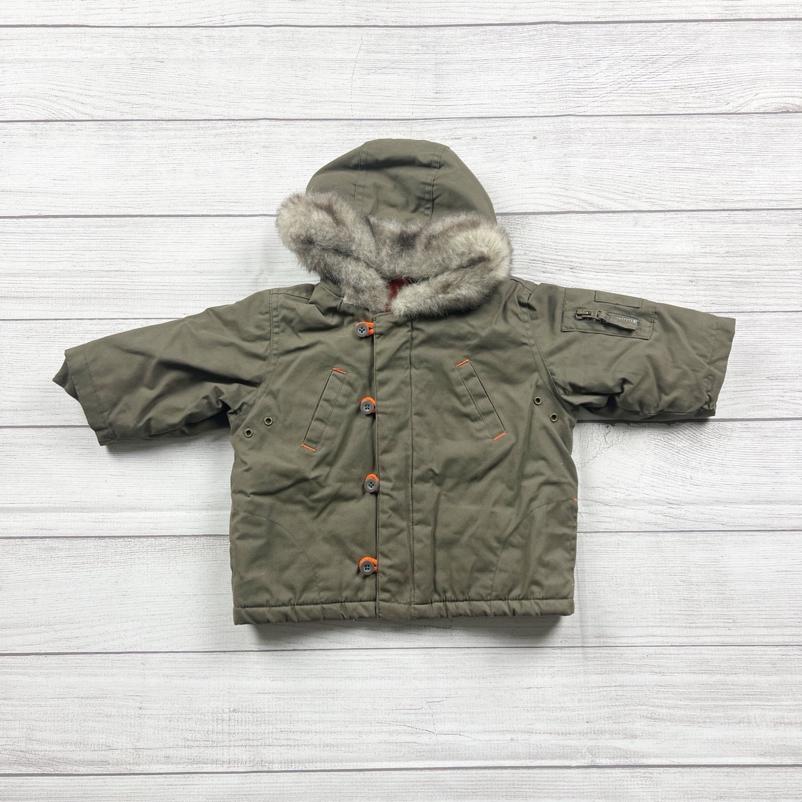 Solid green long sleeve zip hooded coat jacket with orange fleece lining. Faux fur trim hood. Vintage 2002