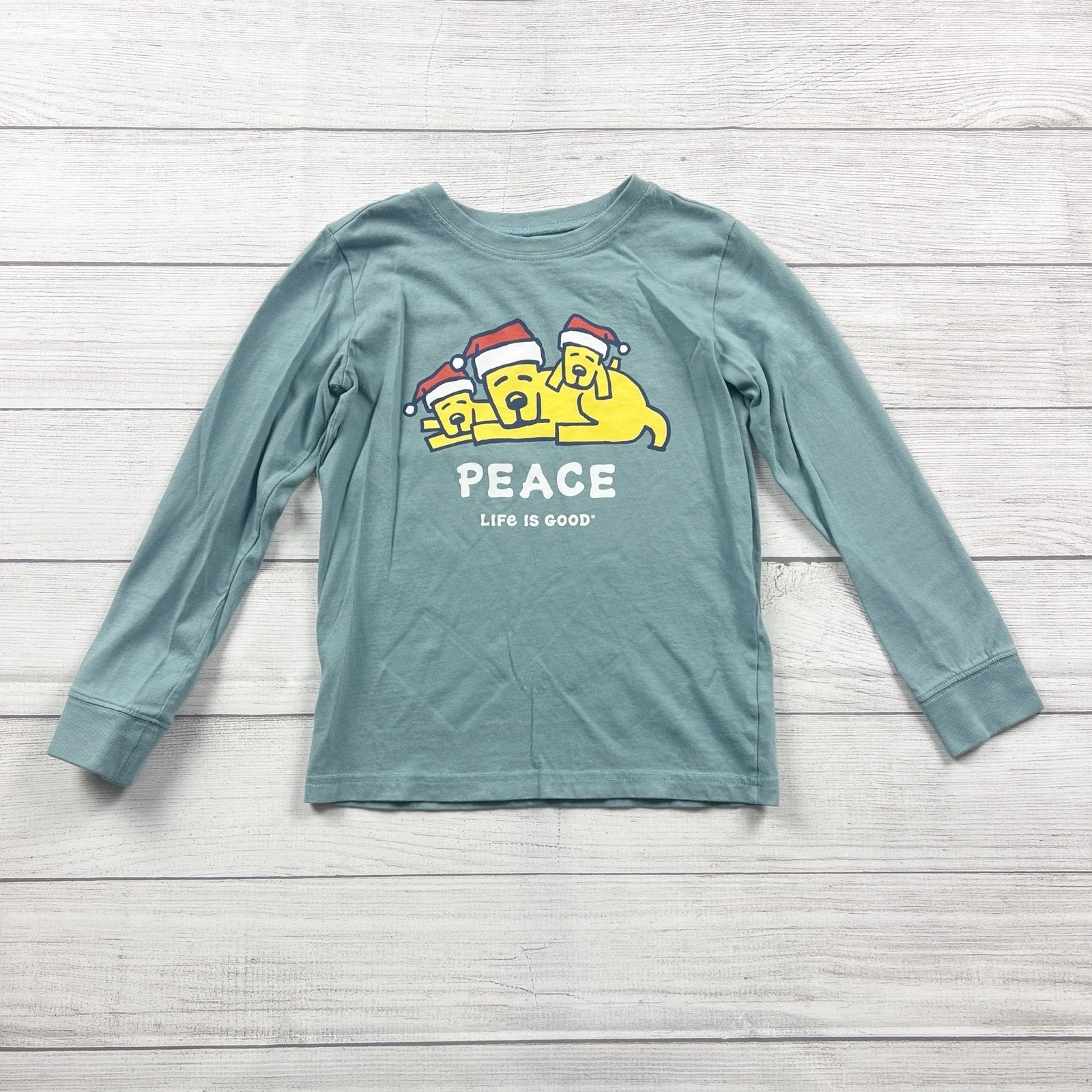 Long sleeve shirt with PEACE Santa hat dog graphic. Cotton