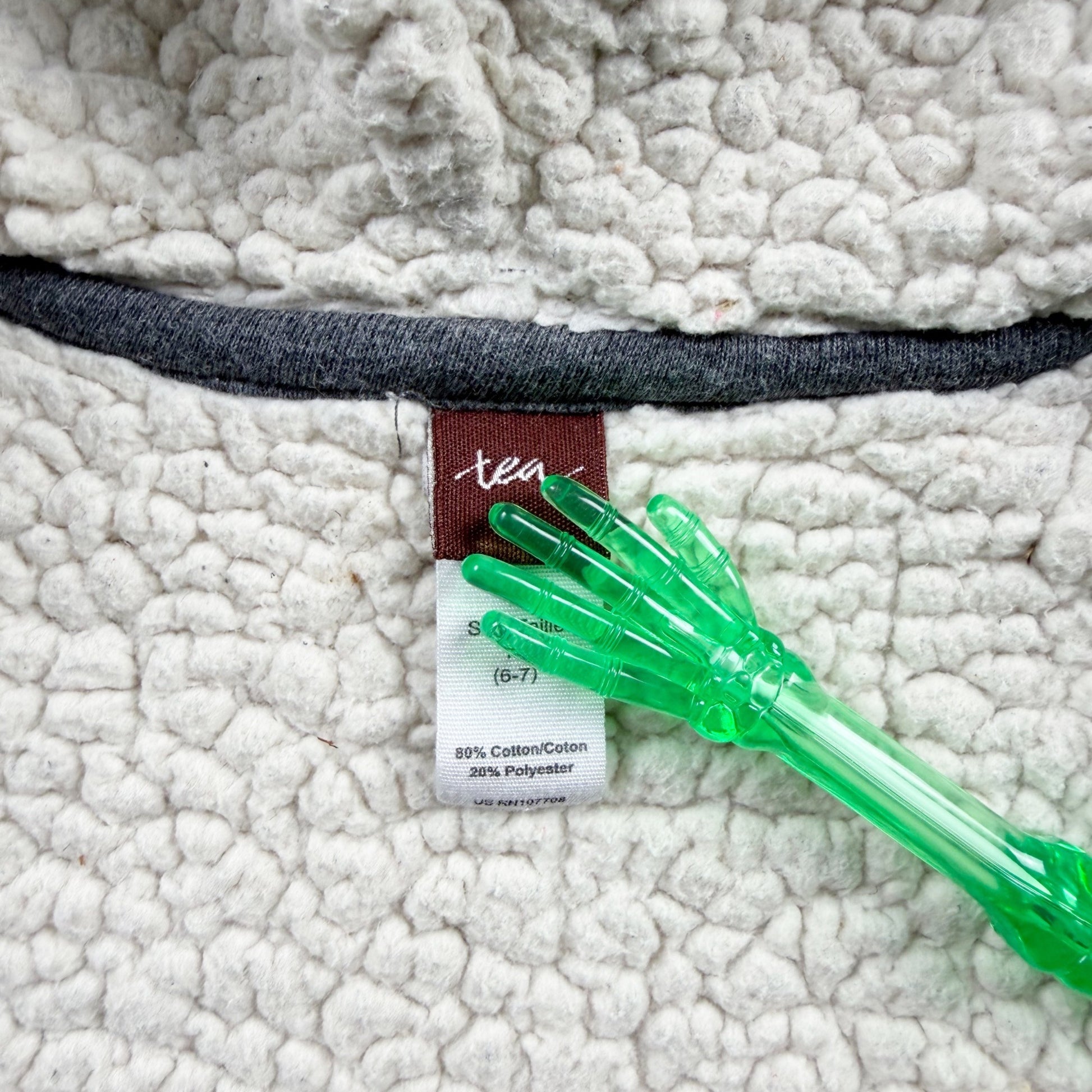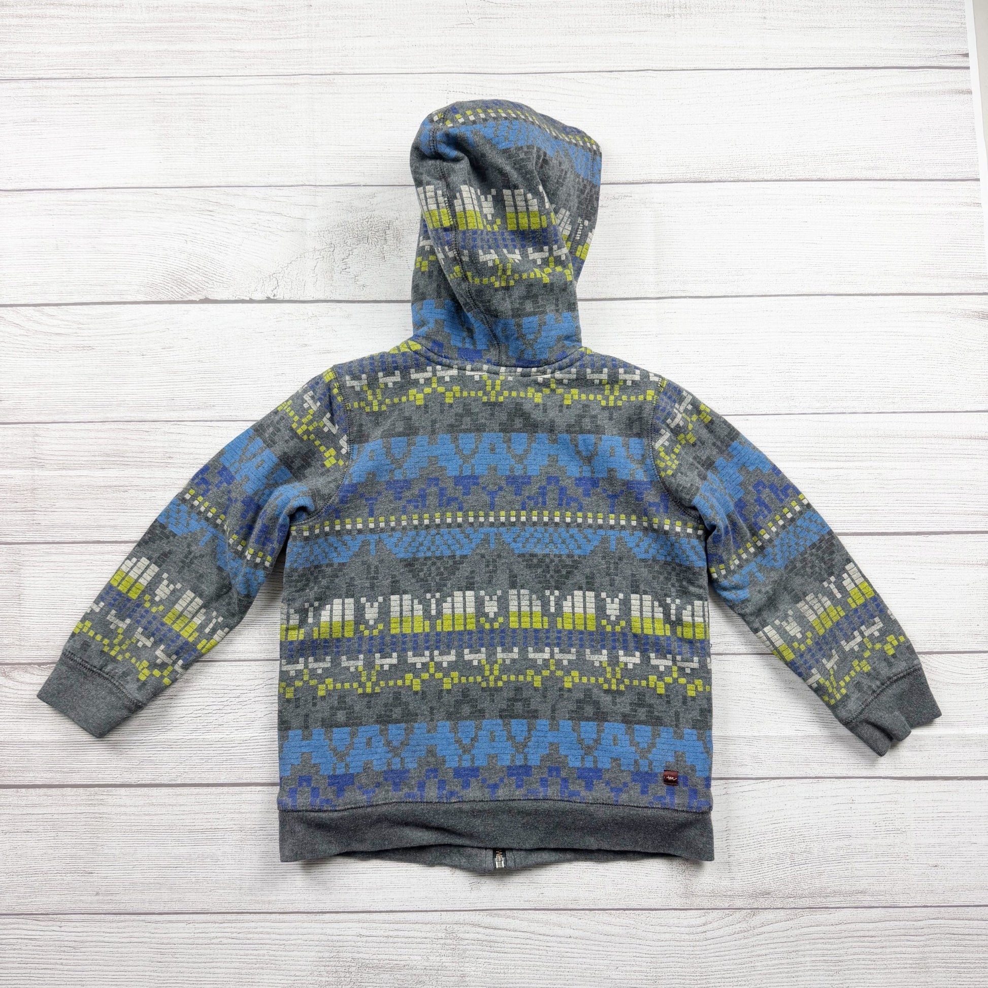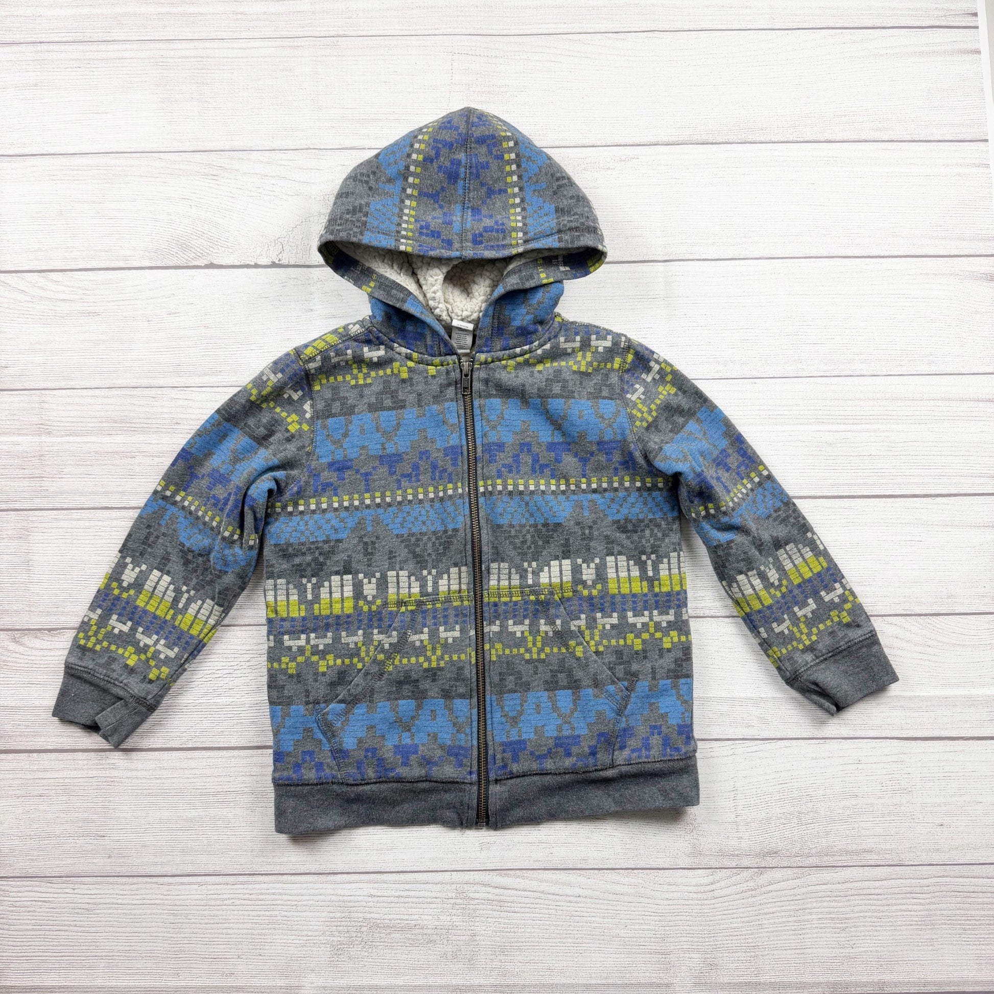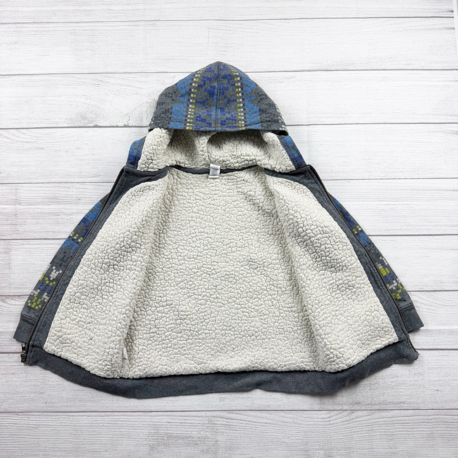 Grey gray long sleeve full zip hooded sweatshirt jacket with Sherpa fleece lining throughout. Colorful geometric print. Cotton Polyester