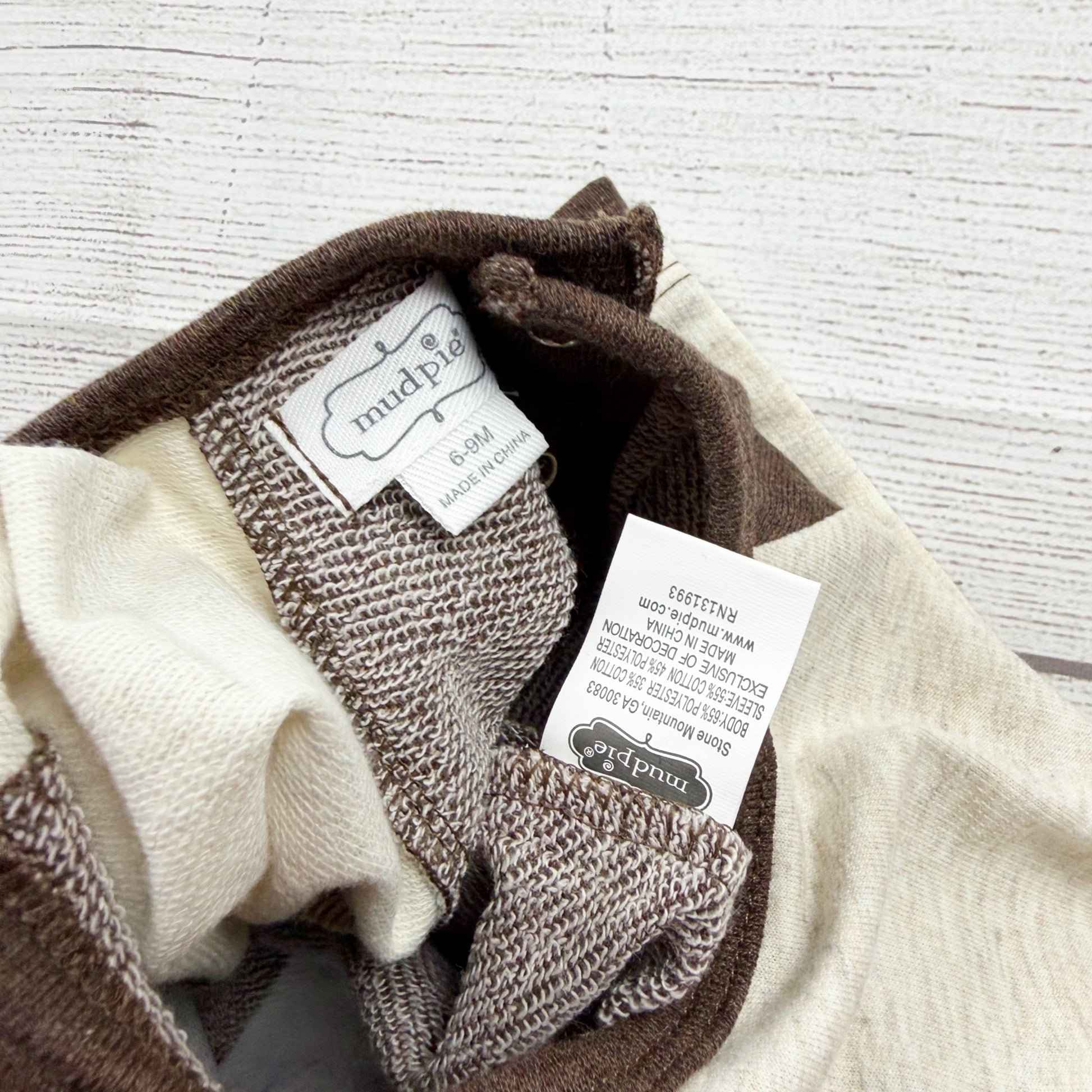 Brown raglan long sleeve and pants one piece romper with snaps at back. Turkey football appliqué. Cotton blend