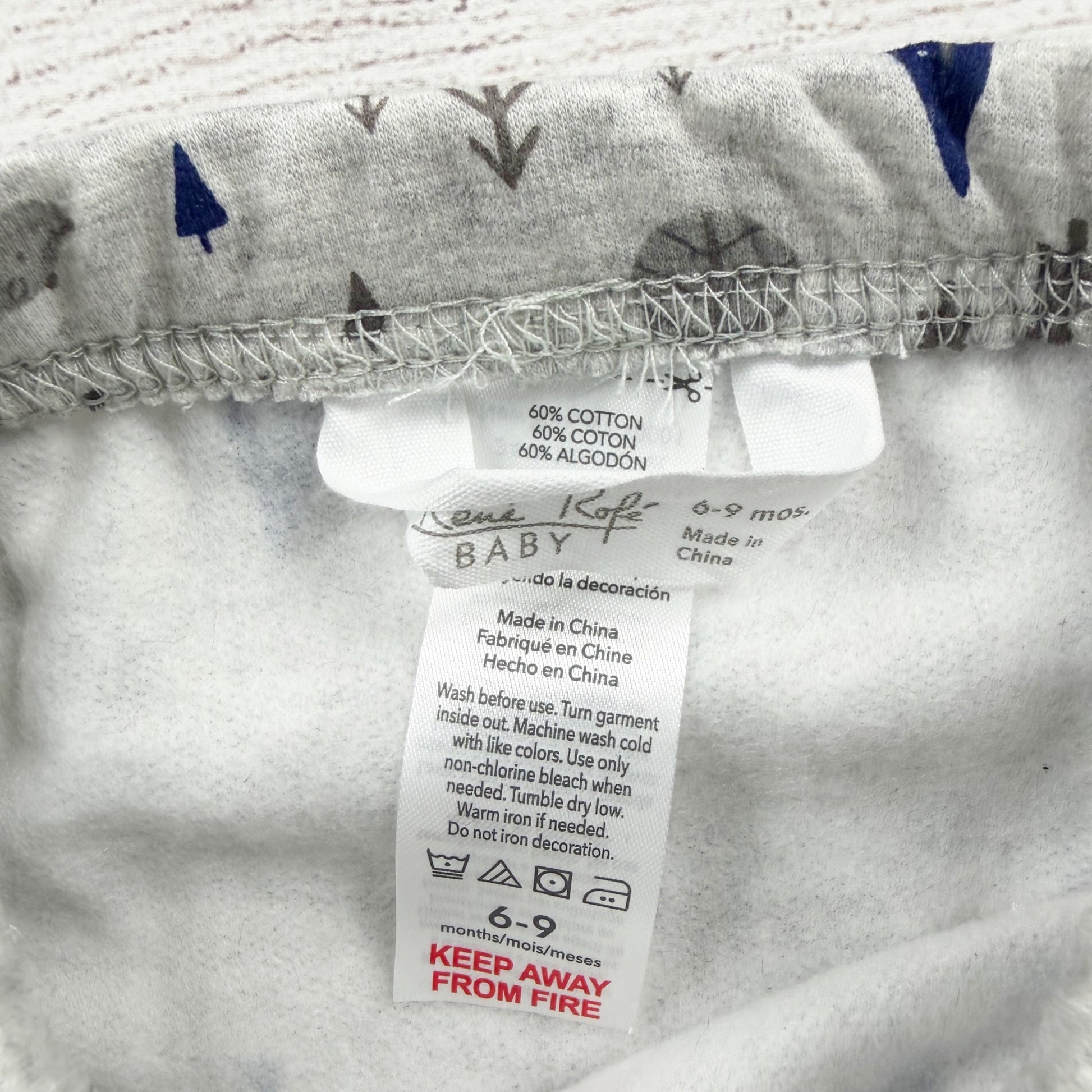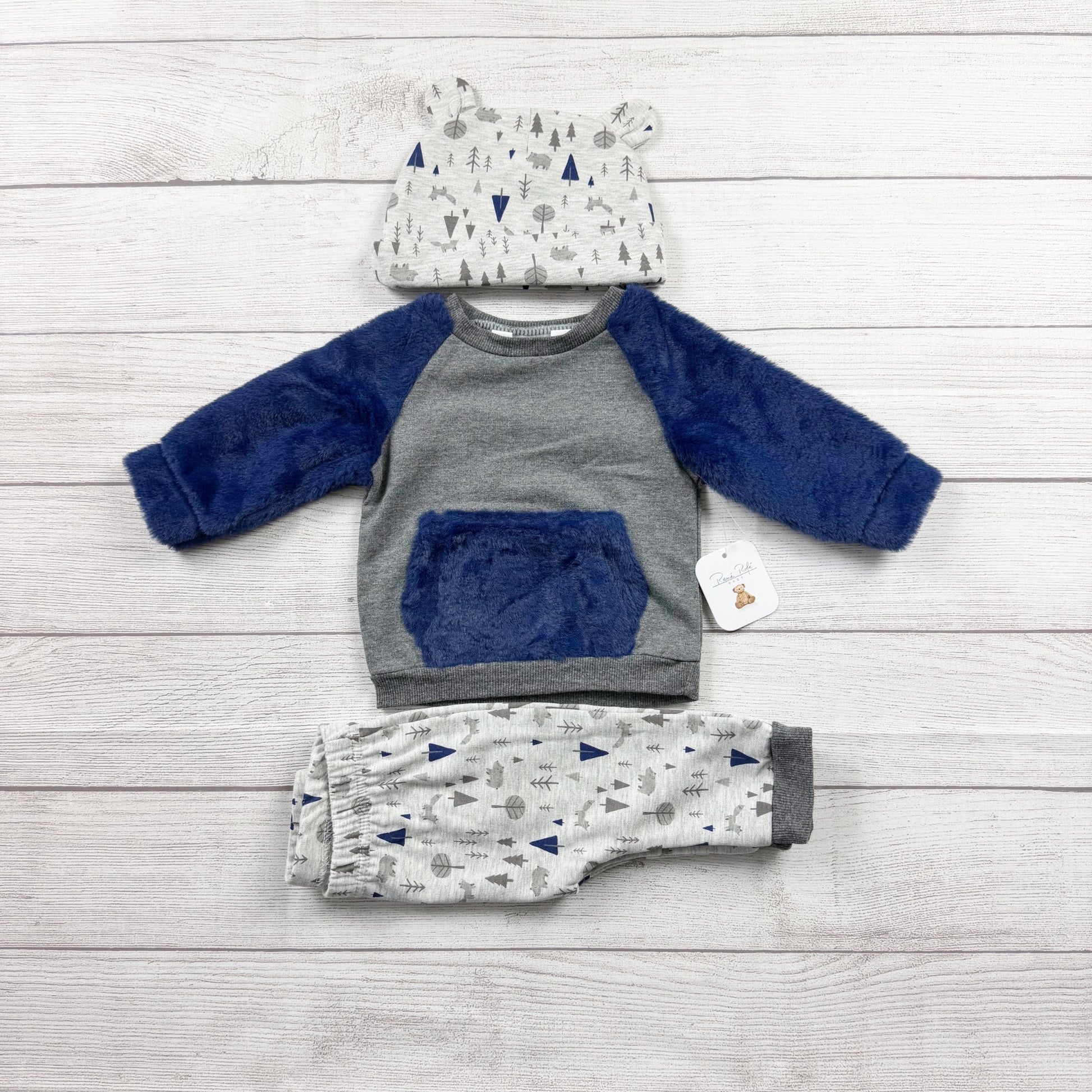 Three piece outfit set. Blue and grey gray Crewneck with pocket pouch. Joggers with nature woodland tree print. Matching beanie hat. Cotton polyester