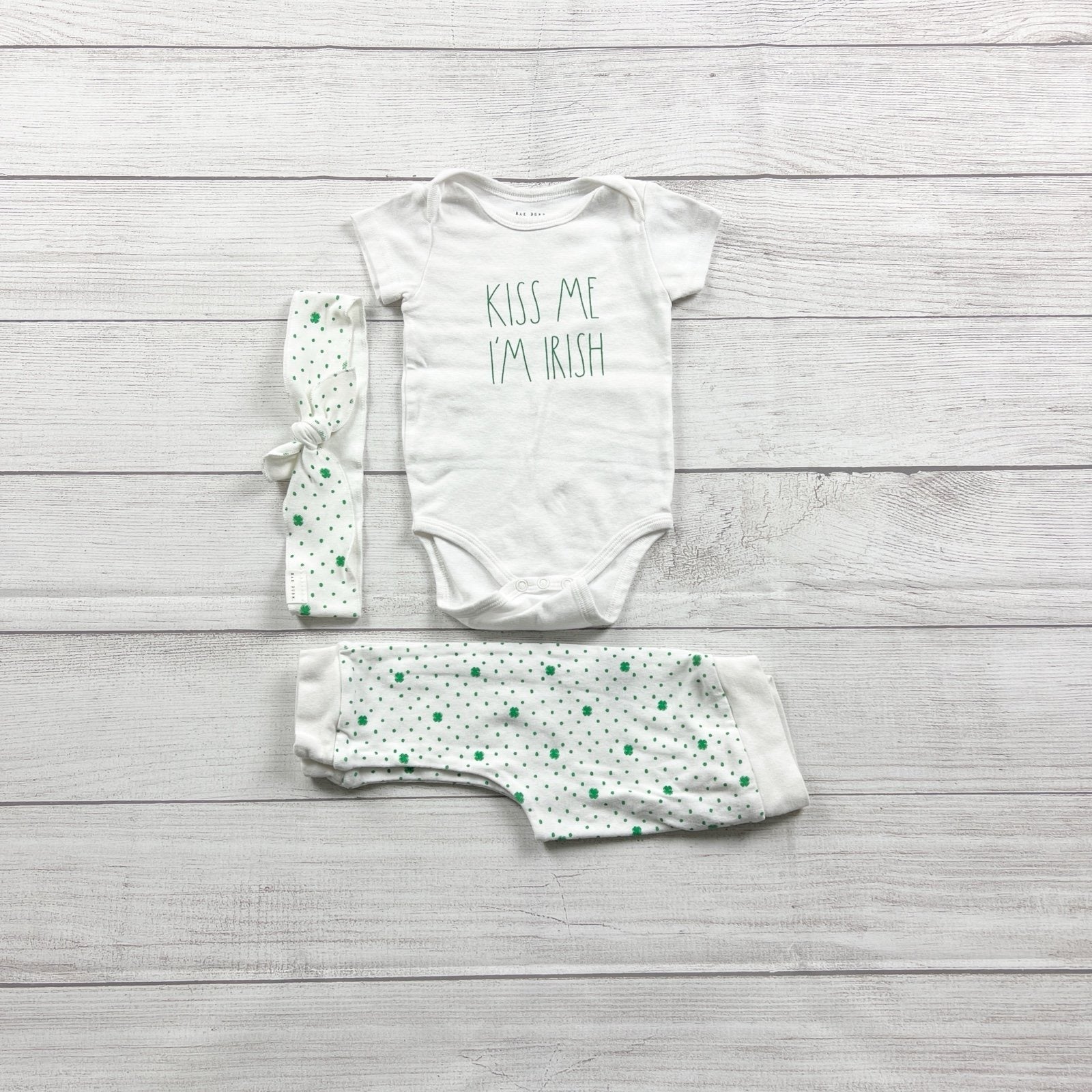 Three piece outfit - can remove headband to make it gender neutral. White short sleeve onesie with “kiss me I’m Irish” on front. White joggers pants with shamrock print. Matching head wrap. Cotton