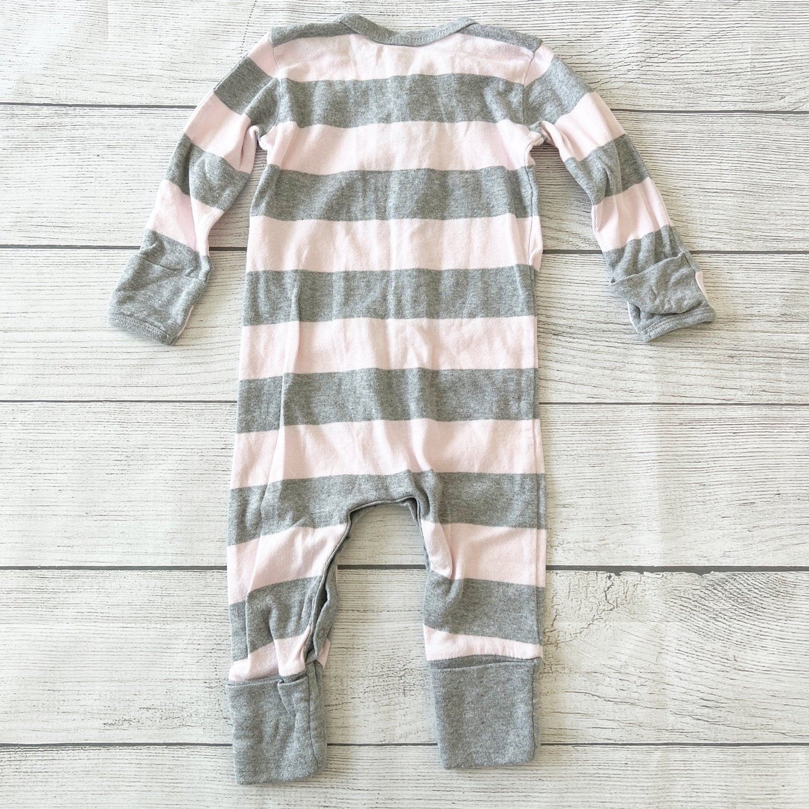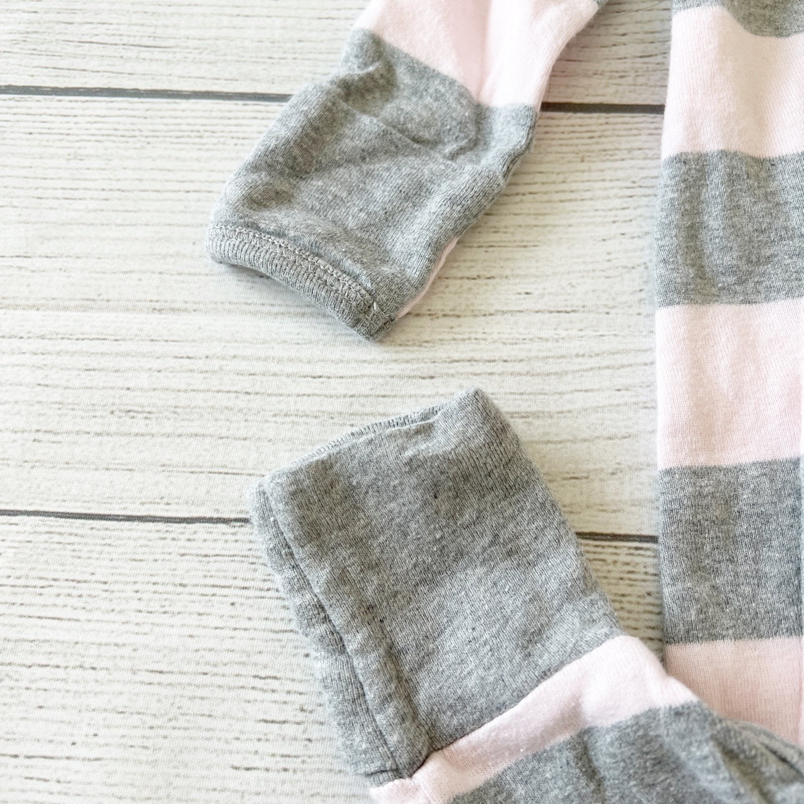 Pink and grey gray striped long sleeve footless romper with snaps at legs and chest. Hands and feet can be covered or open. Organic cotton