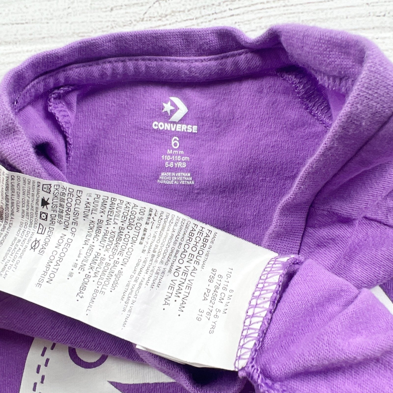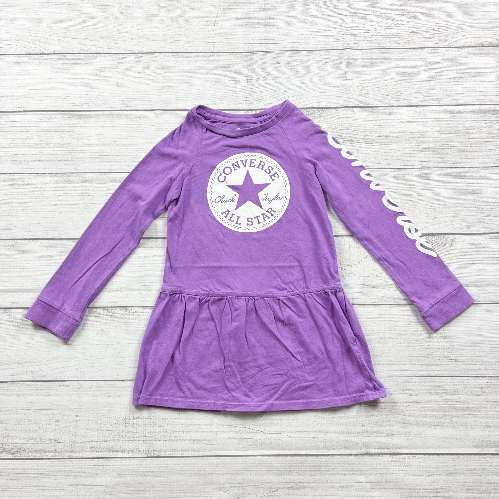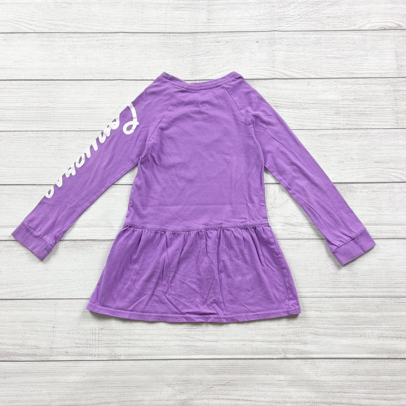 Purple long sleeve dress with logo graphic on front and sleeve. Cotton