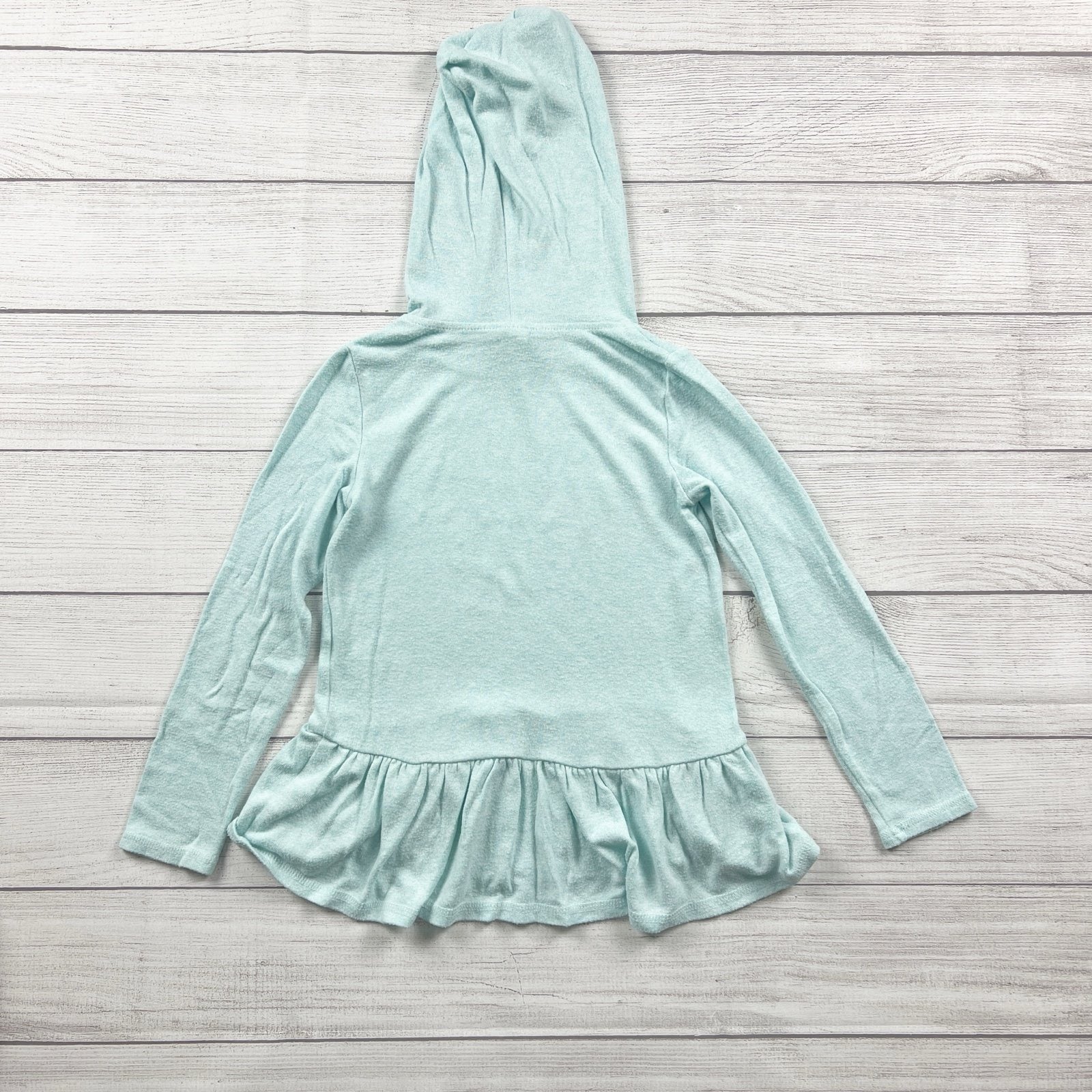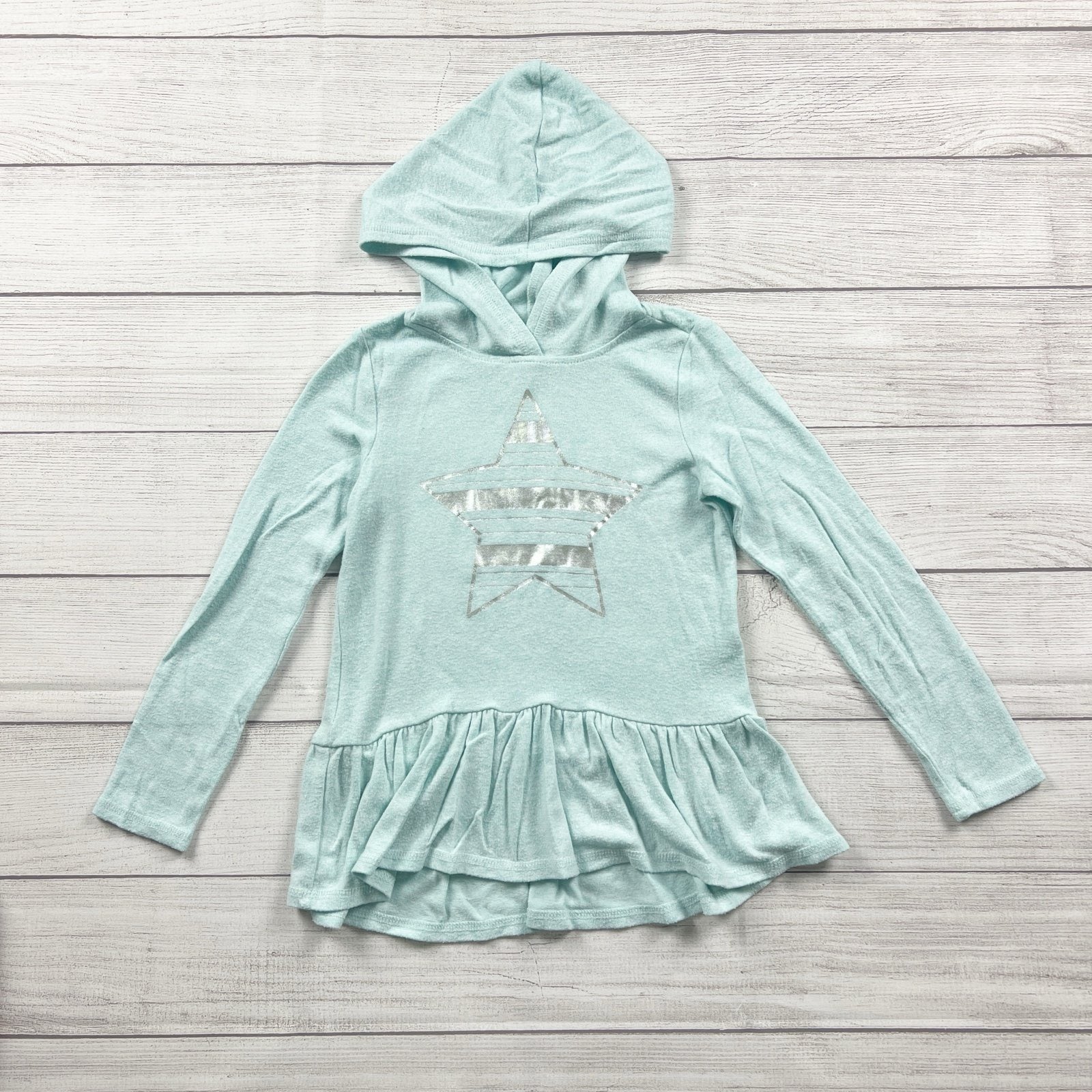 Blue long sleeve peplum hoodie hooded sweatshirt with metallic silver star graphic. Viscose Polyester spandex blend