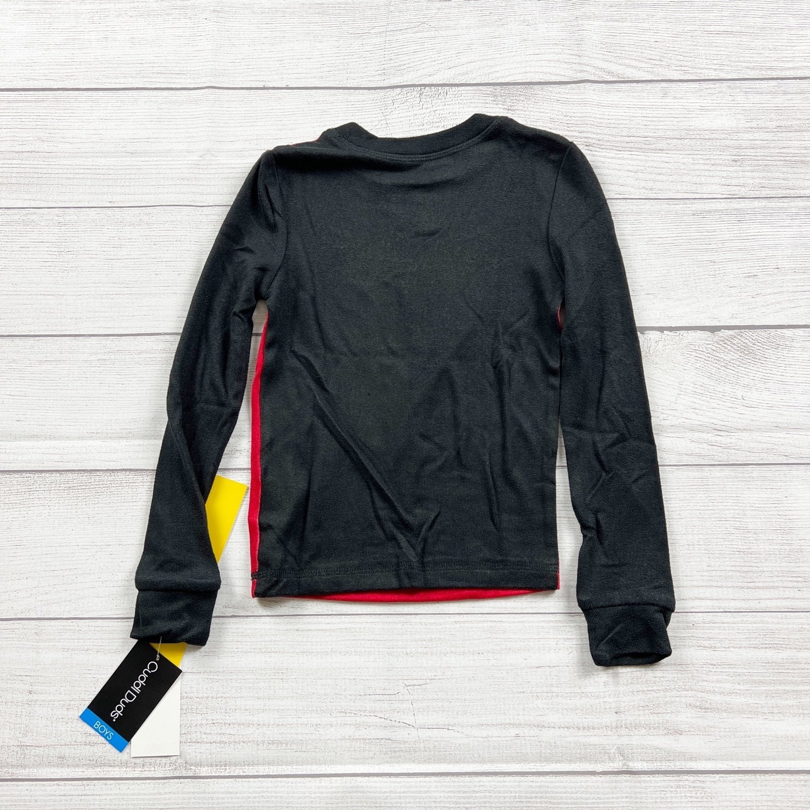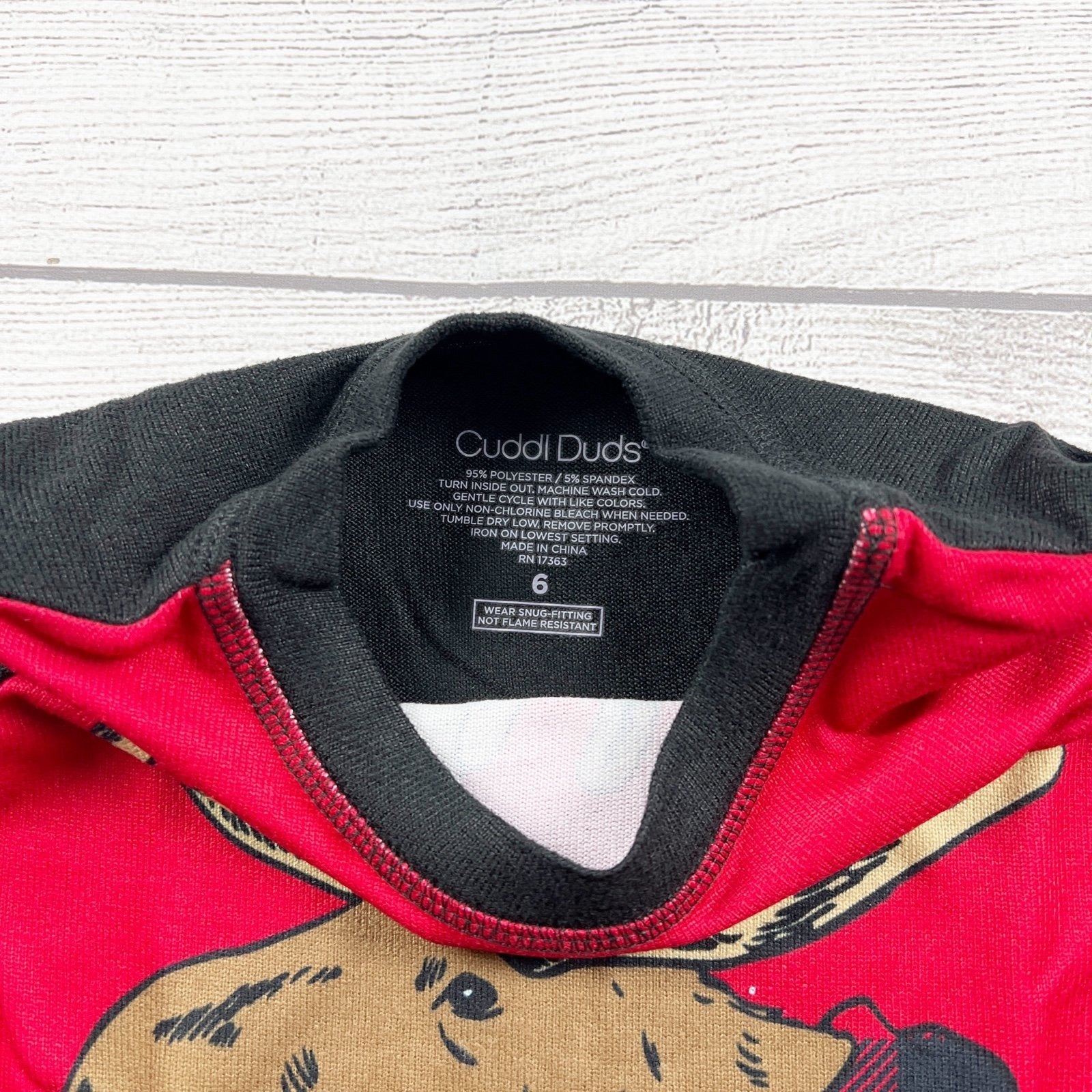 Long sleeve shirt and pants pajama set. Black and red ringer style shirt with moose on front. Checkerboard gingham plaid pants with moose print. Polyester spandex blend