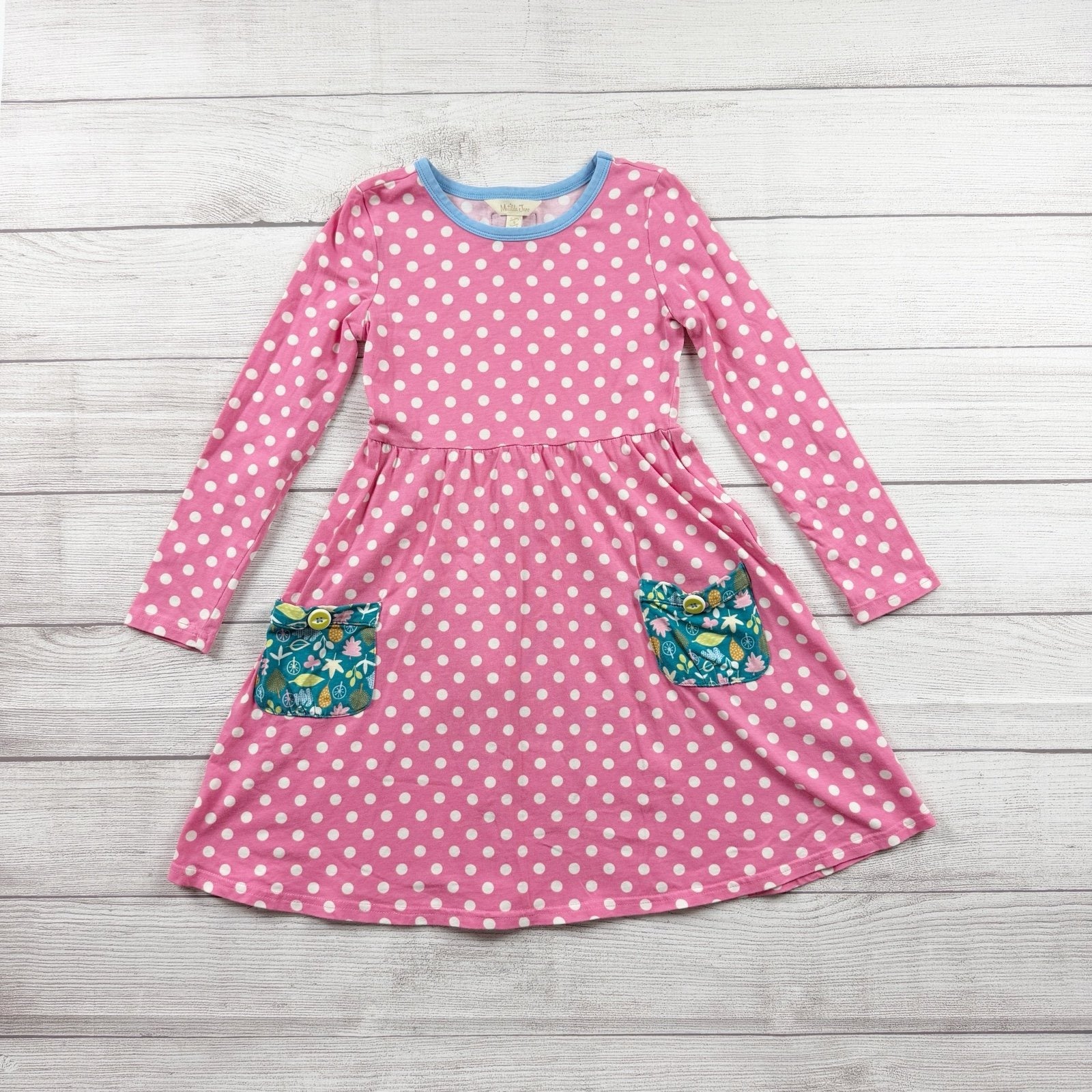 Pink long sleeve dress with Polkadot print. Floral flower print pockets. Cotton spandex blend