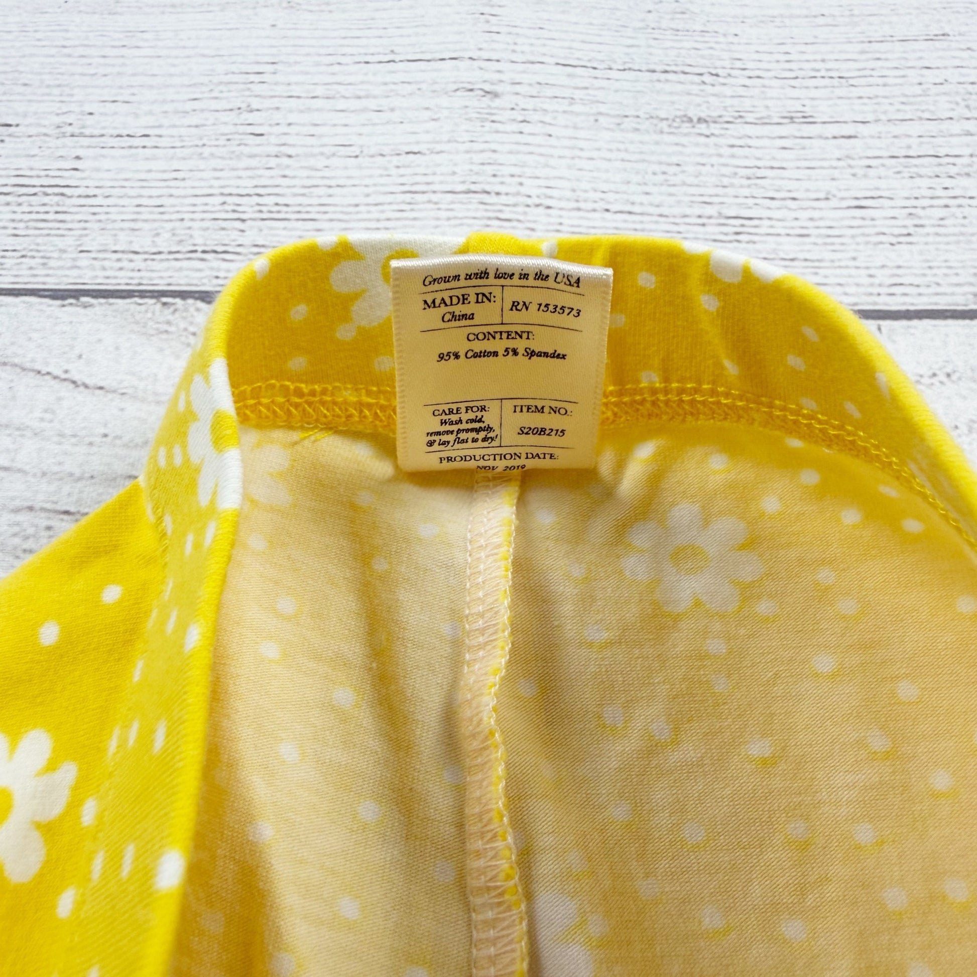 Yellow leggings with floral flower and dot print. Pink ruched ankles. Cotton spandex blend