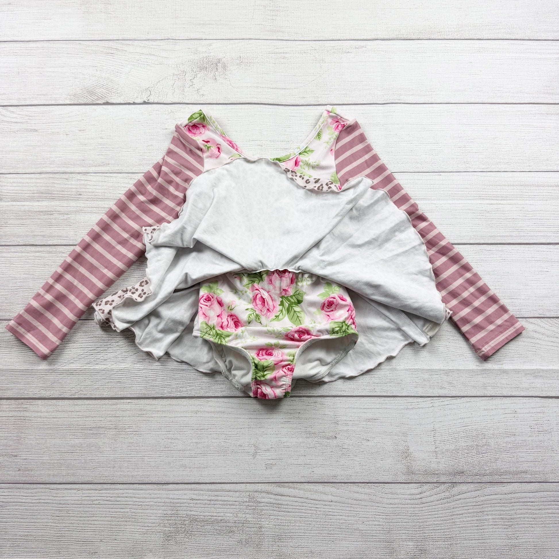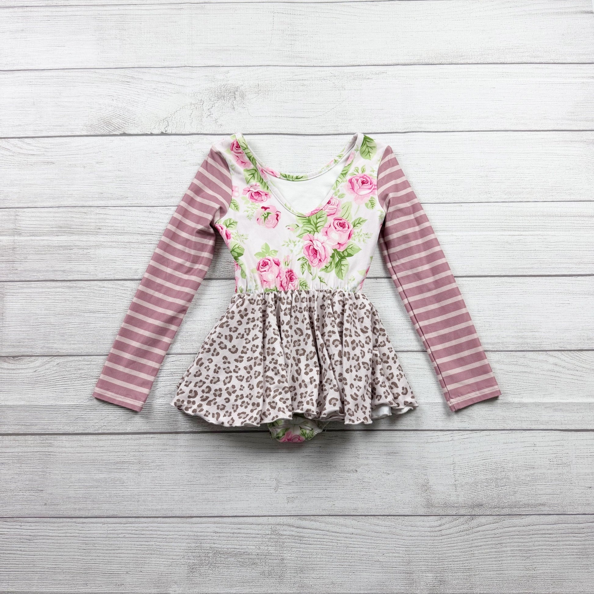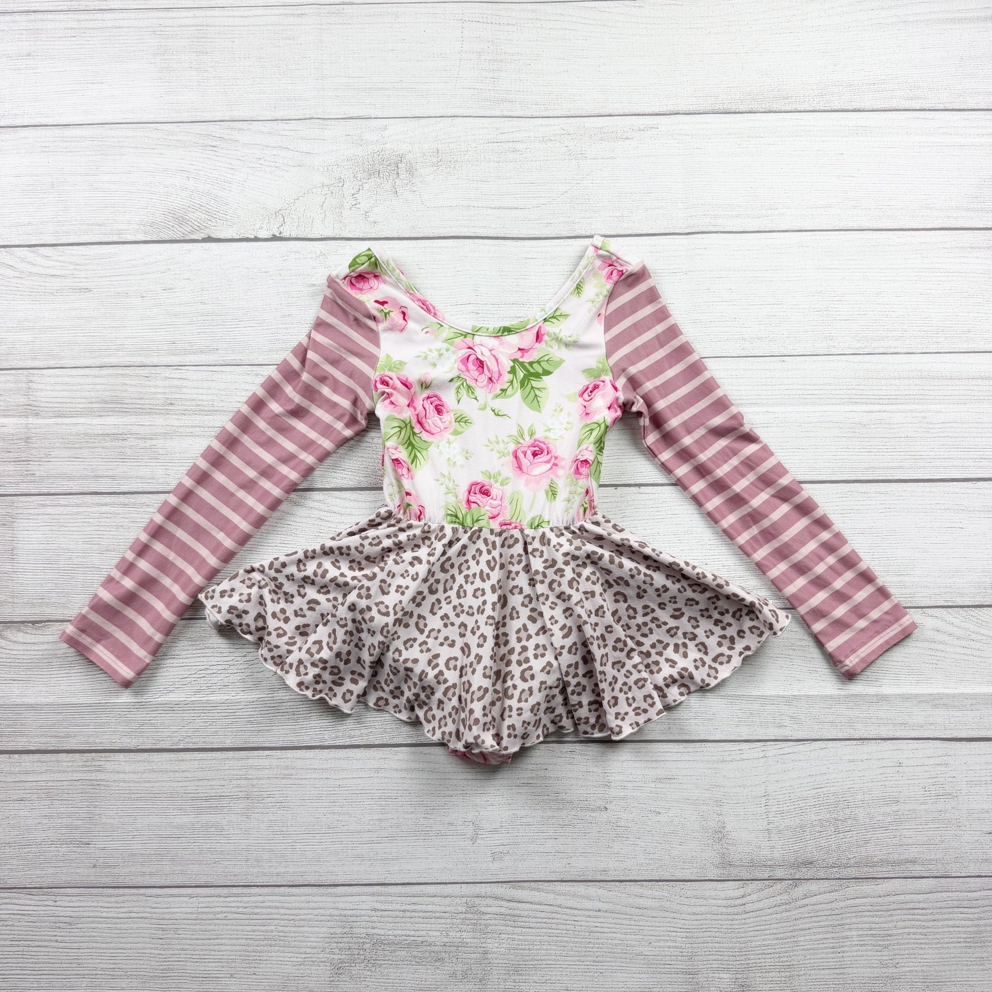Long sleeve striped floral flower print gymnastics dance leotard. Skirted waist. Polyester spandex blend