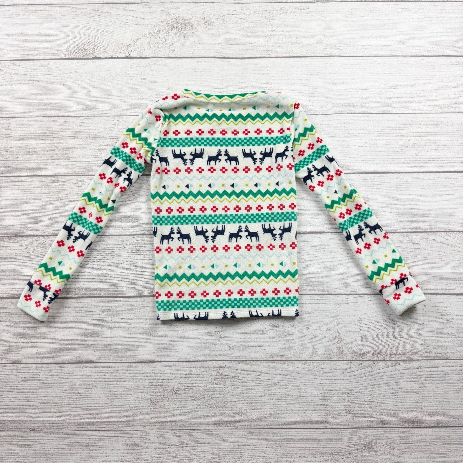 Two piece pajamas set fleece with colorful holiday Fairisle print. Christmas. Polyester spandex blend.