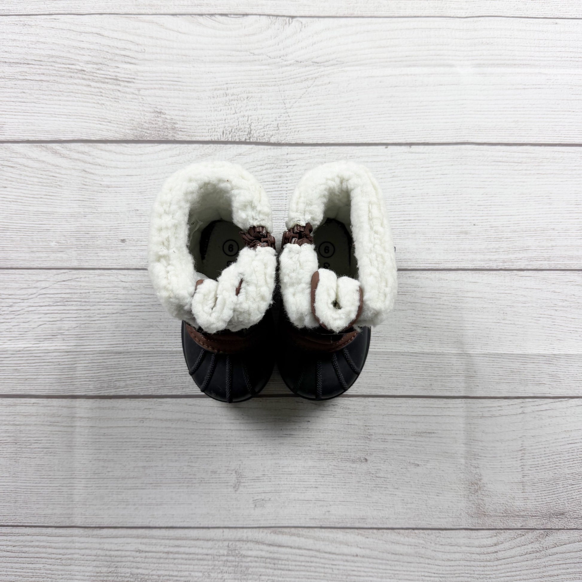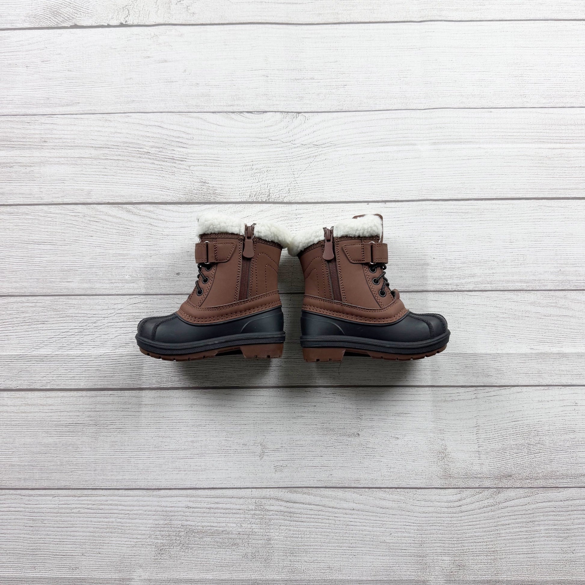 Neutral brown and black slip on strap cozy lined snow boots. Thermolite