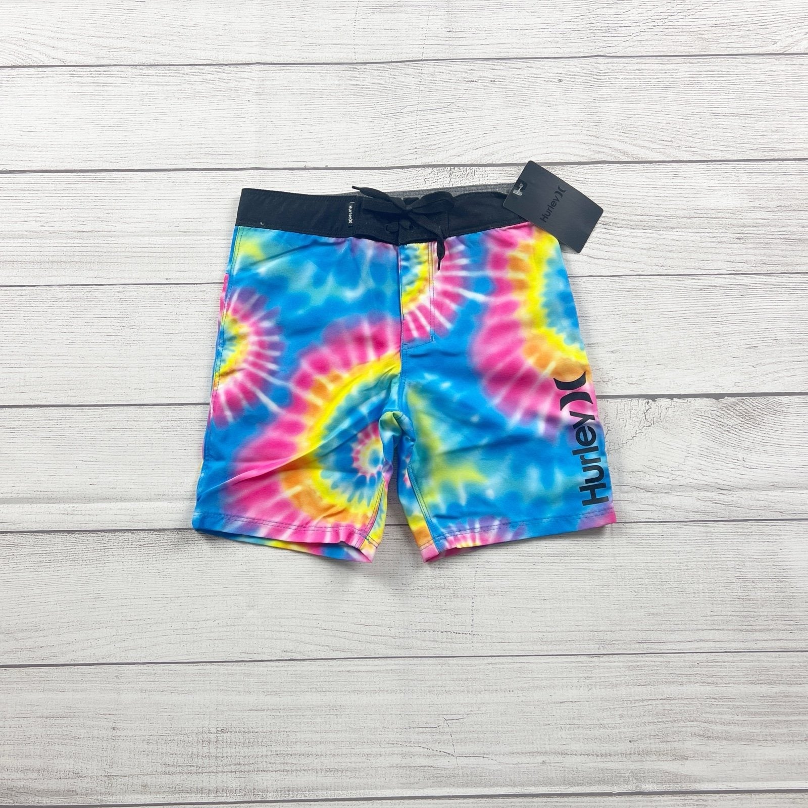 Colorful tie dye swim shorts with drawstring waist and no liner.