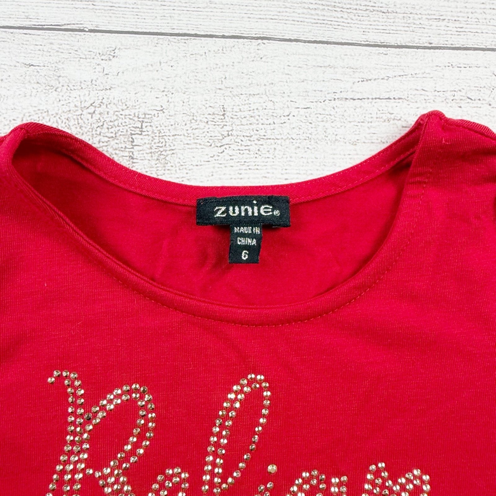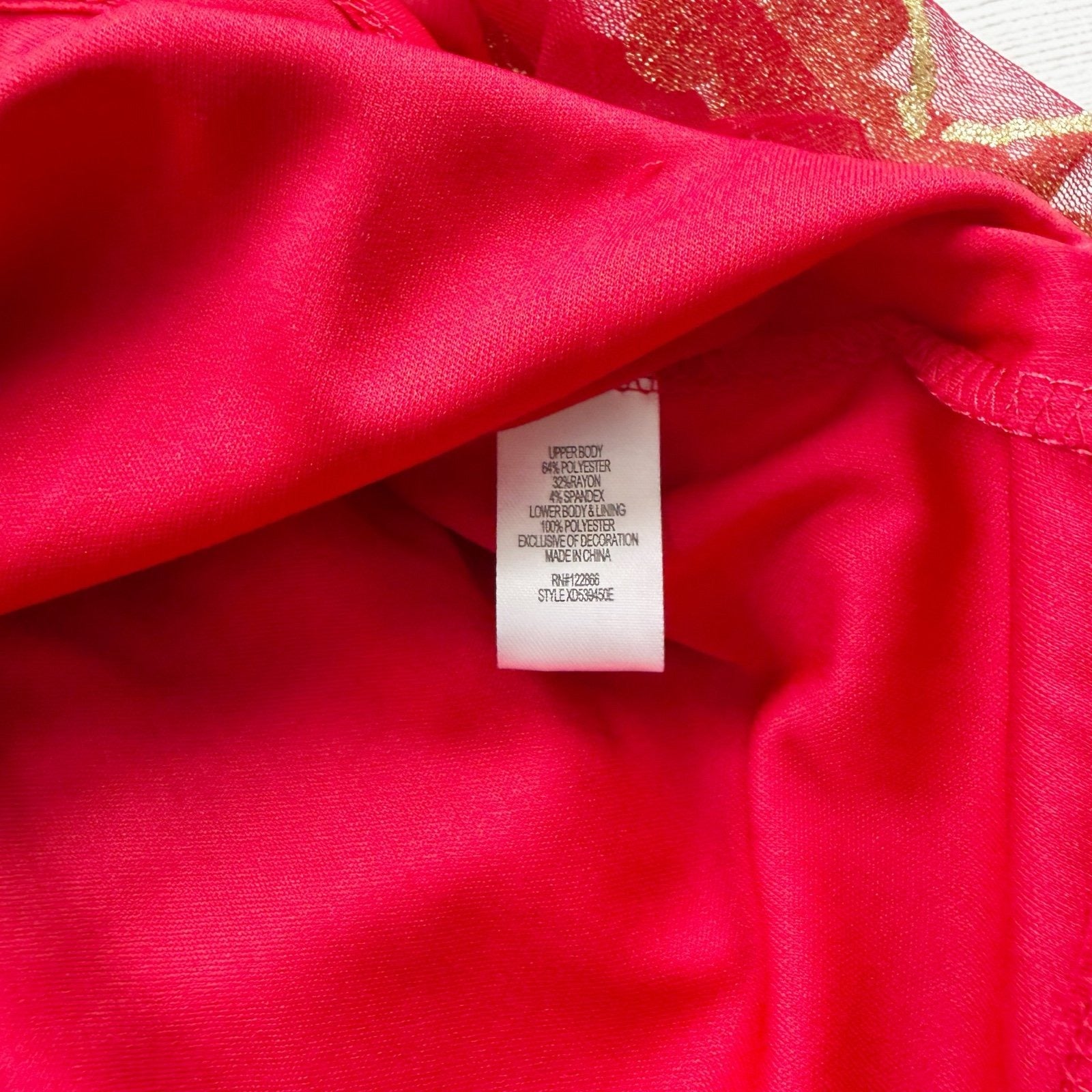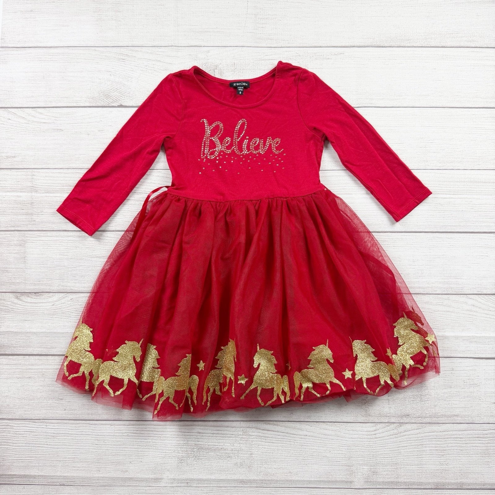 Red long sleeve dress with tulle skirted bottom. Glitter unicorn graphic trim. Believe rhinestone graphic on front. Polyester blend. Tie at back