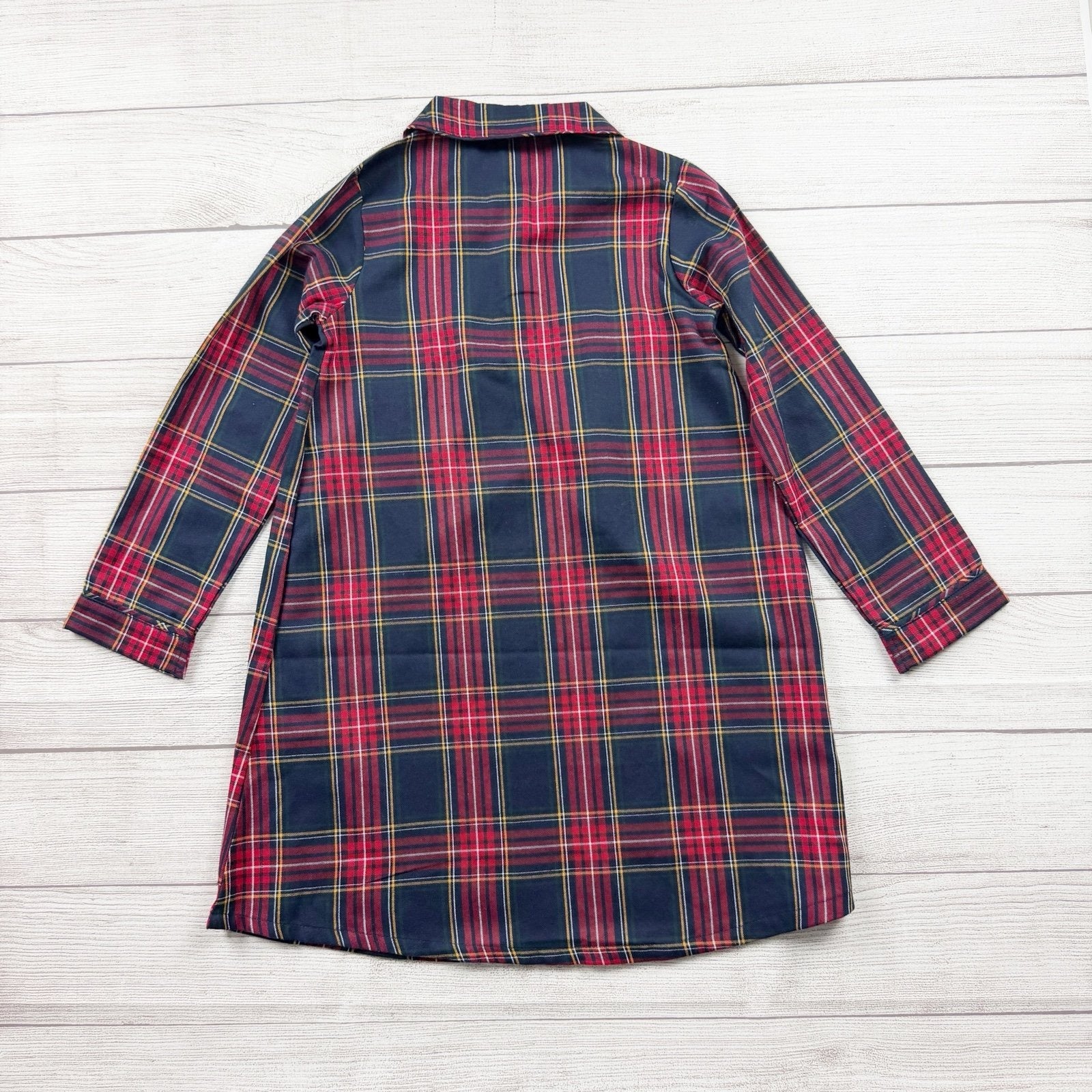 Colorful tartan plaid long sleeve nightgown with collar and buttons at chest. Polyester.
