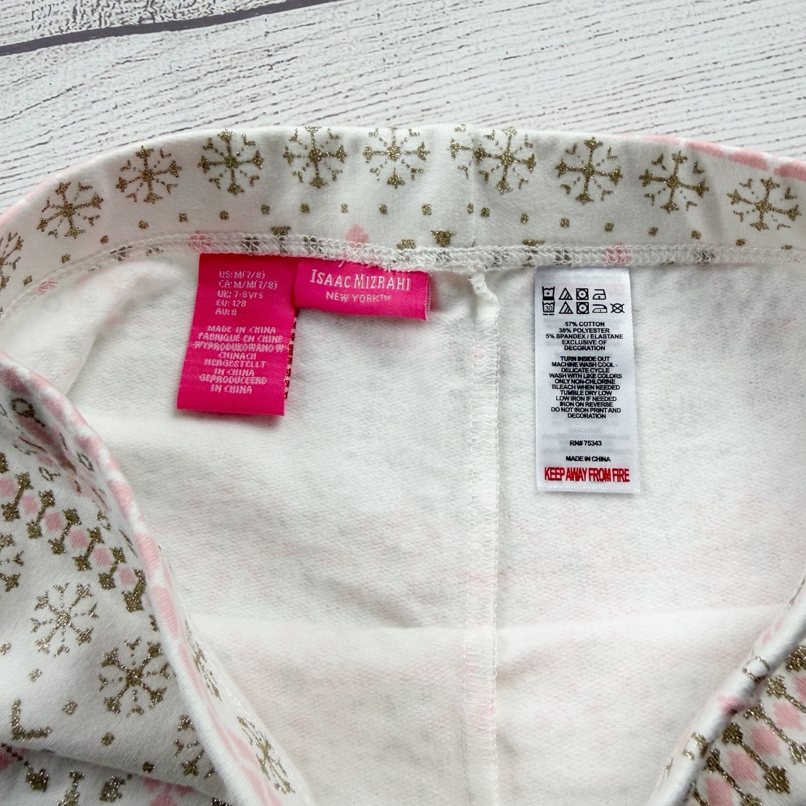 White lightly fleece lined leggings with glitter fair isle print. Polyester cotton spandex blend