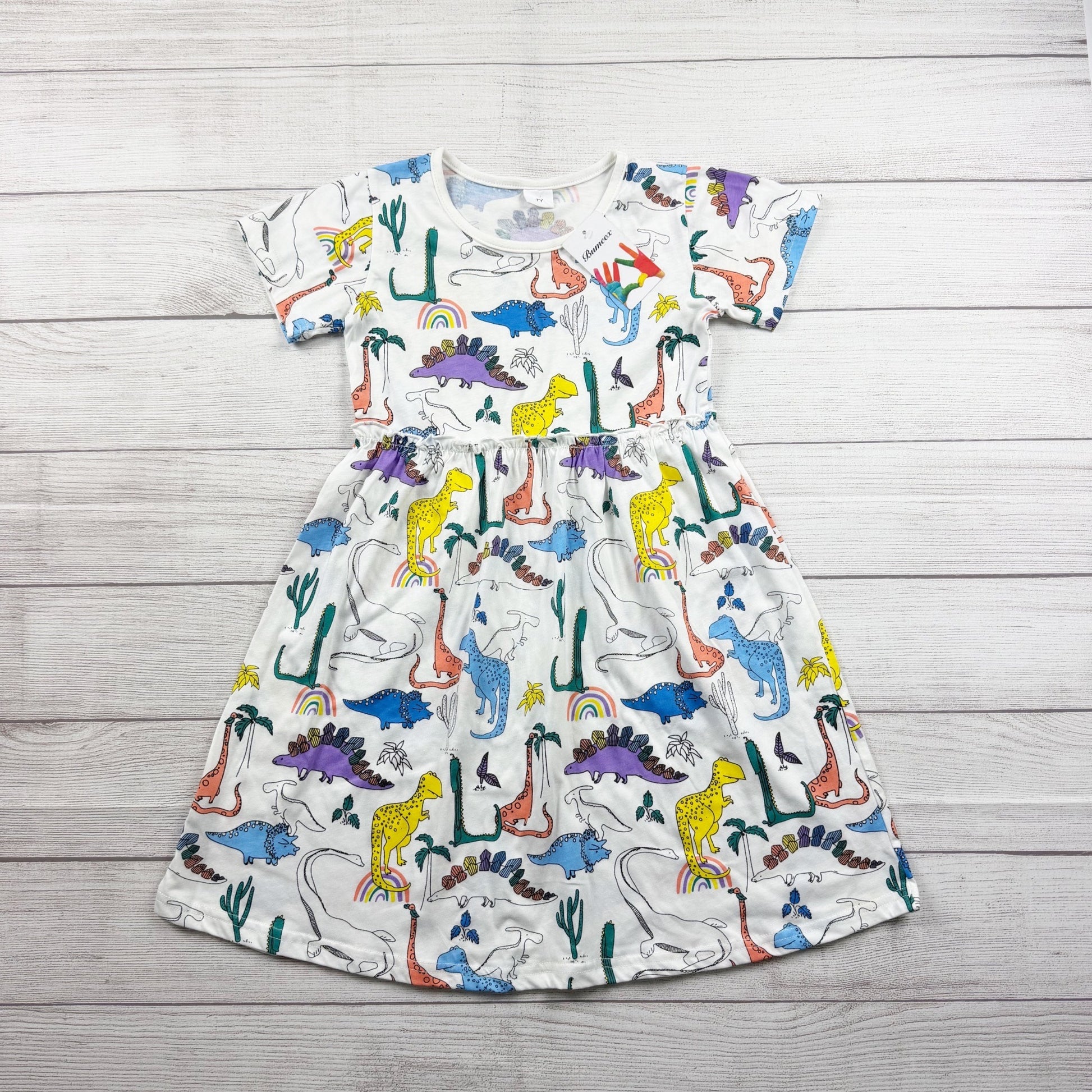 Bumeex7White short sleeve dress with colorful dinosaur print. Cotton