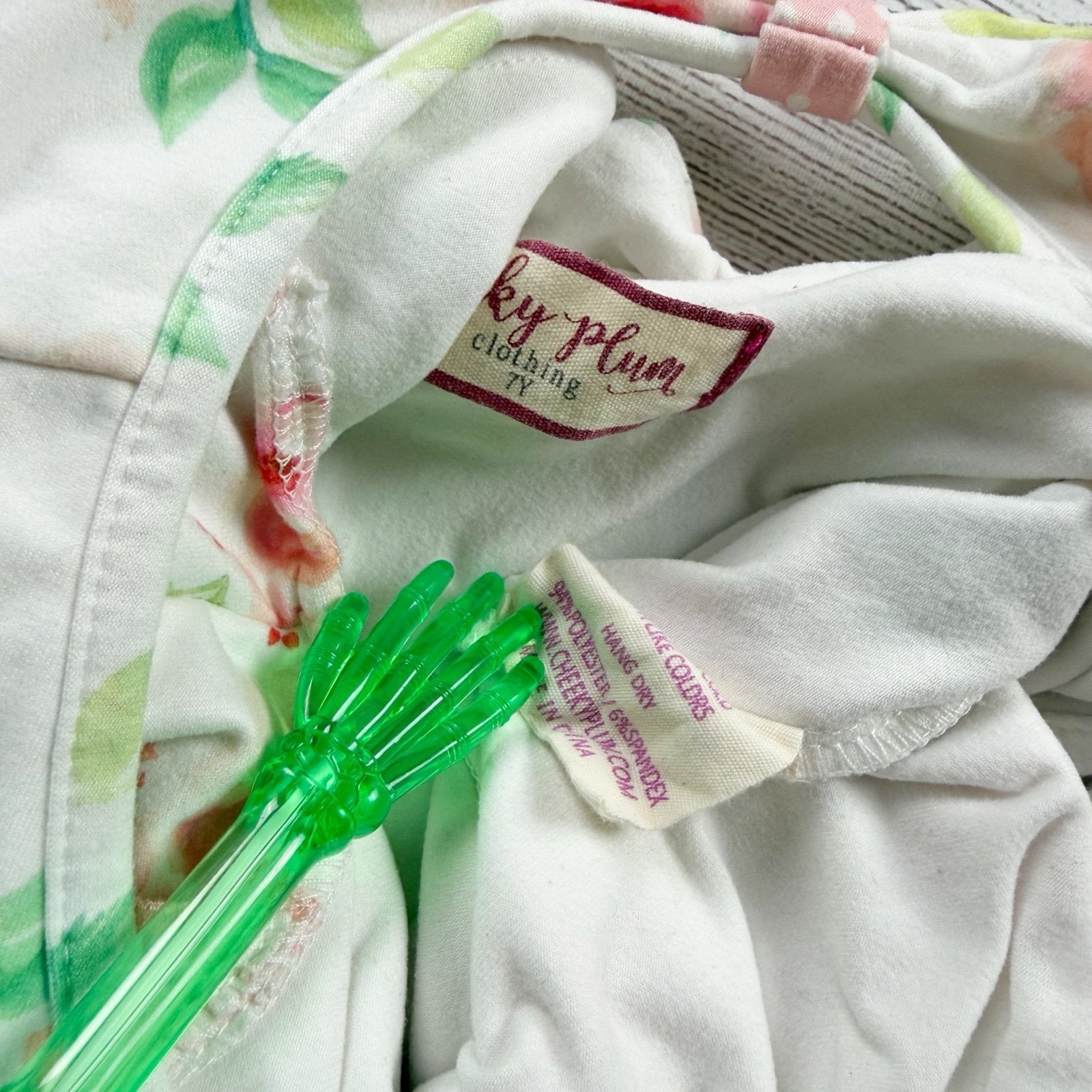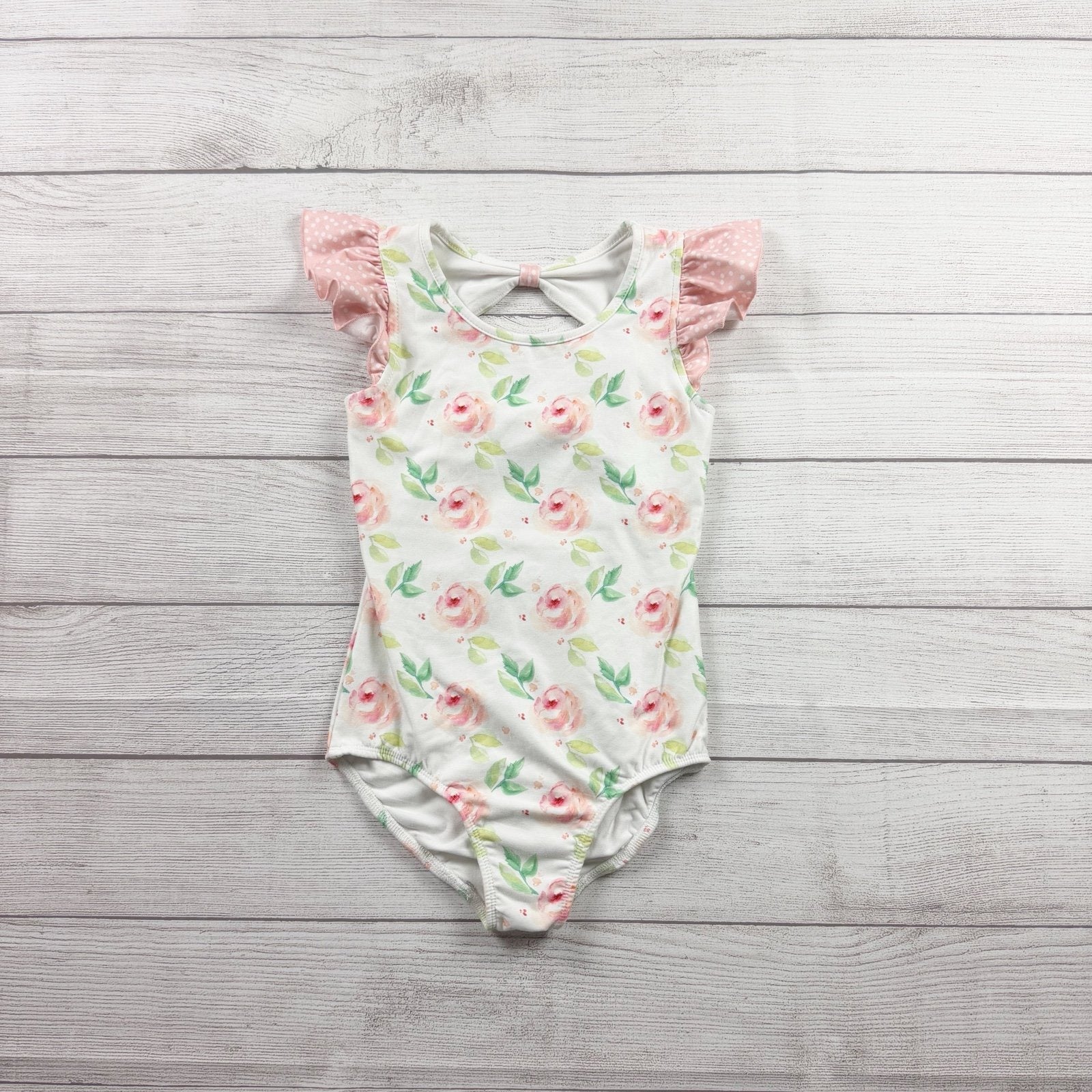 Floral flower and polkadot print flutter sleeve one piece gymnastics dance leotard. Polyester spandex blend