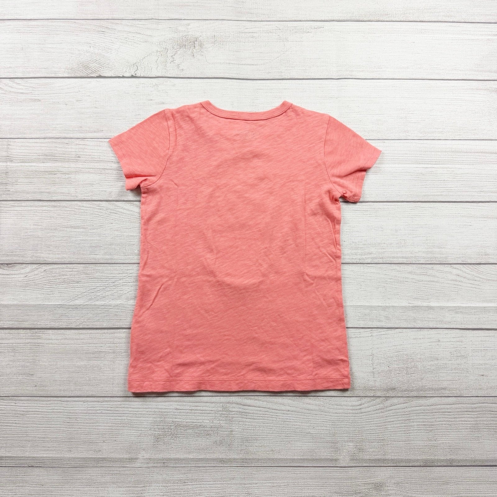 Pink short sleeve shirt with lava lamp graphic spelling love in sequin. Cotton