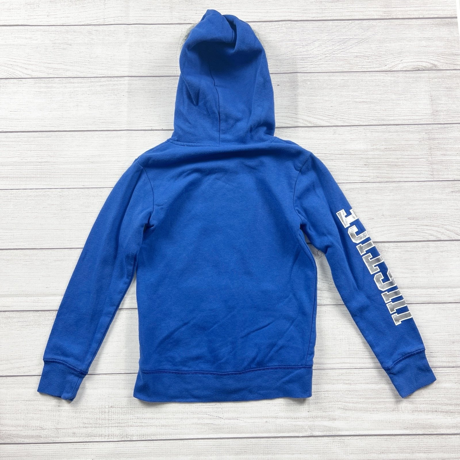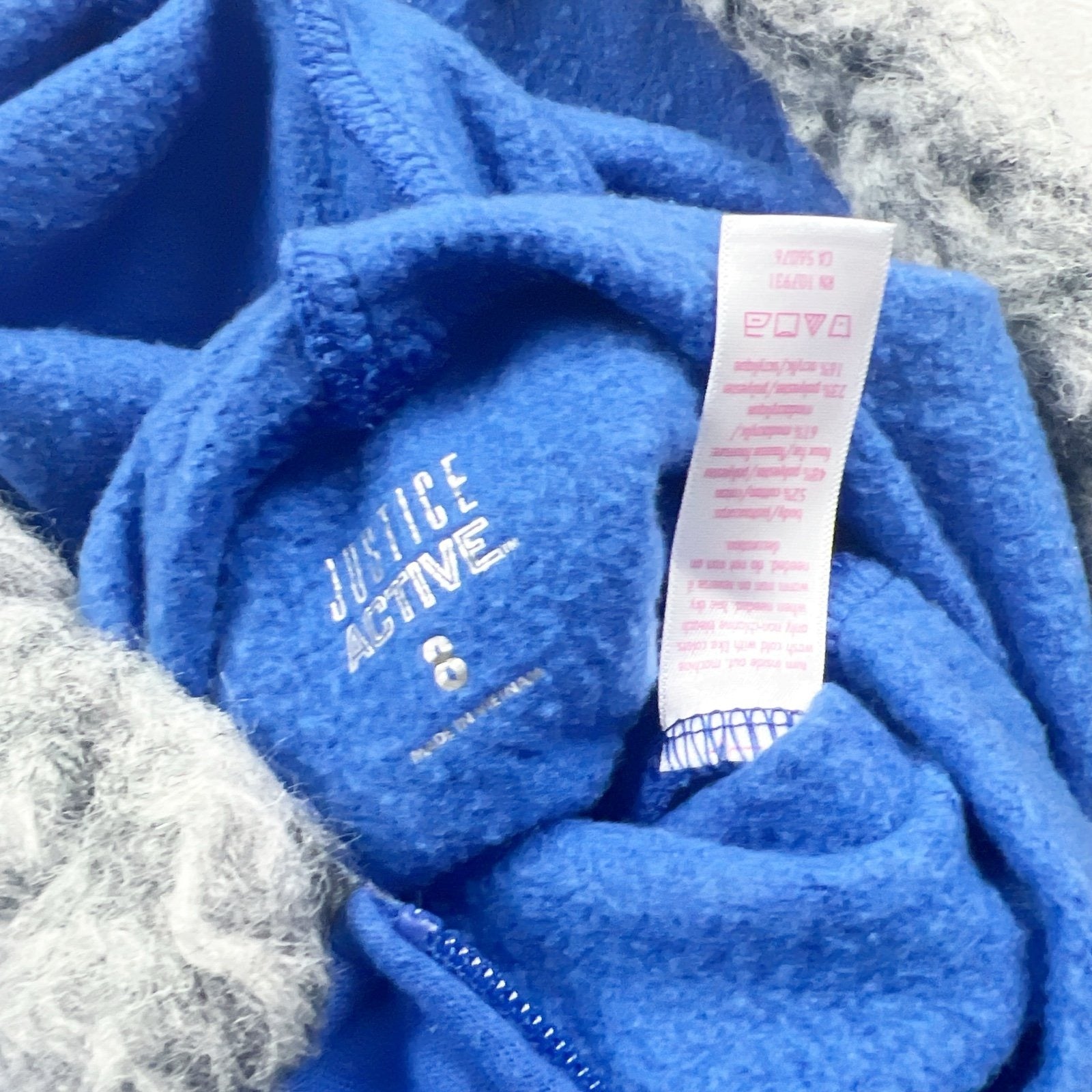 Blue long sleeve zip hoodie hooded sweatshirt with faux fur hood trim. Justice graphic at chest and sleeve