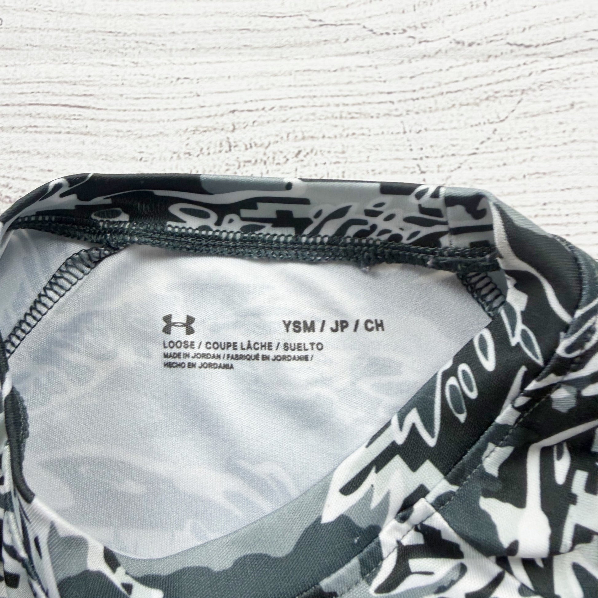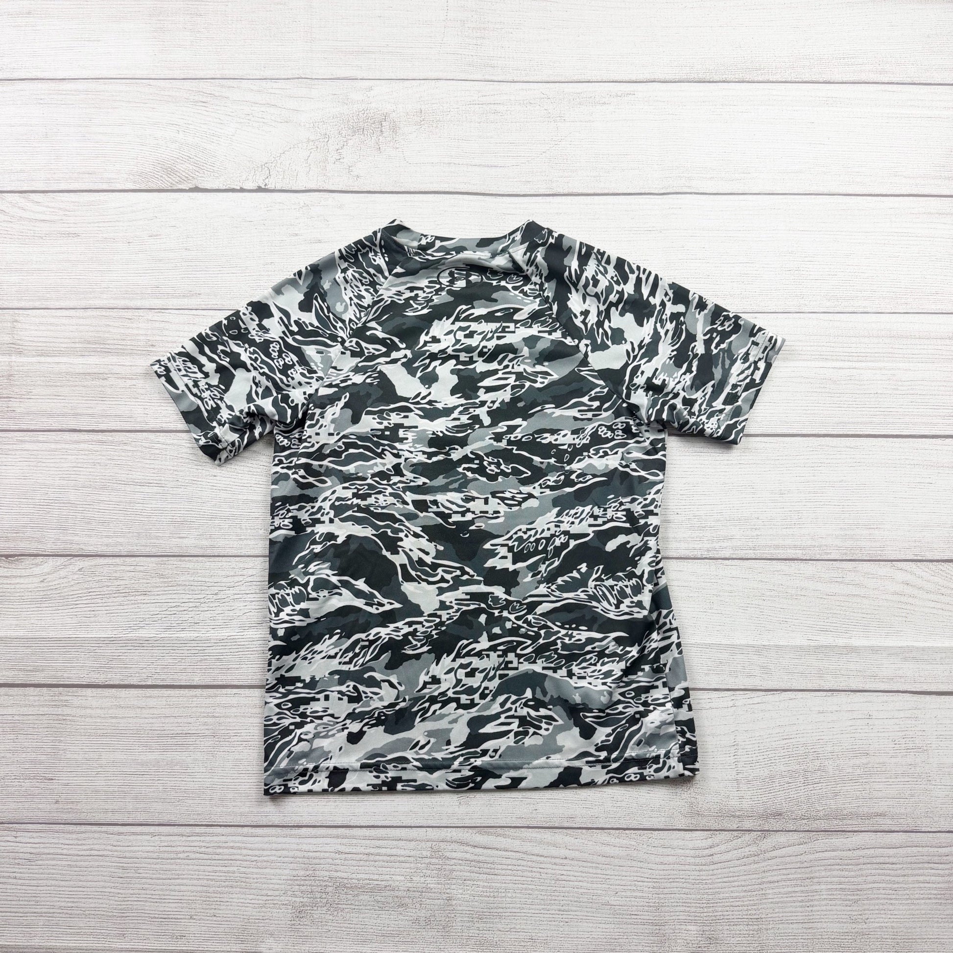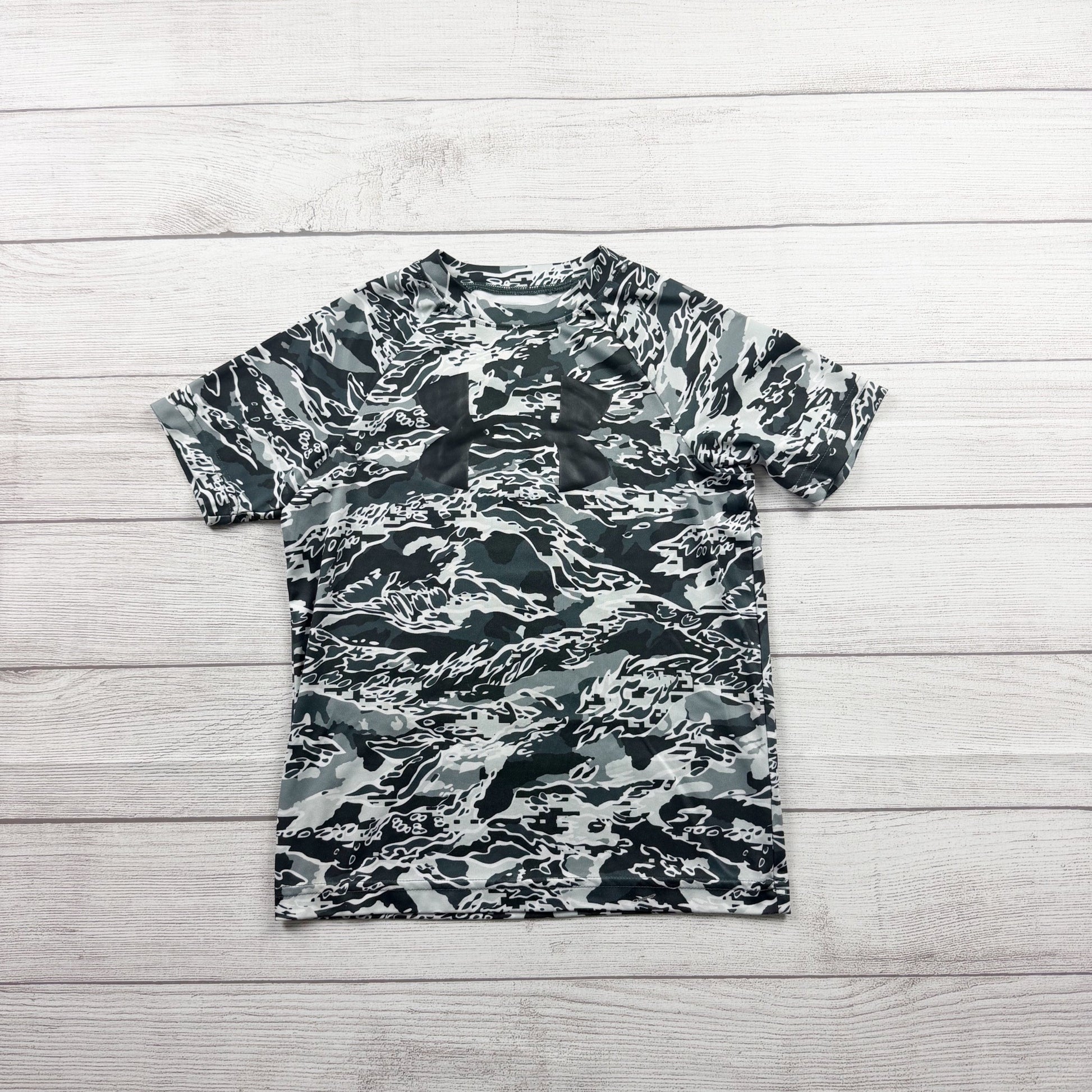 Shades of black and grey gray neutral camo camouflage shirt with logo graphic. Loose fit.