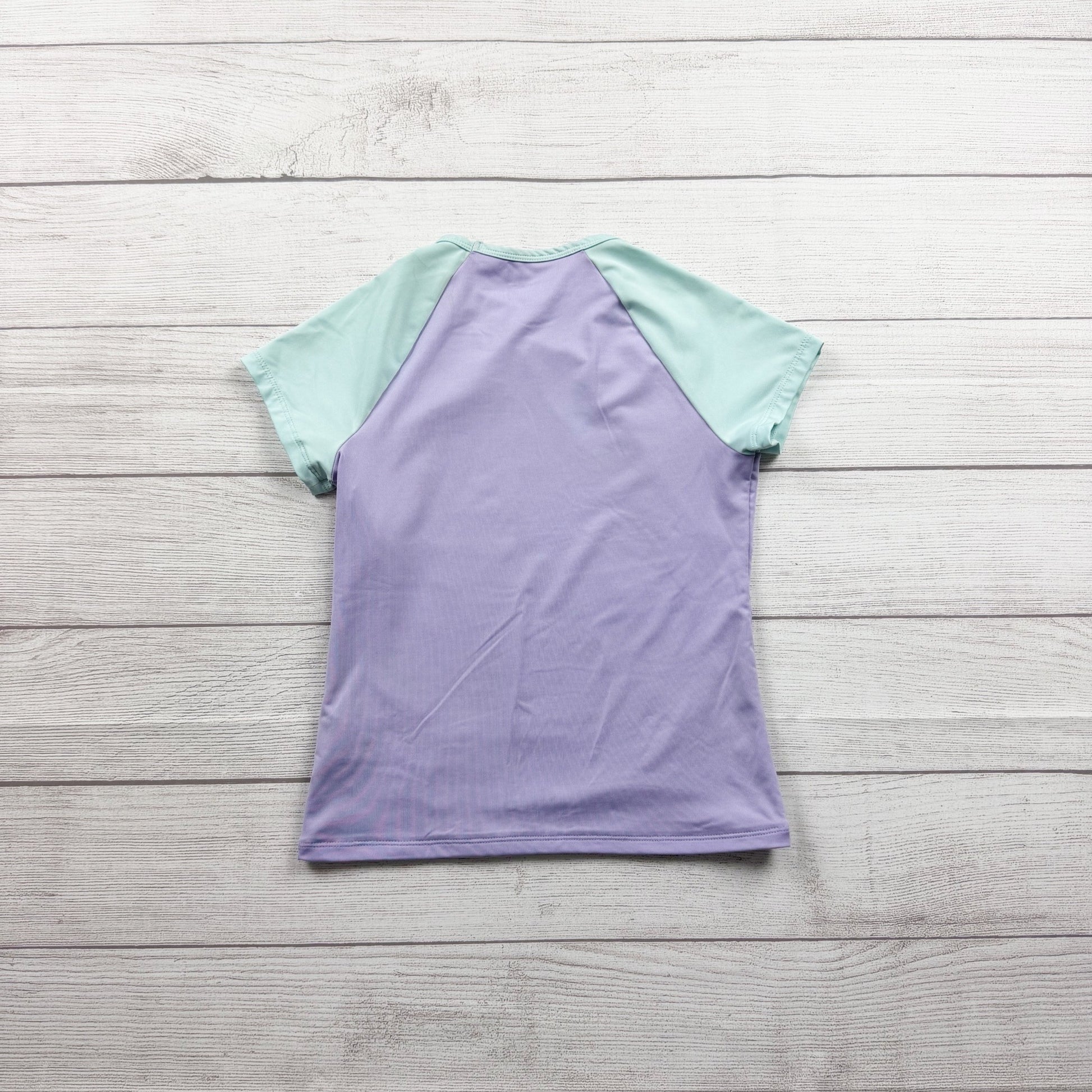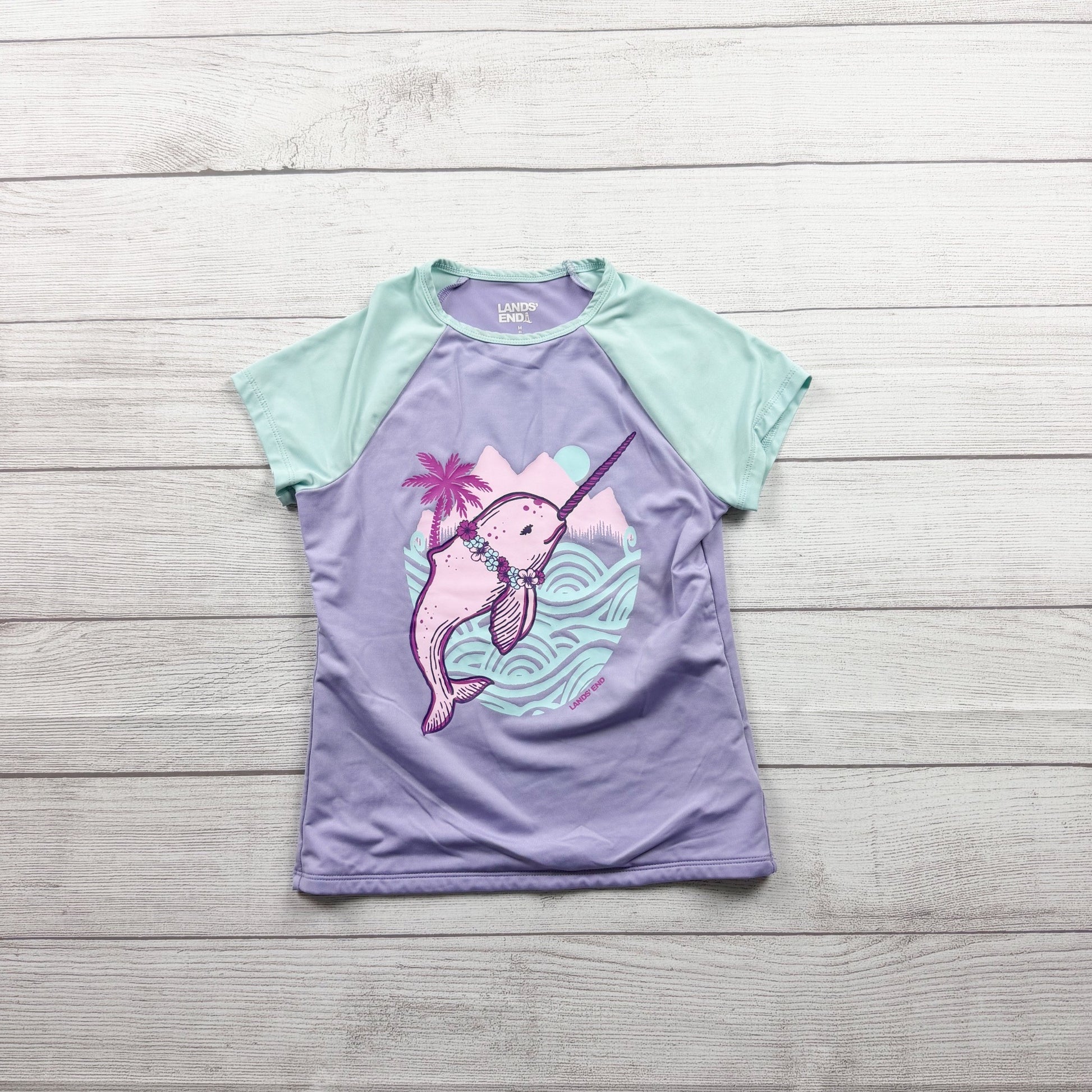 Blue and purple short sleeve Rashguard swim shirt. Lining. Narwhal graphic on front. Polyester spandex blend