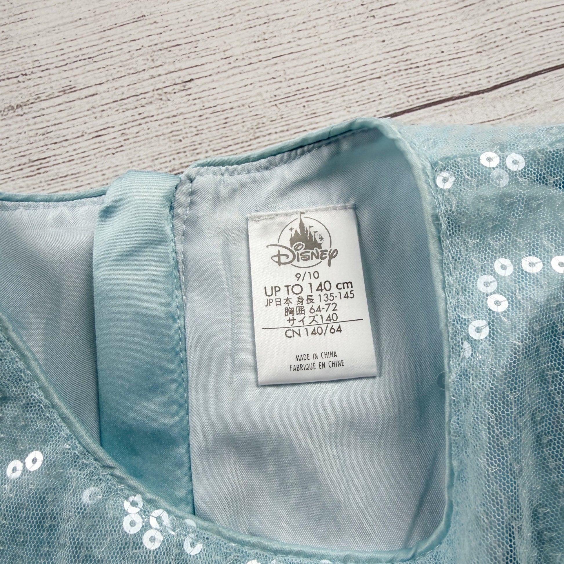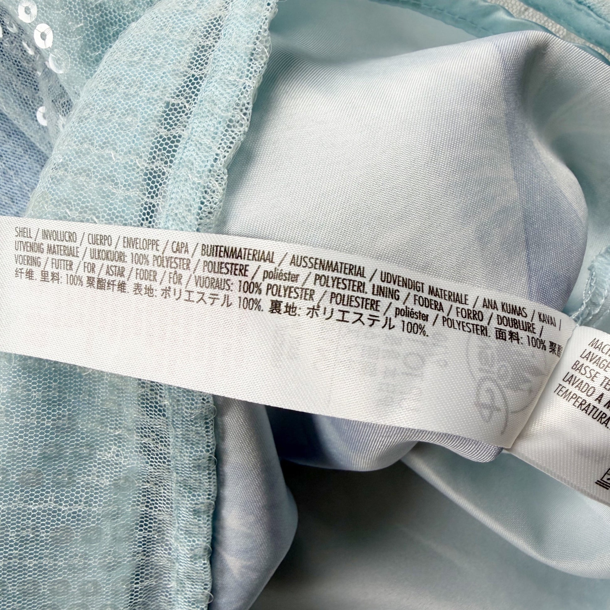 Blue short sleeve dress with zipper back. Sequins throughout. Polyester. Elsa graphic.