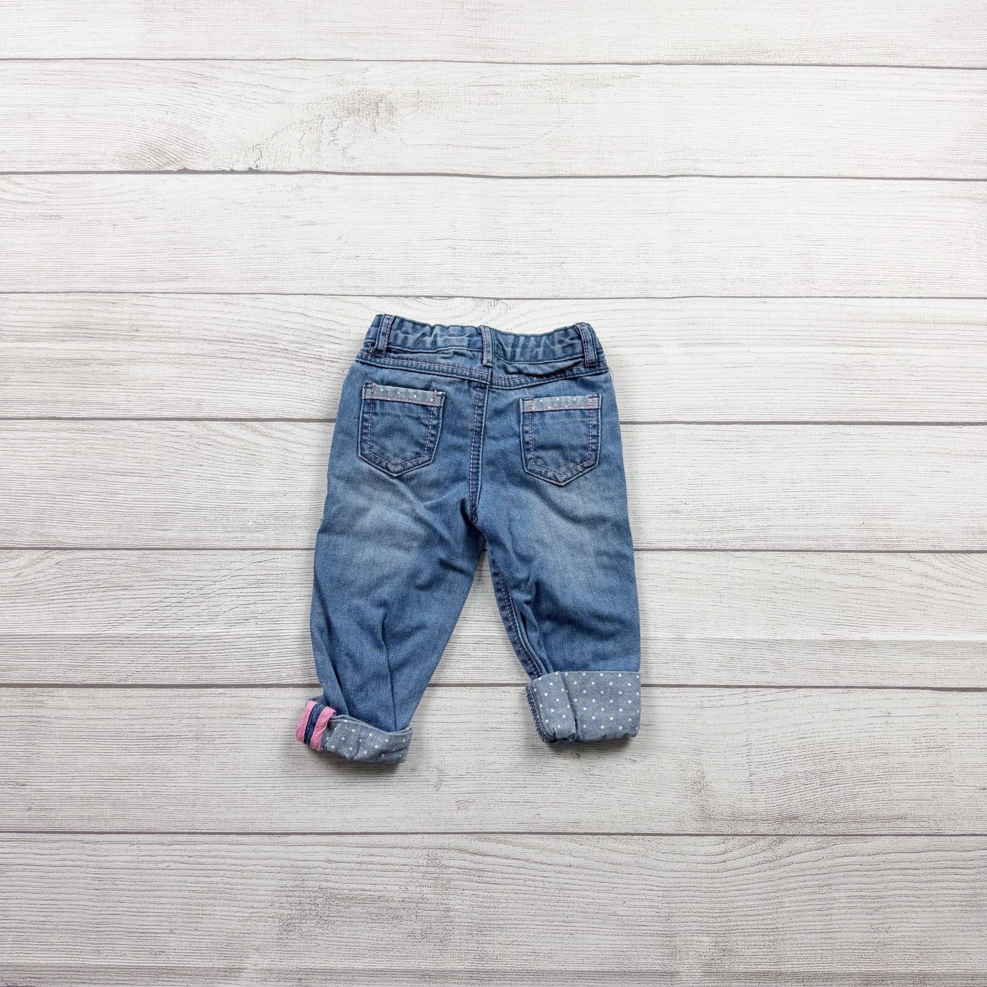 Blue denim jeans with cuffed ankles. Adjustable waist within. Embroidered heart and heart patch accents.