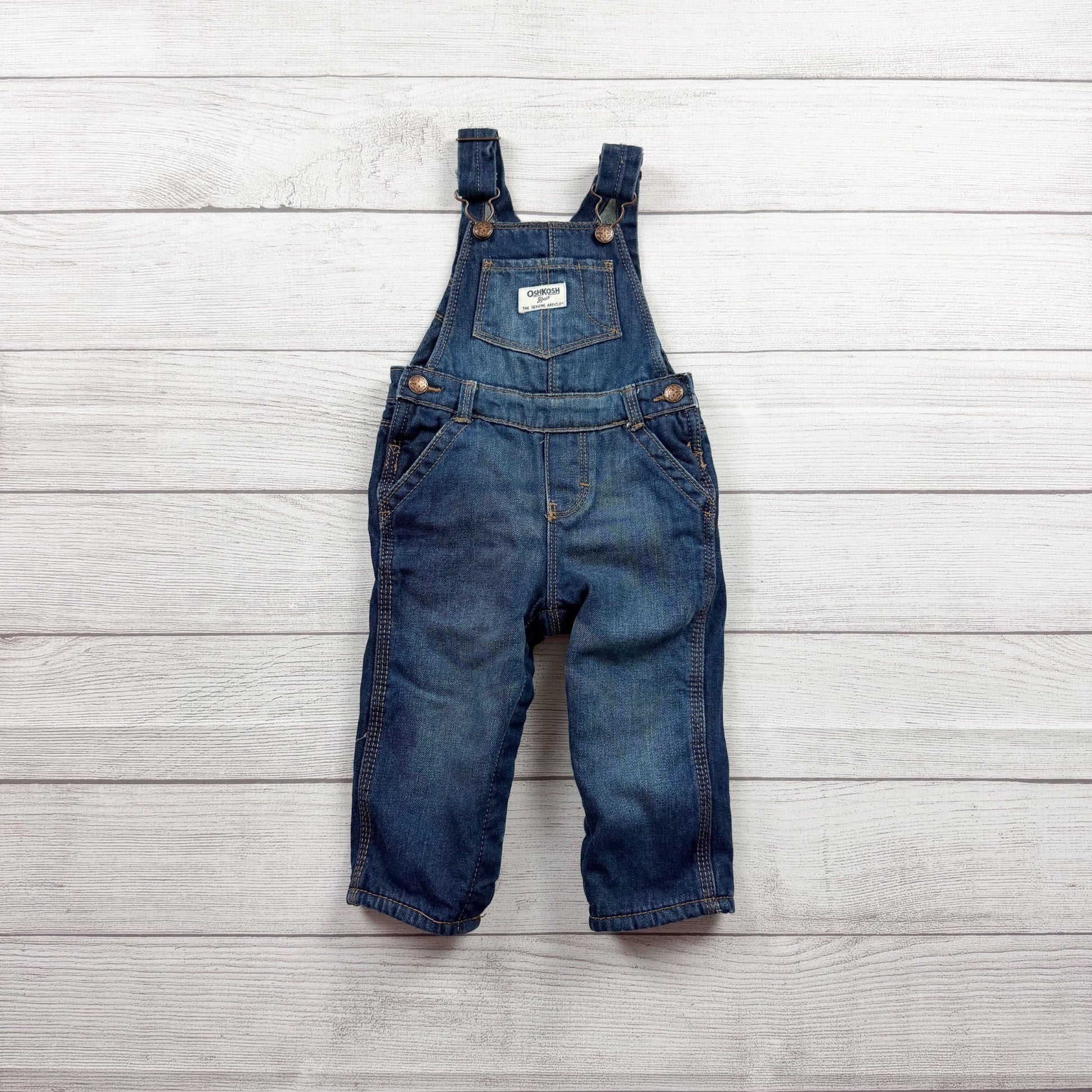 Blue denim overalls with pink fleece cozy lining. Snaps at legs.