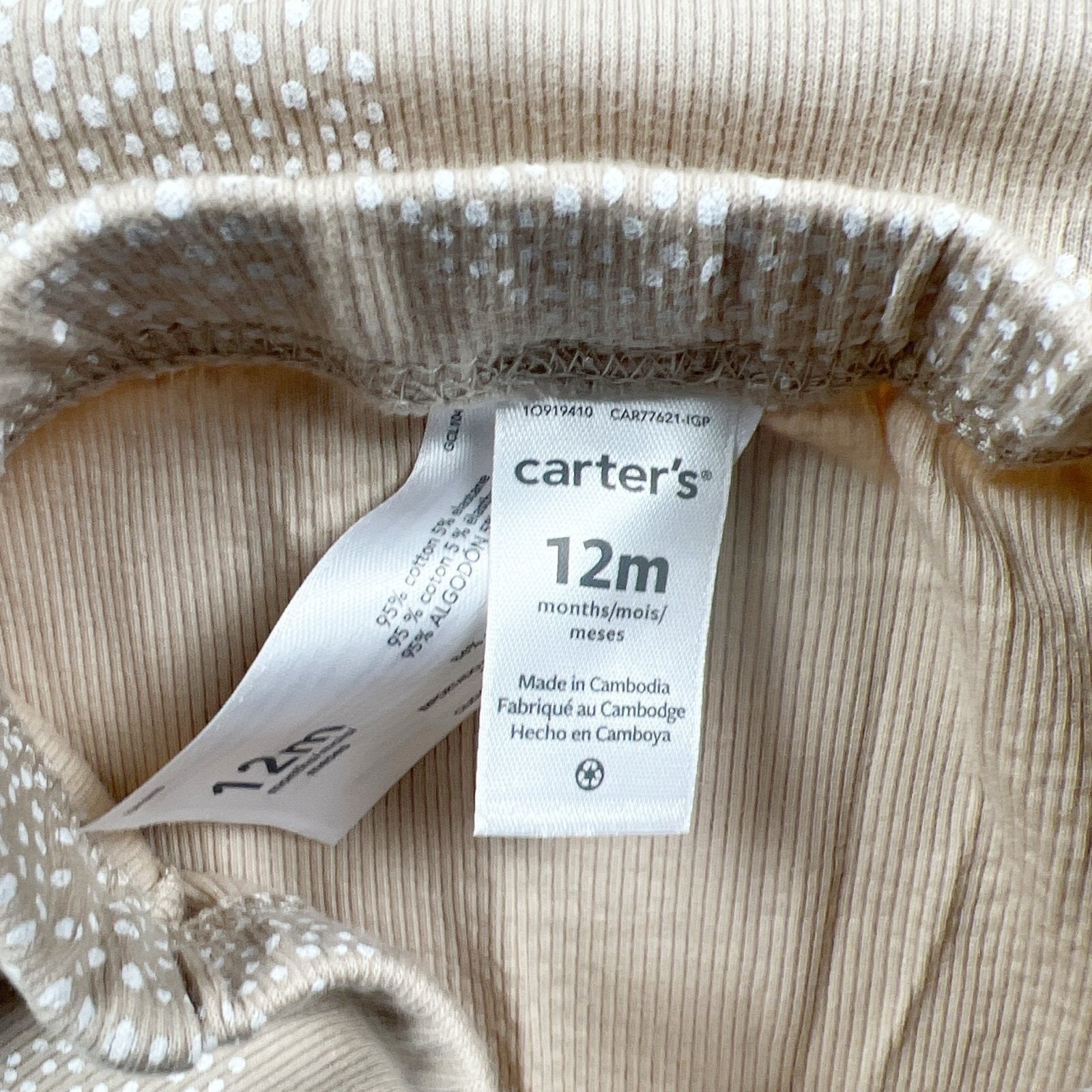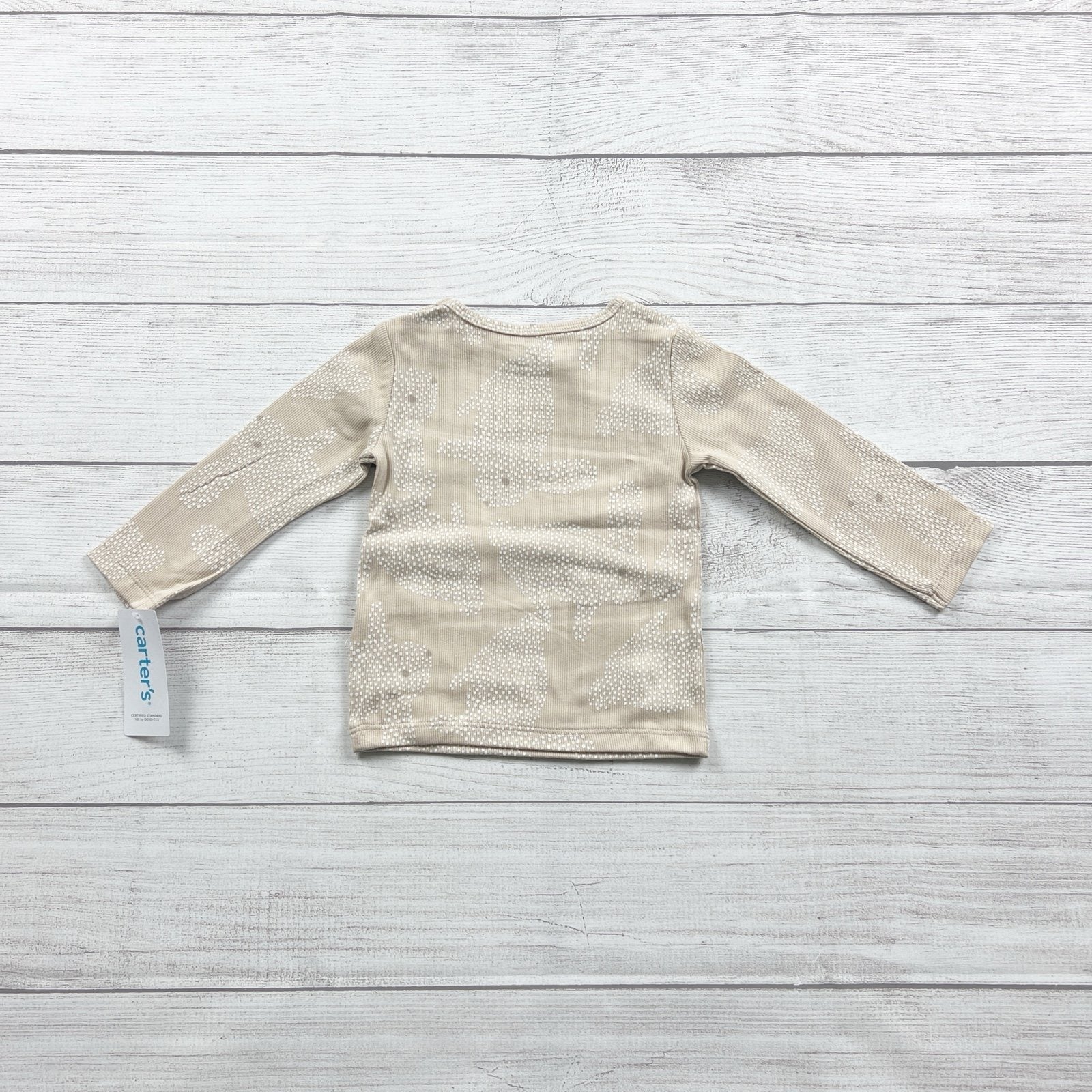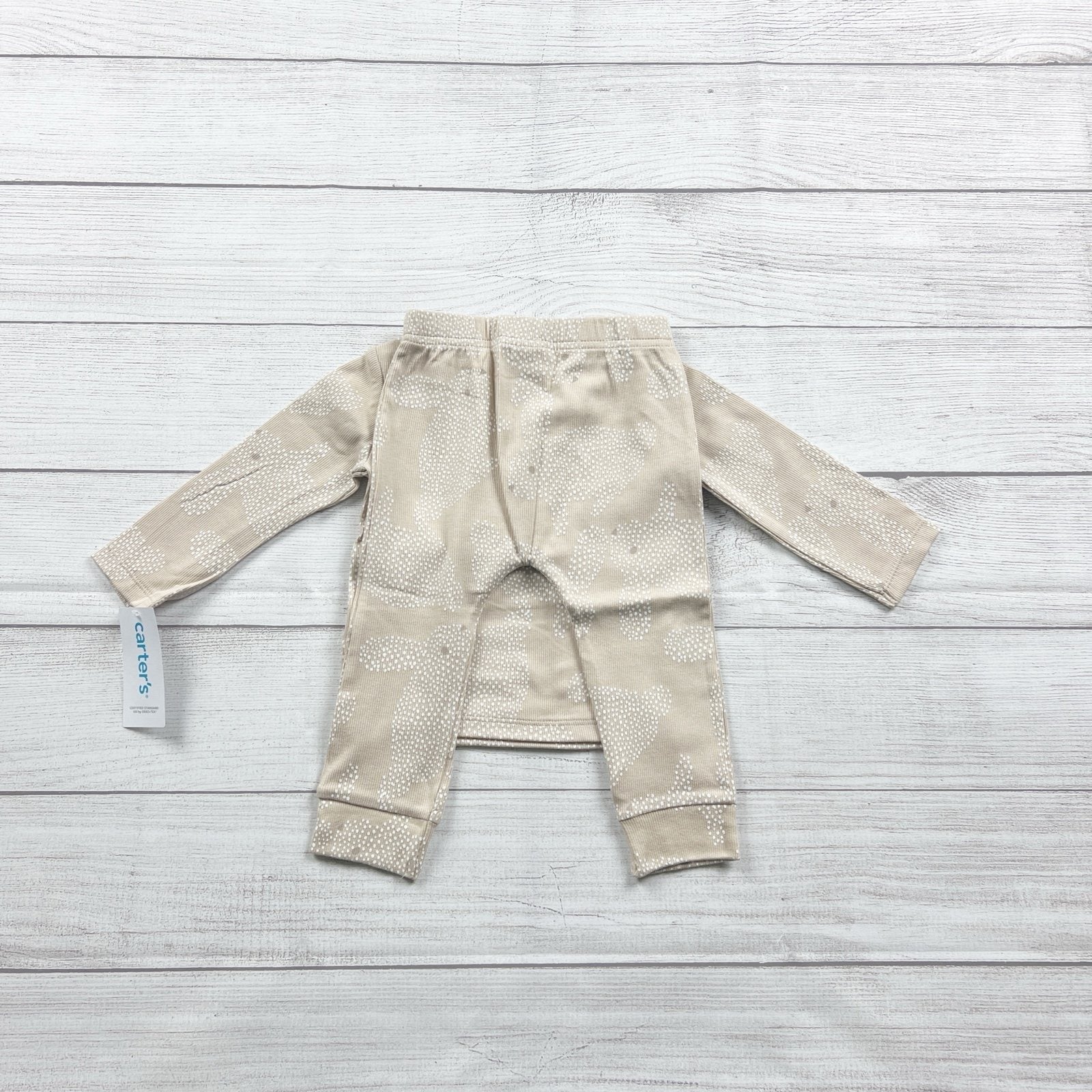 Two piece ribbed long sleeve and pants outfit in tan brown with bunny rabbit print. Button accents. Easter. Cotton blend