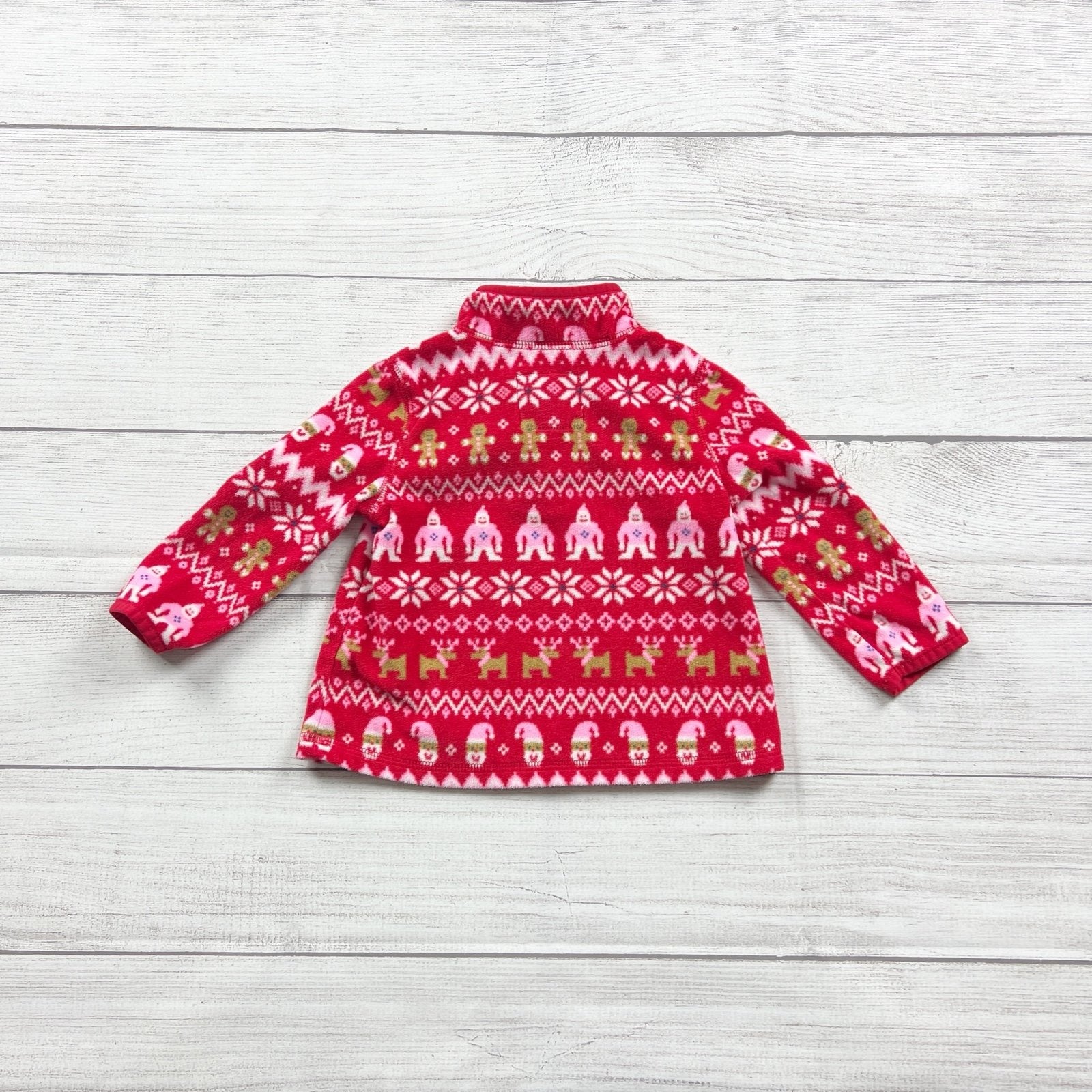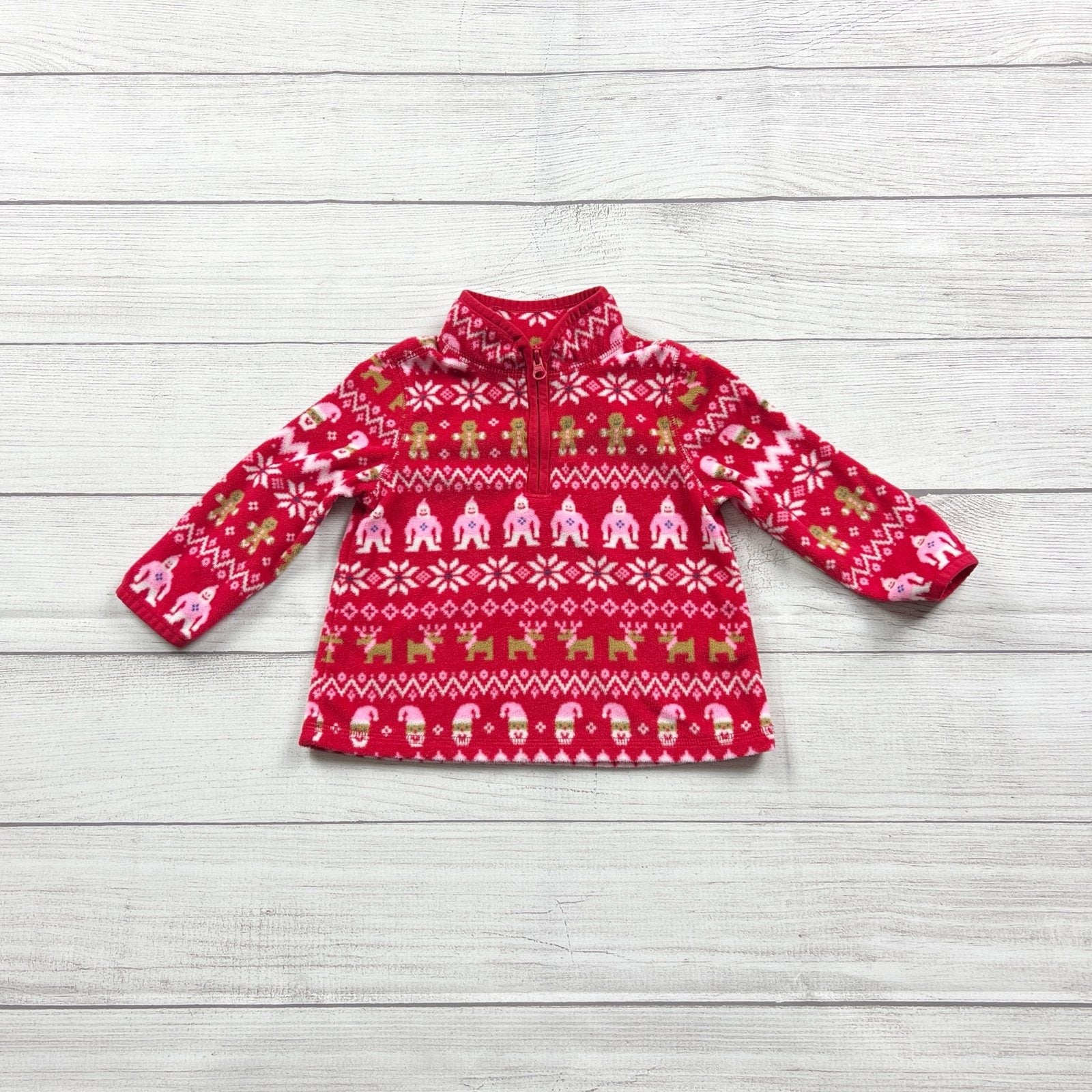 Red long sleeve fleece quarter zip sweatshirt with fairisle holiday print including gingerbread Santa reindeer snow