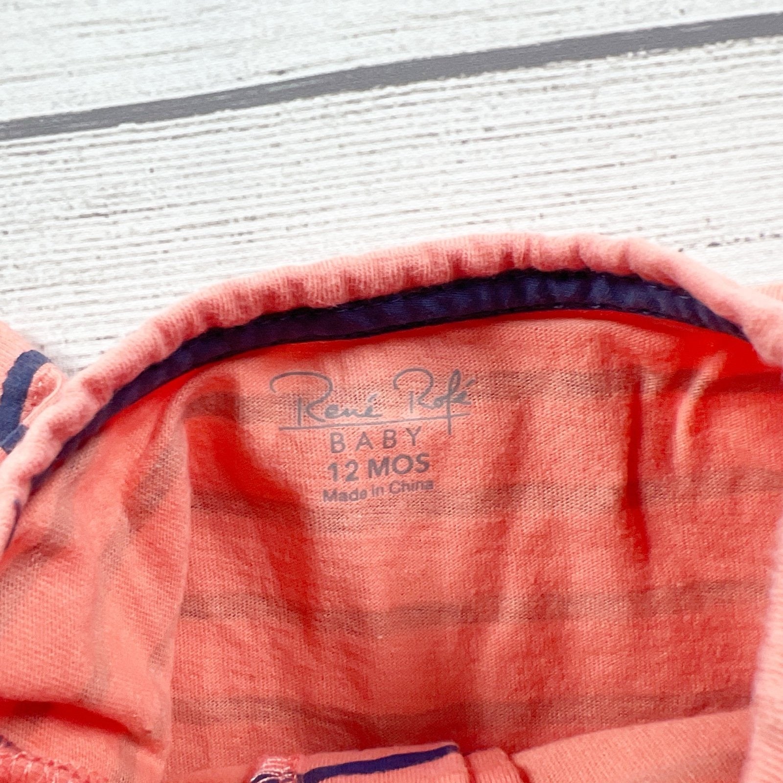 Two piece outfit. Blue and coral salmon Henley short sleeve onesie bodysuit. Solid blue shorts.