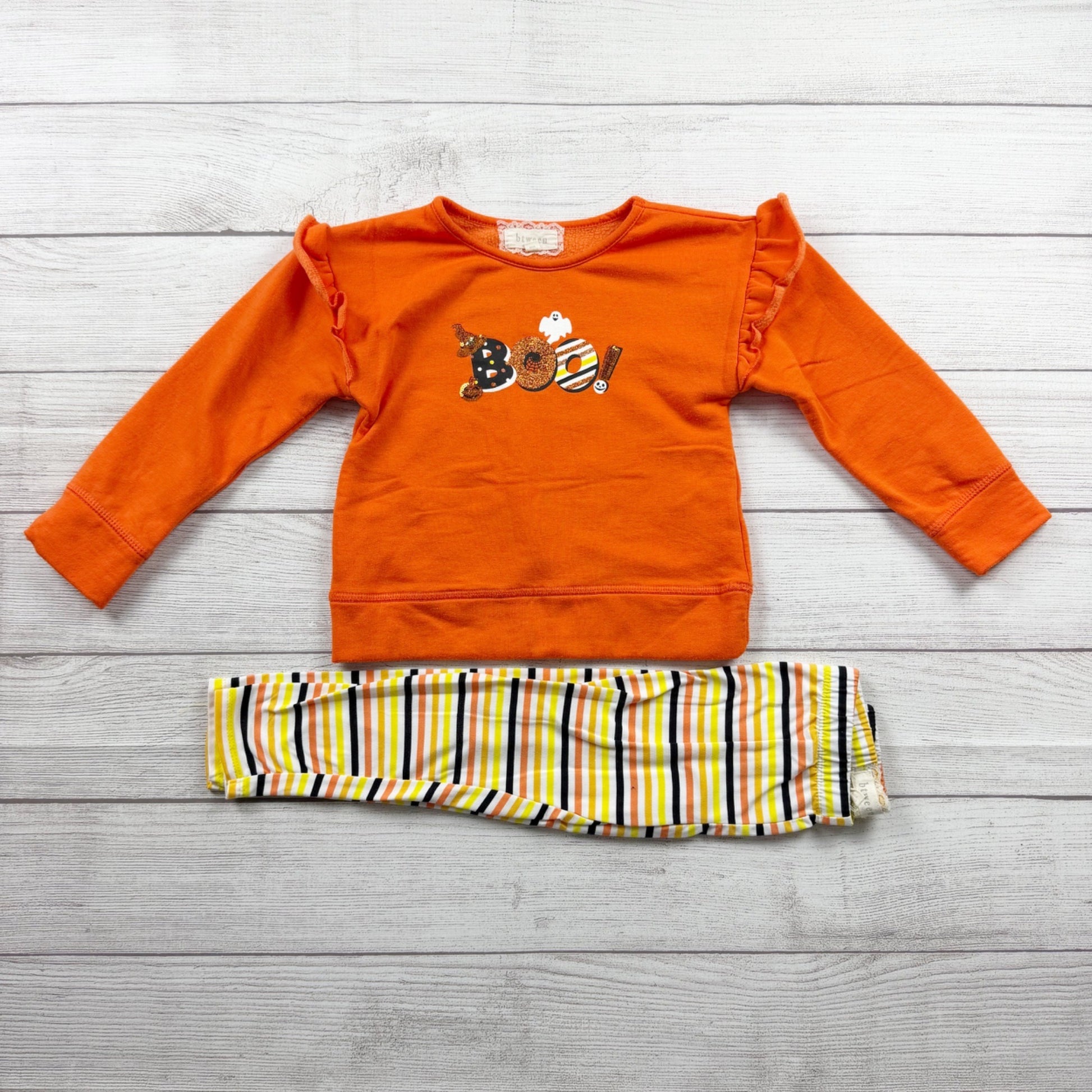 Details: Two-piece set, long-sleeve sweatshirt with ruffled shoulders, "BOO" embroidered graphic with ghost and pumpkin, matching striped leggings, Halloween themed