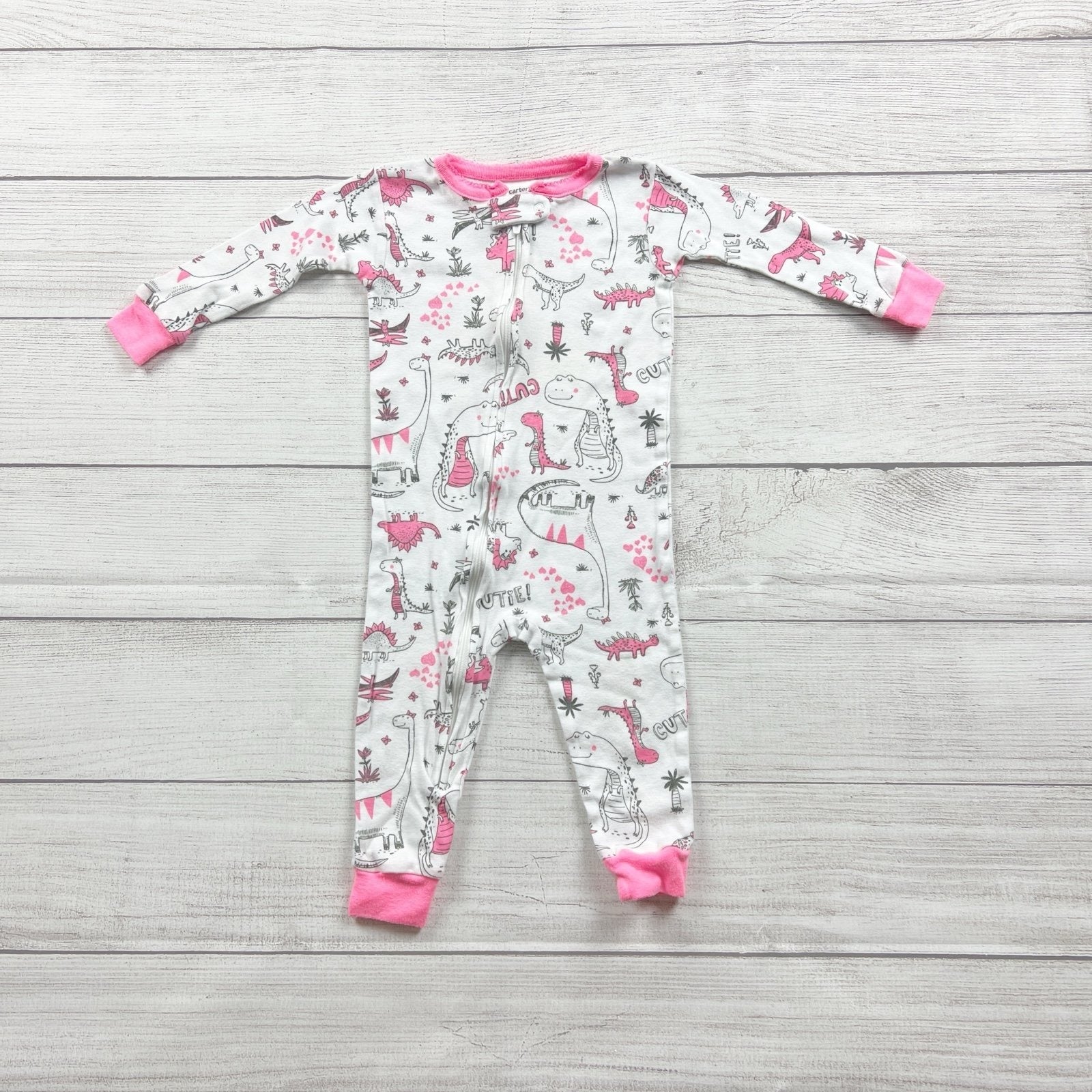 Carter’s baby pajamas, 12 month sleeper, baby girl dinosaur pajamas, footless sleeper 12M, cotton one piece pajamas, pink trim sleeper, toddler girl pajamas 12M, cute dinosaur print pajamas, bedtime outfit baby, gently used baby clothes, sustainable kids clothing, affordable baby pajamas