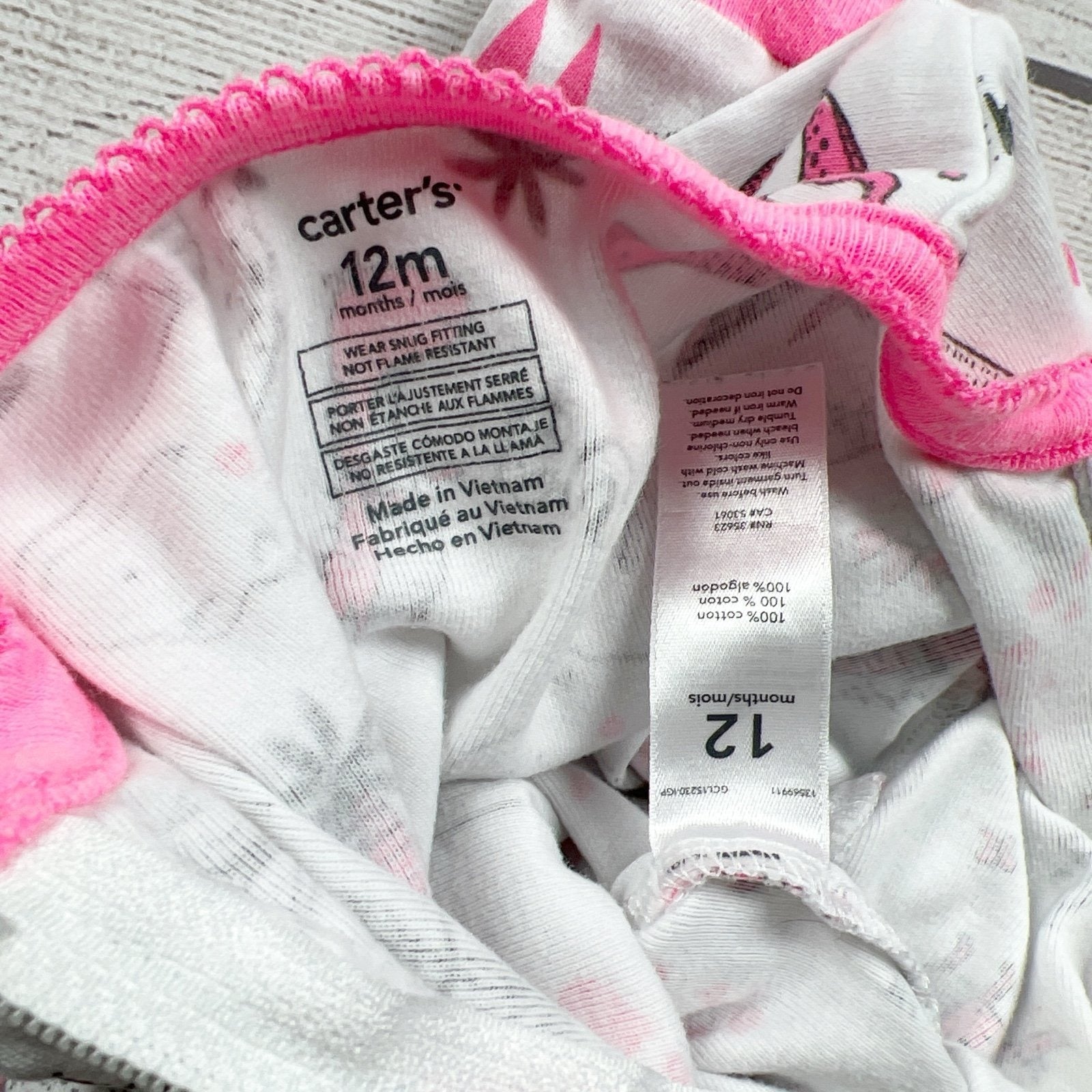 Carter’s baby girl one-piece pajamas in size 12 months featuring a cute dinosaur print on a light background with bright pink trim at the neckline, cuffs, and ankles. Soft 100% cotton with a comfy footless design—great for bedtime, naps, and cozy lounging. Easy one-piece style for quick changes. Gently used in great condition.