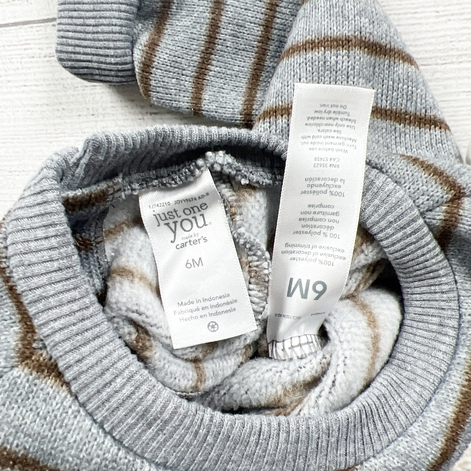 Carter’s Just One You baby one-piece romper in size 6 months featuring a cute gray and brown stripe pattern with an adorable bear face design on the front and plush bear ears on the shoulders. Soft cozy knit with long sleeves and cuffed ankles—perfect for cooler weather, lounging, and everyday outfits. Easy one-piece style for quick changes. Gently used in great condition.