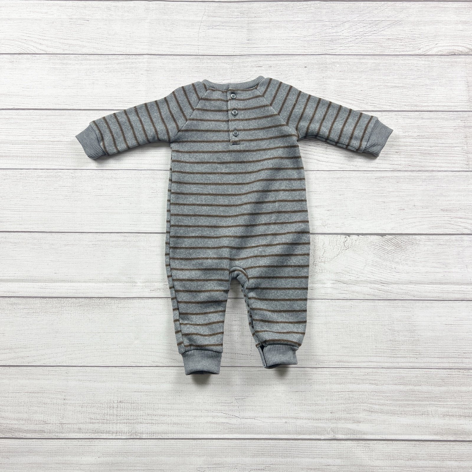 Carter’s baby romper, Just One You Carter’s, 6 month romper, bear romper baby, striped baby one piece, gray brown baby outfit, long sleeve baby romper, cozy baby outfit, cute animal romper baby, gently used baby clothes, sustainable kids clothing, affordable baby outfit