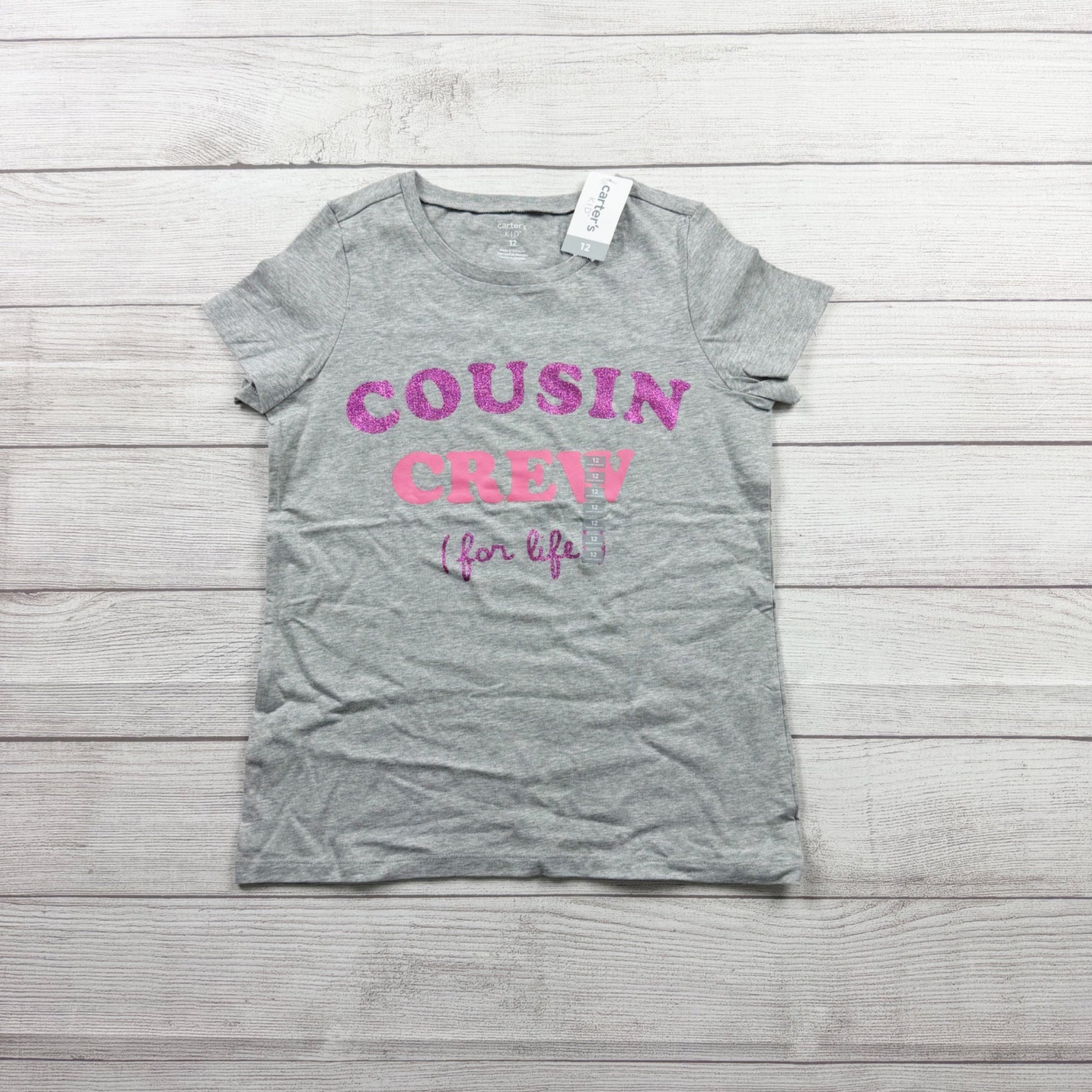 Carter's Kids girls short sleeve t-shirt in size 12 featuring a heather gray color with a fun "Cousin Crew for Life" graphic in pink and glitter lettering. Soft 100% cotton with a crew neckline and comfortable everyday fit. Perfect for family gatherings, cousin playdates, and casual wear. New with tags, great gift for girls who love their cousins!