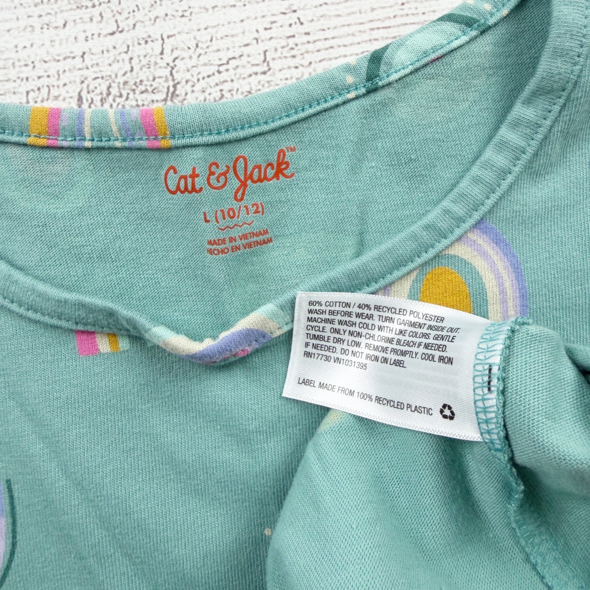 Cat & Jack girls short sleeve knit dress in size L (10/12). Soft green dress with an allover rainbow print in pastel colors. Features a comfy crewneck, gathered waist, and side pockets. Made from a soft cotton blend with recycled polyester for easy everyday wear, school, and play. Gently used condition.